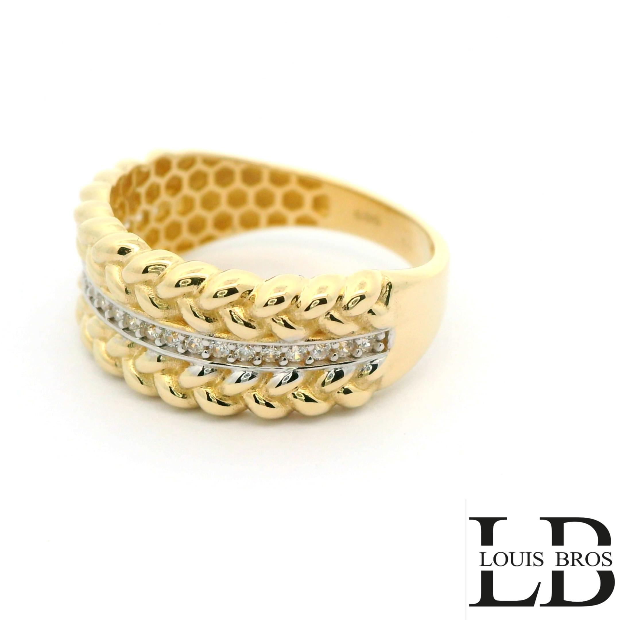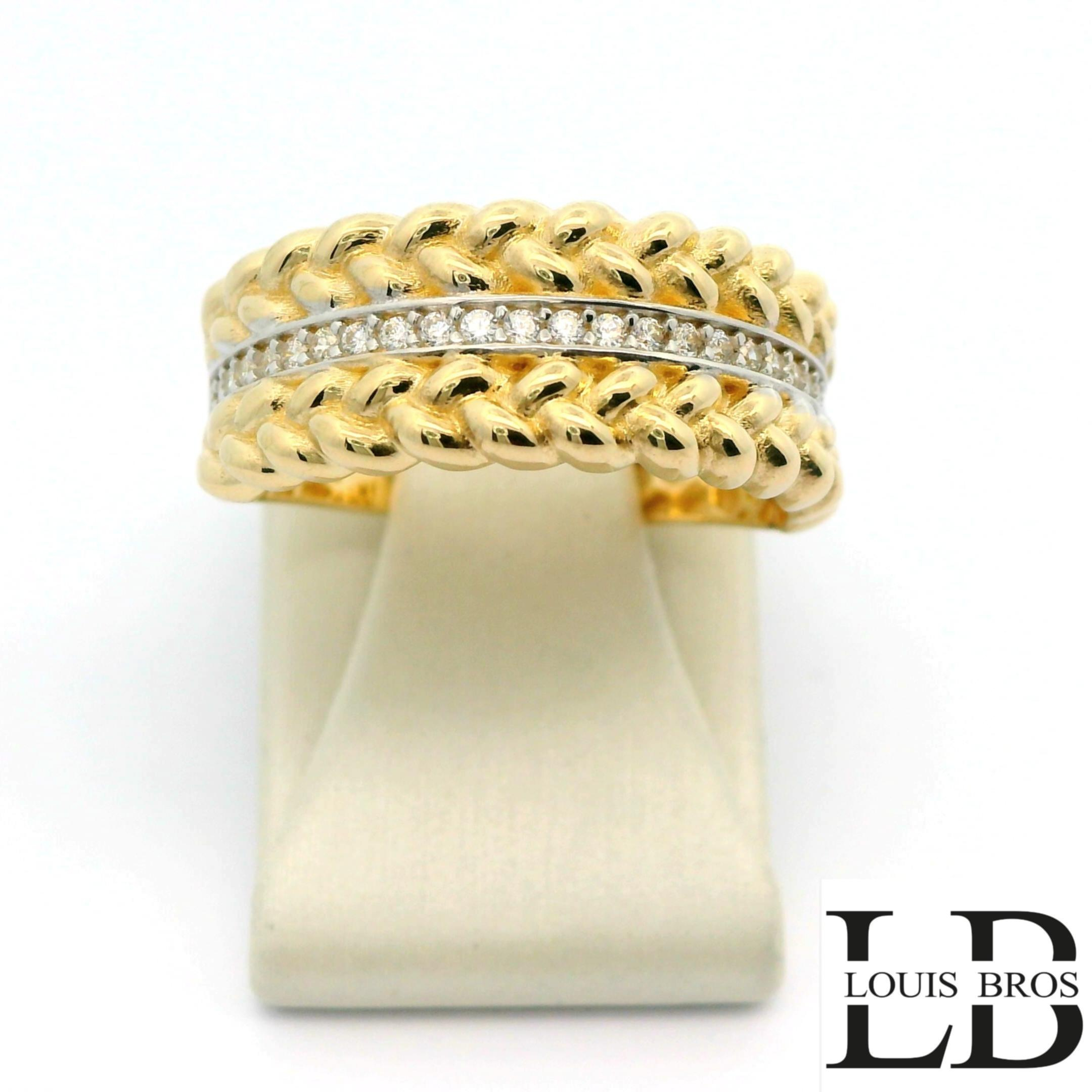 Deze elegante ring is vervaardigd uit 14 karaat bicolor goud (2.87 gr), een stijlvolle combinatie van wit- en geelgoud. Het tijdloze ontwerp wordt verfraaid met sprankelende zirkonia’s, die de ring een luxe en verfijnde uitstraling geven. Dankzij de subtiele glans en het contrasterende kleurenspel van het goud is dit sieraad zowel modern als klassiek, en geschikt voor iedere gelegenheid.