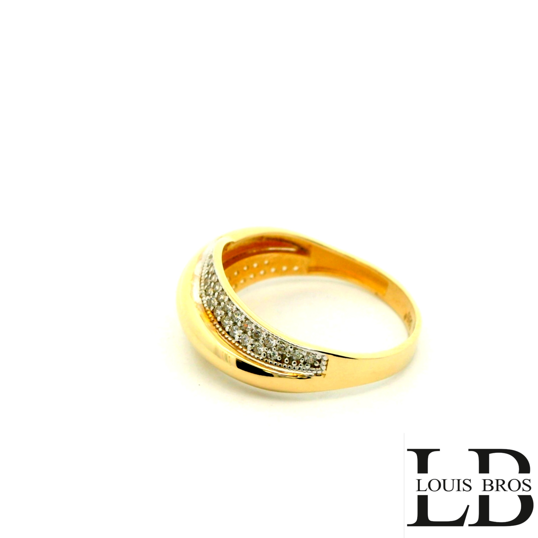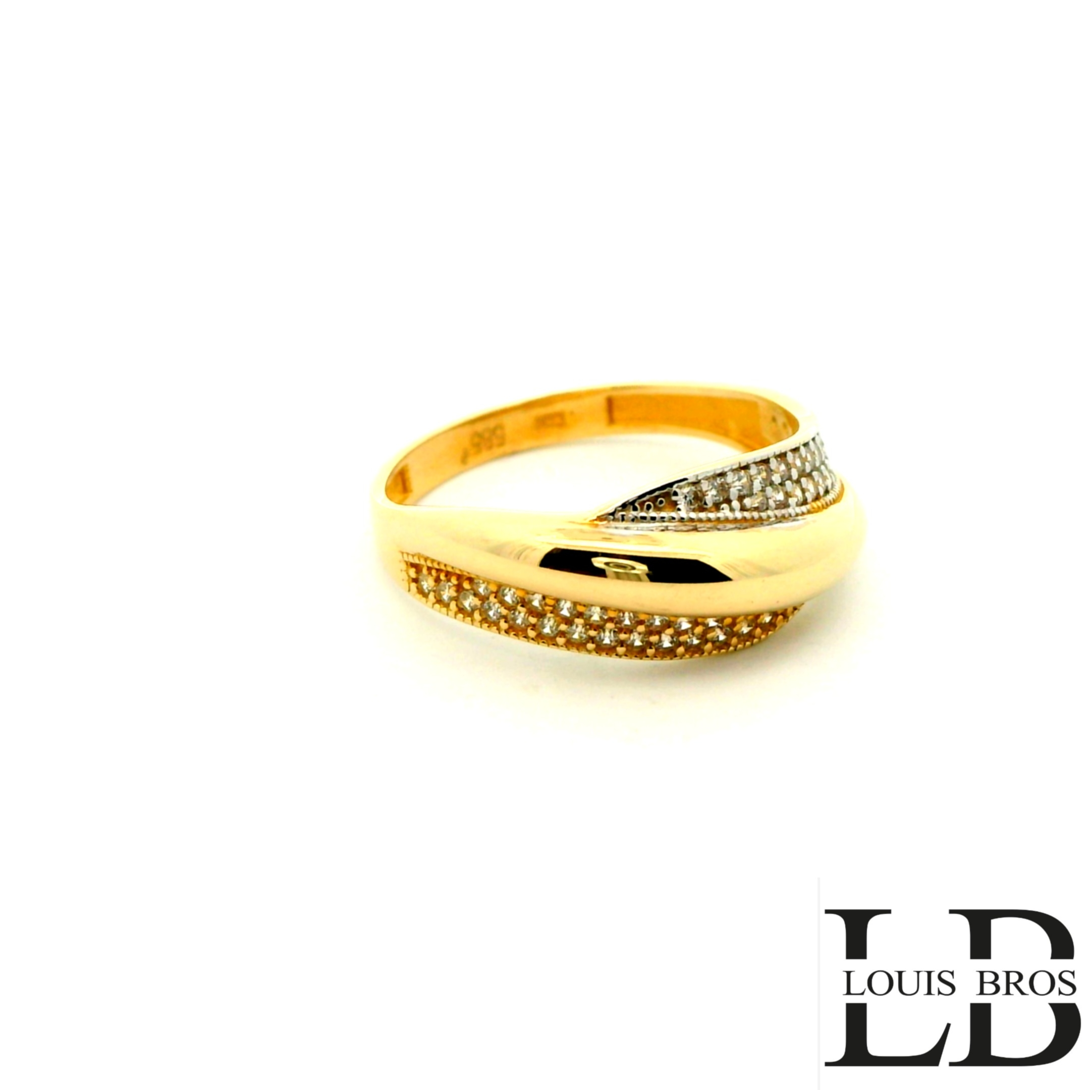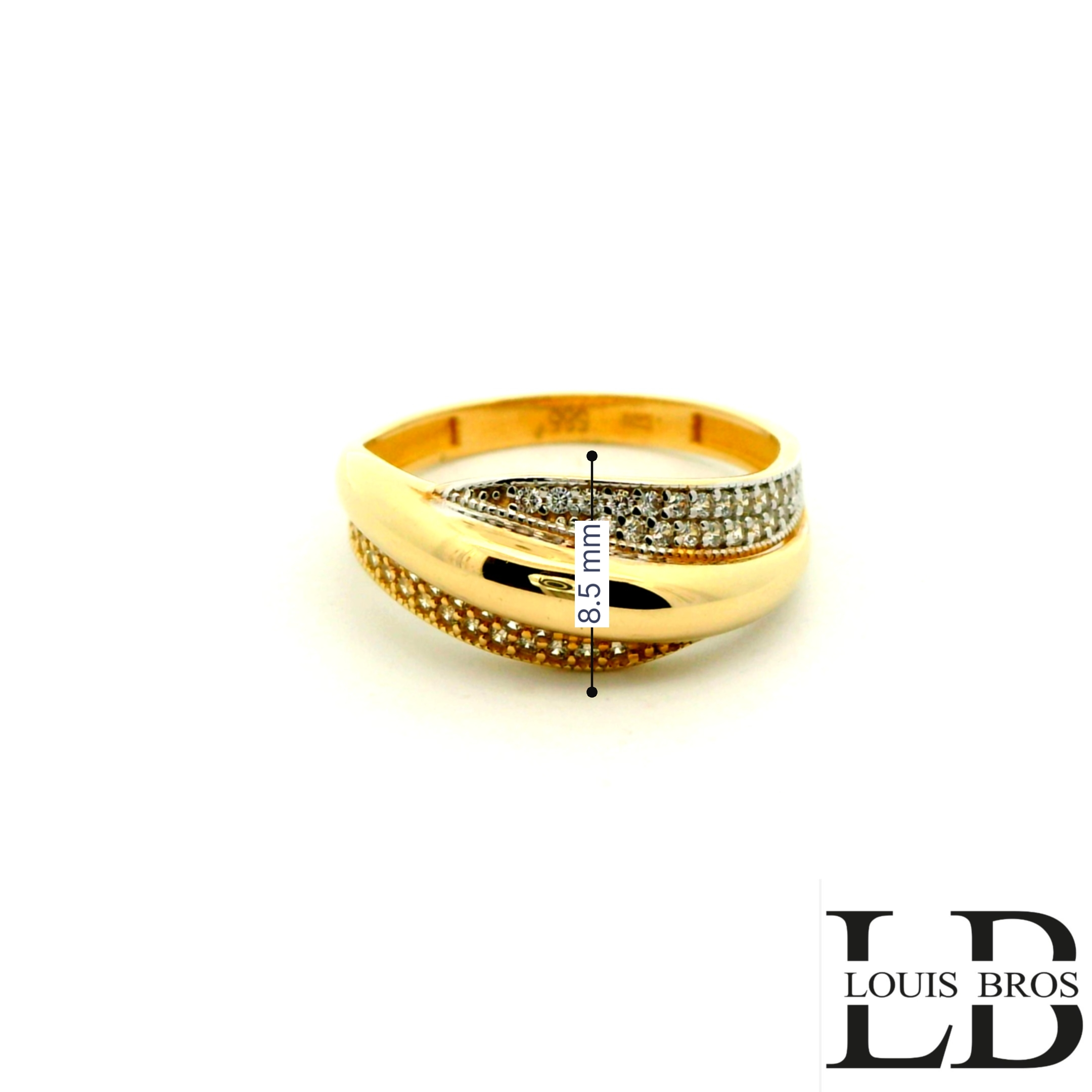 Deze verfijnde damesring is vervaardigd uit 14 karaat bicolor goud (2.49 gr), een harmonieuze combinatie van geelgoud en witgoud. De ring is bezet met fonkelende zirkonia’s, die het licht op een prachtige manier weerkaatsen en de ring een luxueuze uitstraling geven zonder te overheersen.