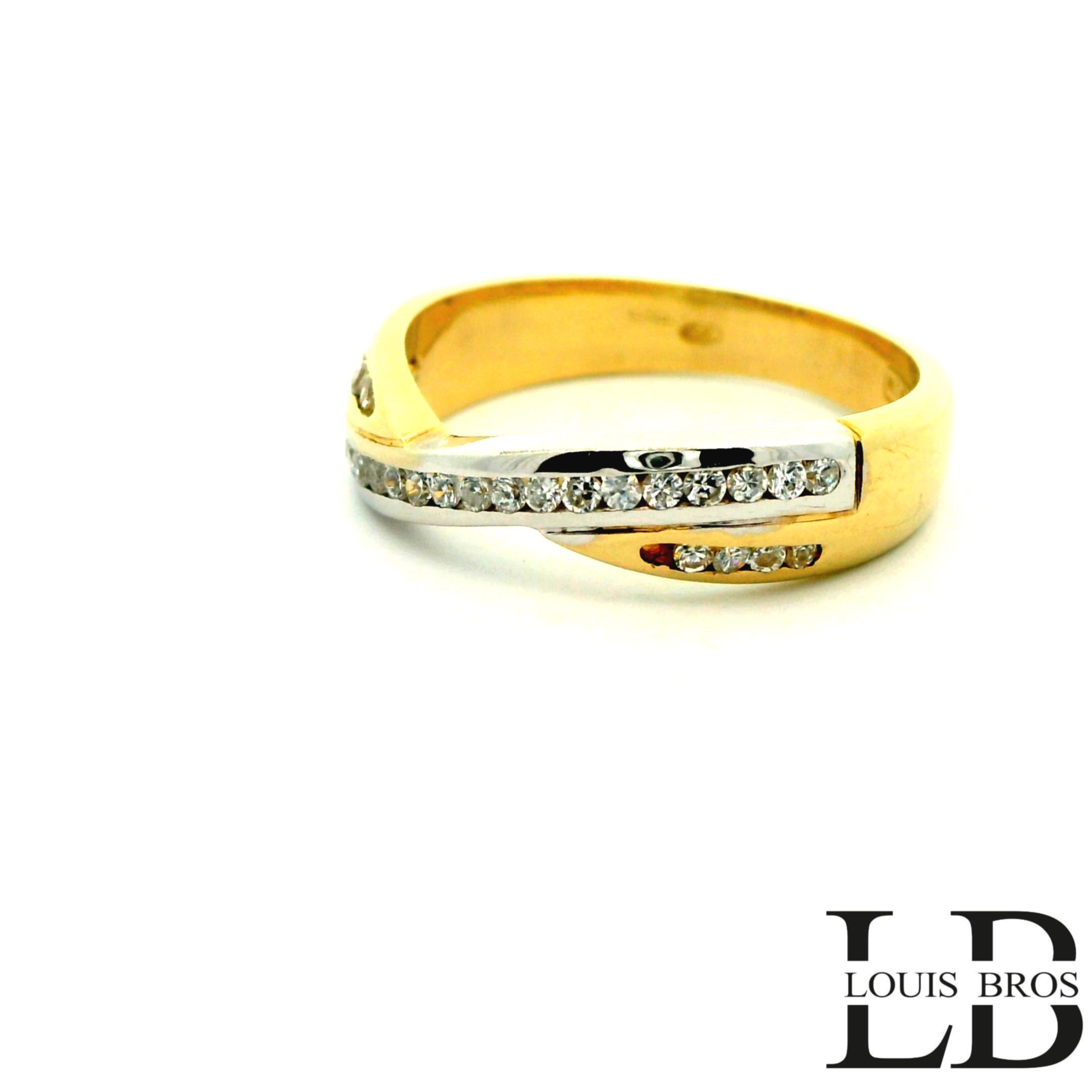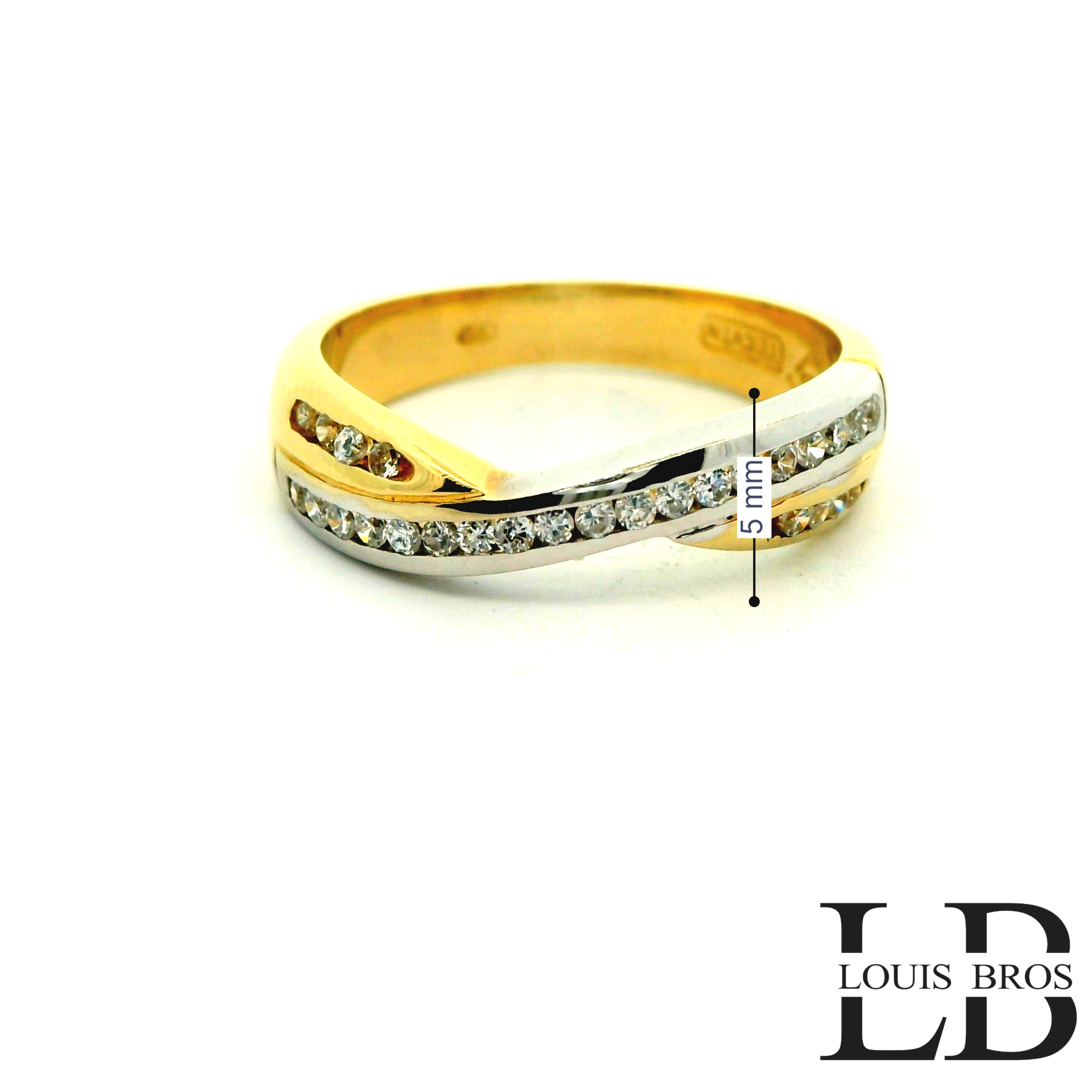 Deze prachtige bicolor ring van 14 karaat goud (4.14 gr) combineert het beste van twee werelden: het warme geelgoud en het elegante witgoud. De subtiele samensmelting van beide kleuren zorgt voor een tijdloze en moderne uitstraling. In het midden schitteren fijn gezette zirkonias, die de ring een luxueuze glans en verfijnde uitstraling geven.
