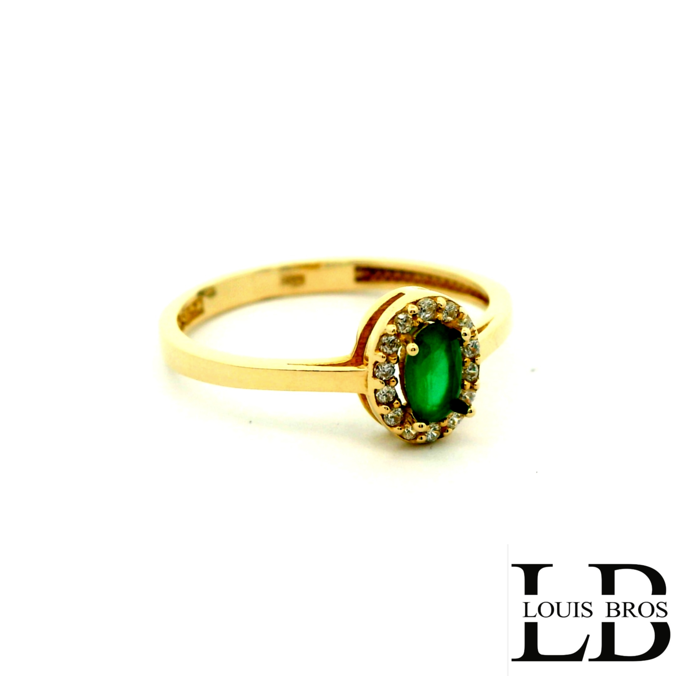 Deze verfijnde damesring is vervaardigd uit 14 karaat geelgoud (1.48 gr) en straalt een tijdloze elegantie uit. In het middelpunt schittert een ovale groene zirkonia, omringd door sprankelende witte zirkonia’s die de ring een luxueuze en levendige uitstraling geven.