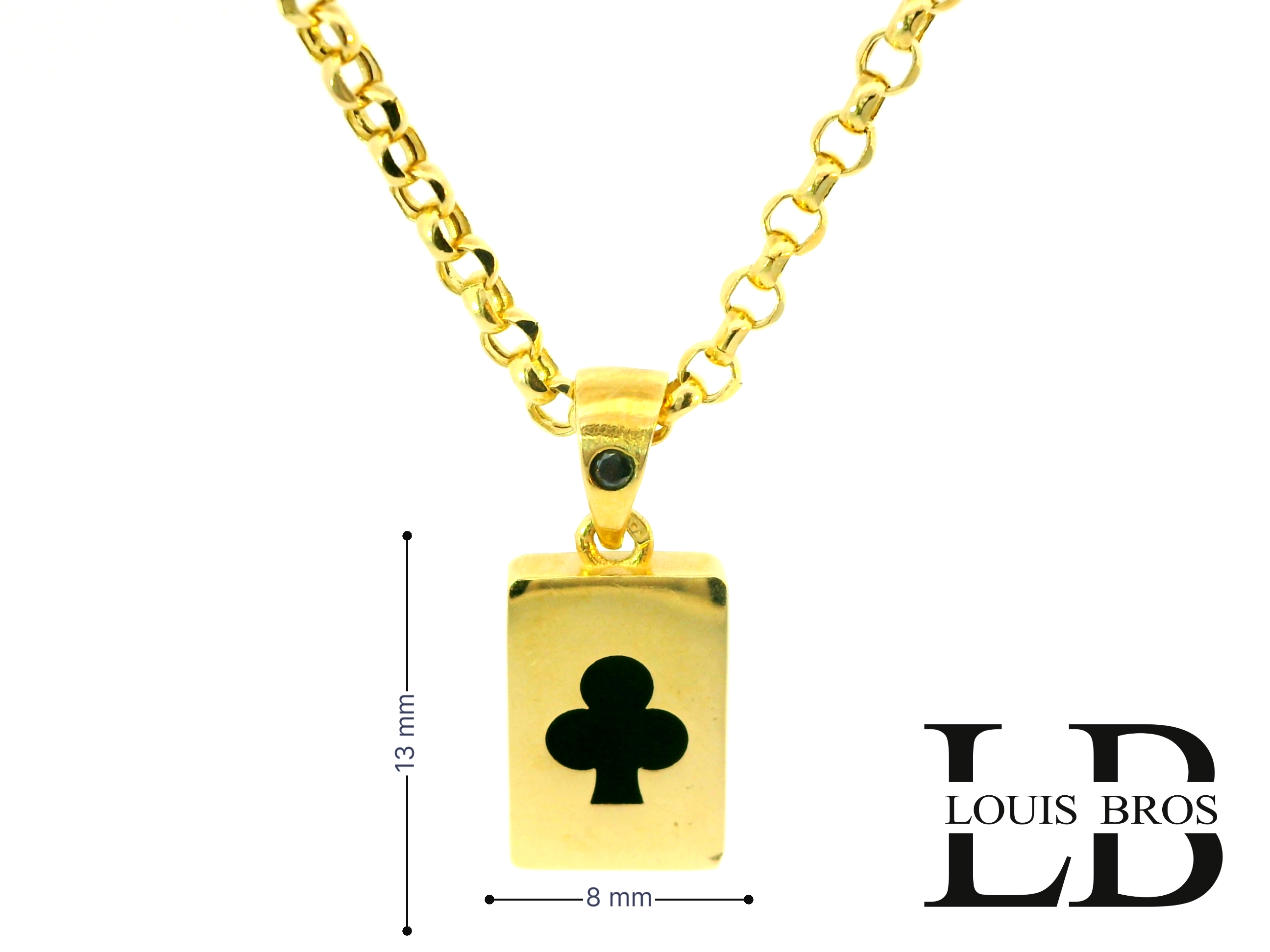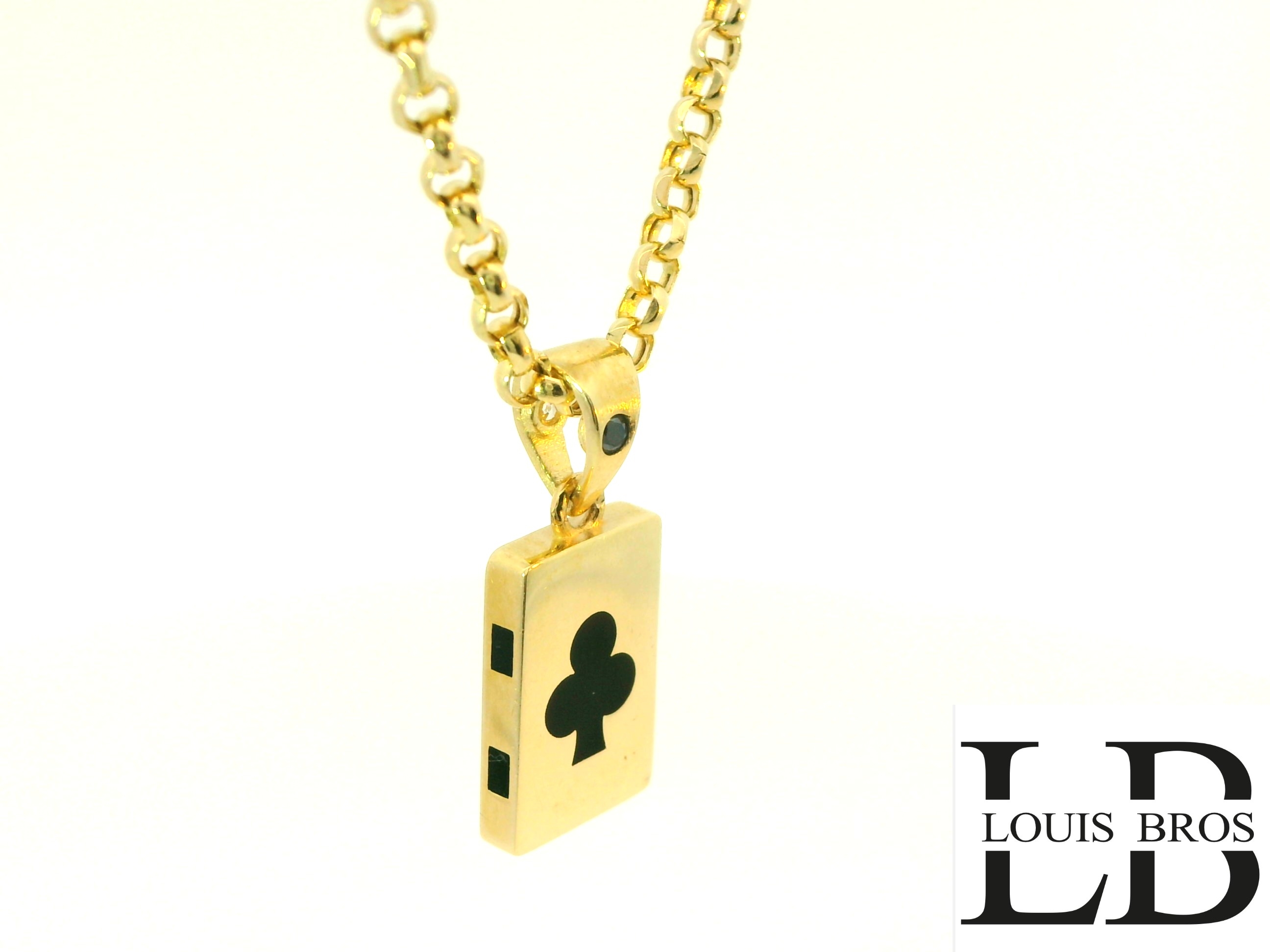 Voeg een uniek statement toe aan je sieradencollectie met deze stijlvolle 14 karaat geelgouden hanger (1.83 gr) van Louis Bros. Het ontwerp is geïnspireerd op de klassieke speelkaart en toont het klaveren (clubs) symbool in diepzwart op een rechthoekige, glanzende plaat. De hanger is vervaardigd van hoogwaardig 14 karaat geelgoud, wat garant staat voor zowel luxe als duurzaamheid.