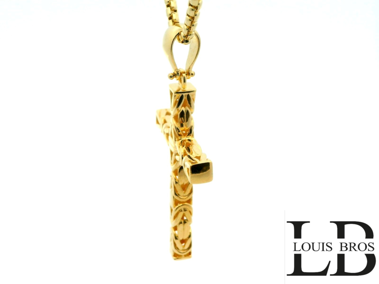 Deze prachtige kruishanger is vervaardigd uit hoogwaardig 14 karaat geelgoud (5.84 gr) en straalt een krachtige combinatie van geloof, vakmanschap en stijl uit. Het ontwerp is verfijnd afgewerkt met een gedetailleerde gravure, wat het sieraad een unieke en karaktervolle uitstraling geeft.