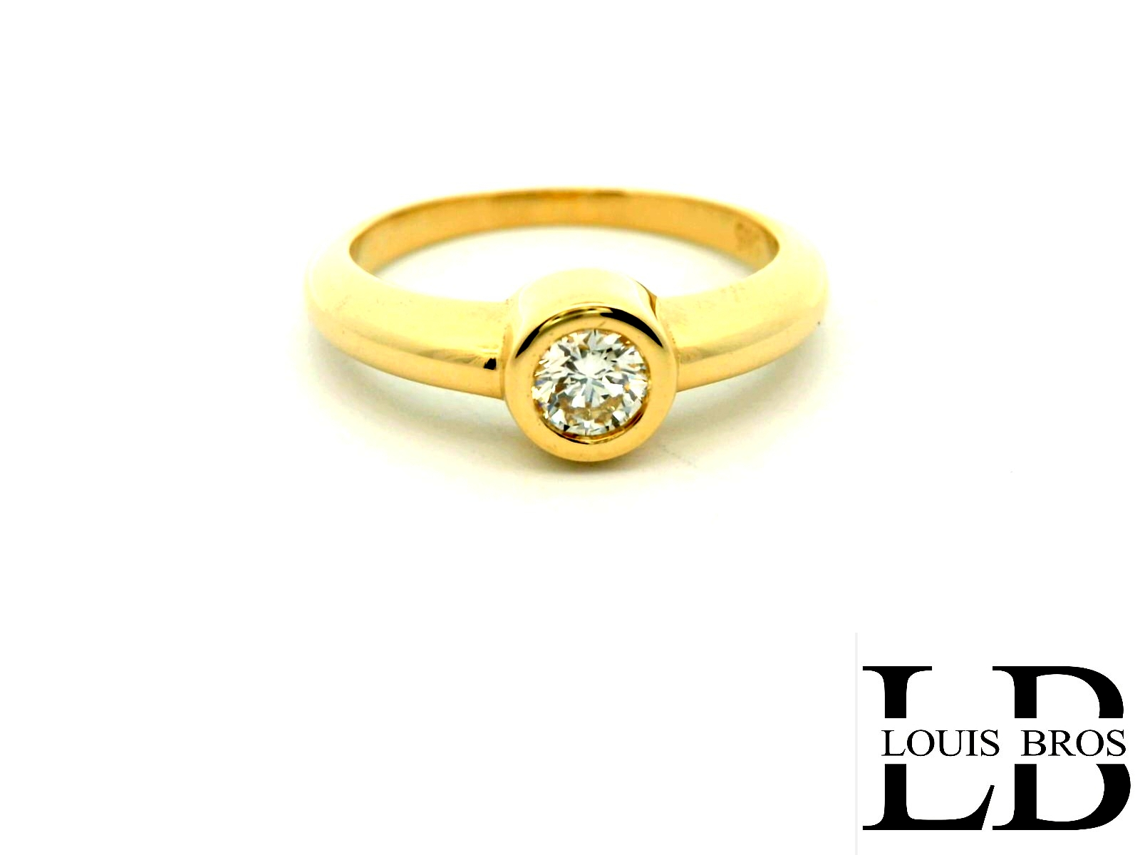 Deze schitterende ring is vervaardigd uit 14 karaat geelgoud (4.47 gr) en bezet met een prachtige briljant geslepen diamant. De diamant is stevig en stijlvol geplaatst in een gladde chatonzetting (bezel setting), waardoor de steen optimaal tot zijn recht komt en tegelijkertijd goed beschermd is.