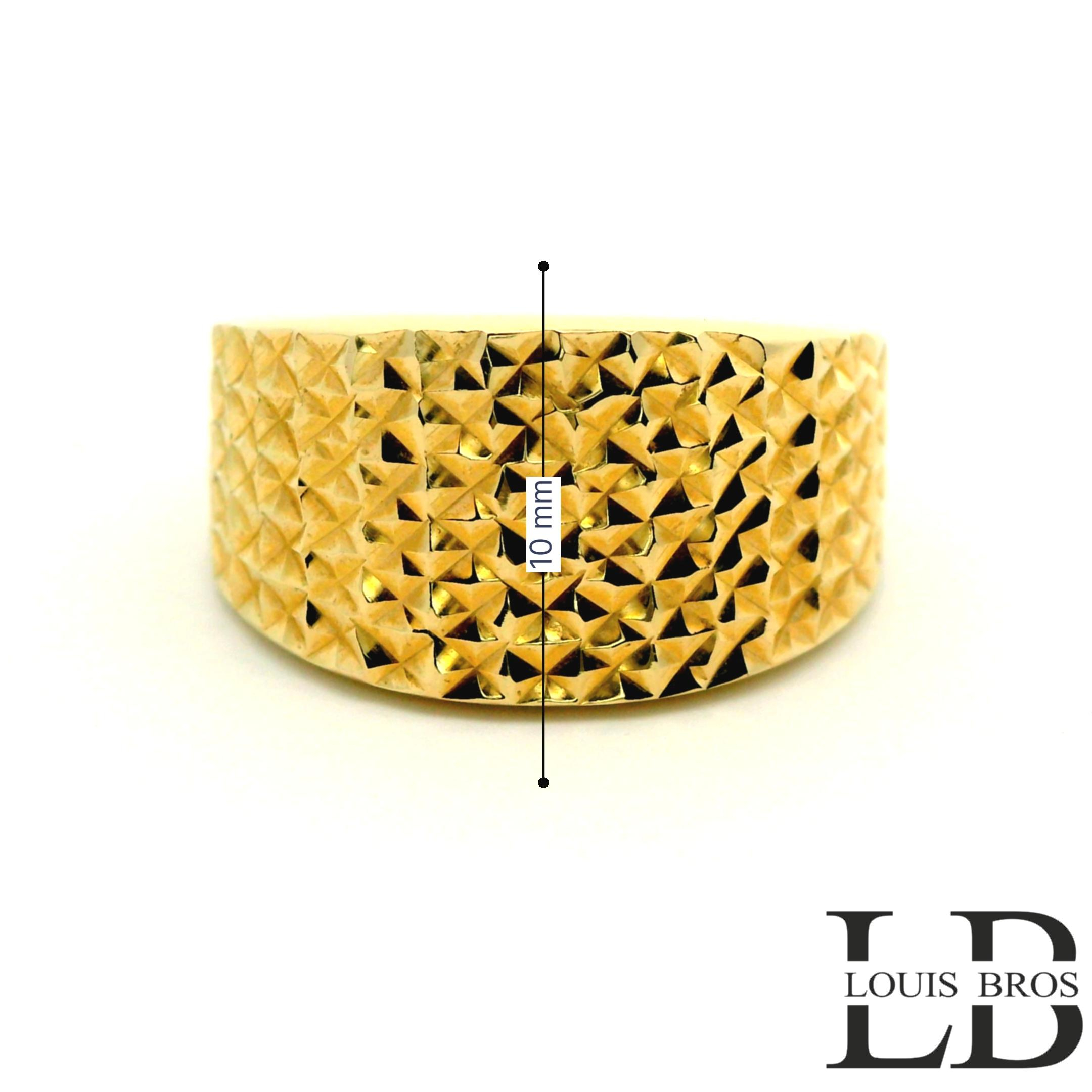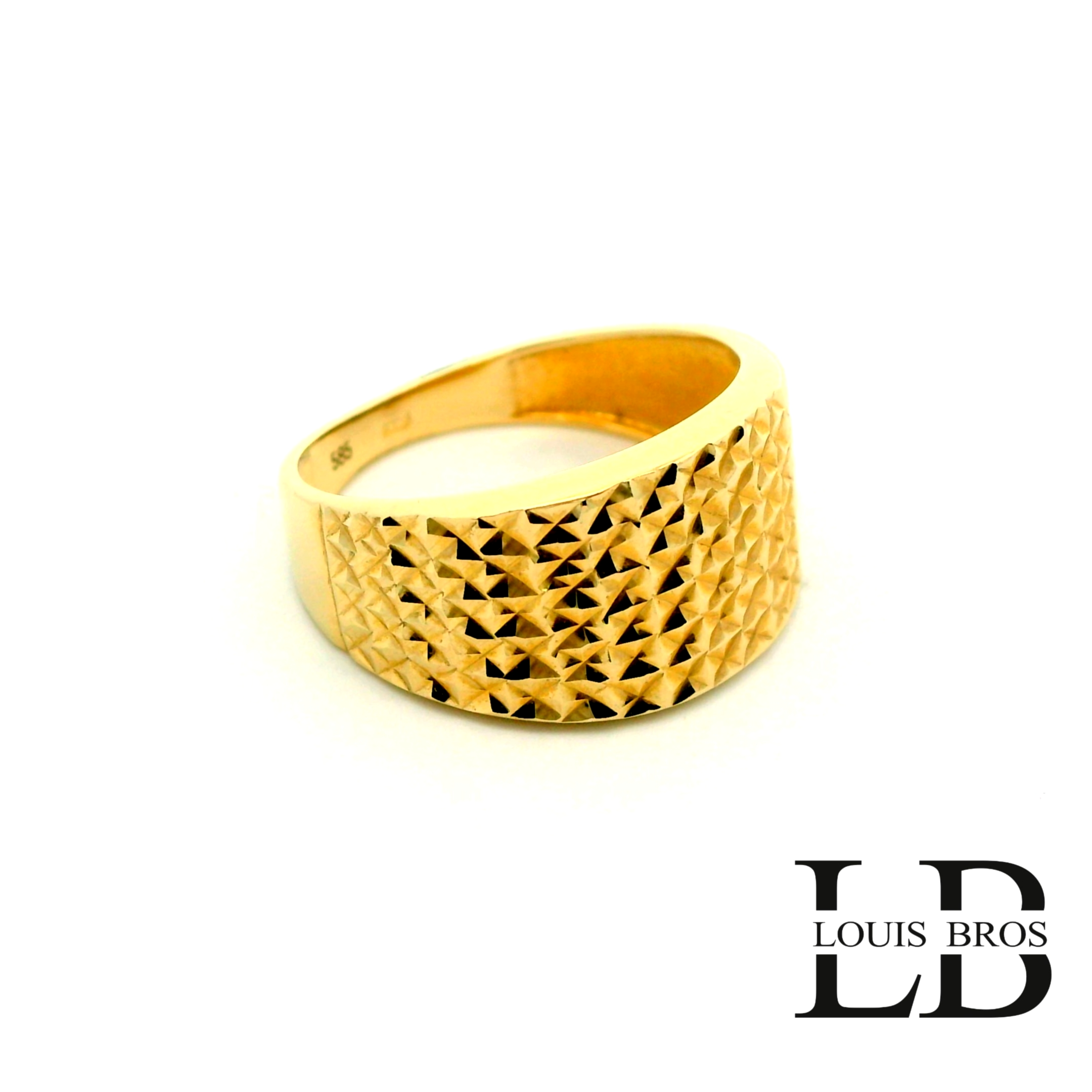 Deze stijlvolle geelgouden ring van 14 karaat (2.26 gr) heeft een krachtig en verfijnd karakter. De brede band is voorzien van een schitterende diamantgeslepen structuur met geometrische facetten, die het licht op speelse wijze reflecteren en zorgen voor een rijke, sprankelende uitstraling. Het ambachtelijke reliëf geeft de ring diepte en luxe, terwijl het tijdloze ontwerp geschikt is voor zowel dagelijks gebruik als bijzondere gelegenheden. Een elegante ring met een moderne uitstraling en een duidelijke aanwezigheid.