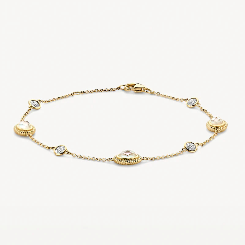 Deze prachtige hanger is gemaakt van 14k geelgoud en heeft een dubbele laag van mother of pearl, rock crystal en zirkonia. Het is een uniek en elegant sieraad dat perfect is voor elke gelegenheid. Draag het aan een gouden ketting voor een glamoureuze look of combineer het met andere hangers voor een trendy layered effect. Een absolute must-have voor elke moderne vrouw!