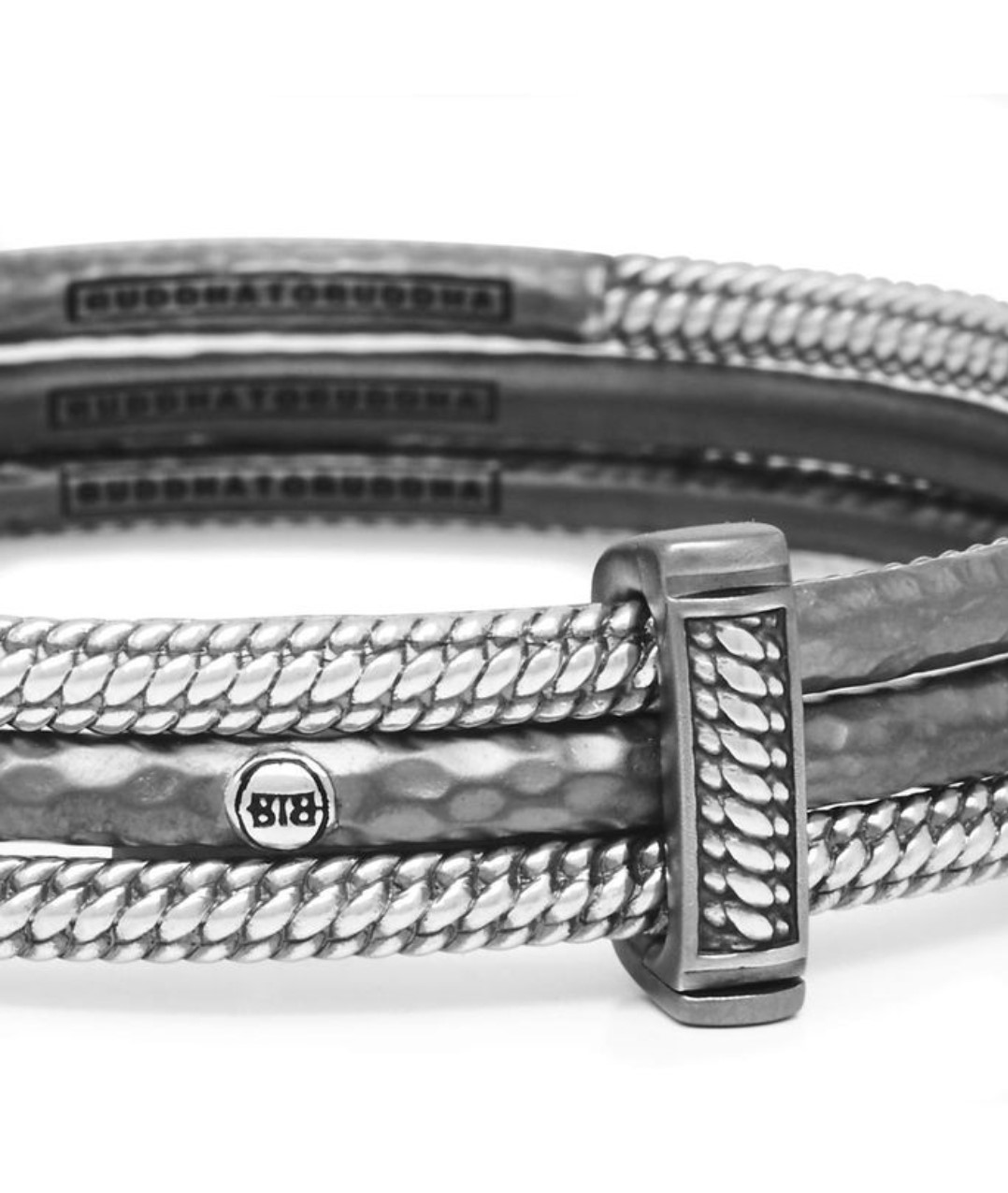 De Dunia Bersama set bestaat uit drie bangle armbanden vervaardigd uit 925 sterling zilver. Het design is gebaseerd op onze iconische Ben schakel en afgewisseld met geoxideerde en gehamerde structuren. De set komt met een slot waarmee de bangles aan elkaar vast gedragen kunnen worden.