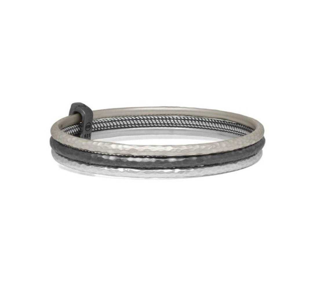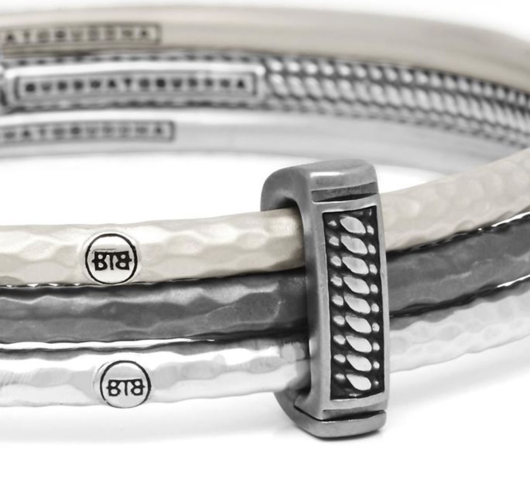 De Dunia Satu set bestaat uit drie bangle armbanden vervaardigd uit 925 sterling zilver. Het design is gebaseerd op onze iconische Ben schakel, afgewisseld met geoxideerde en gehamerde structuren. De set komt met een slot waarmee de bangles aan elkaar vast gedragen kunnen worden.