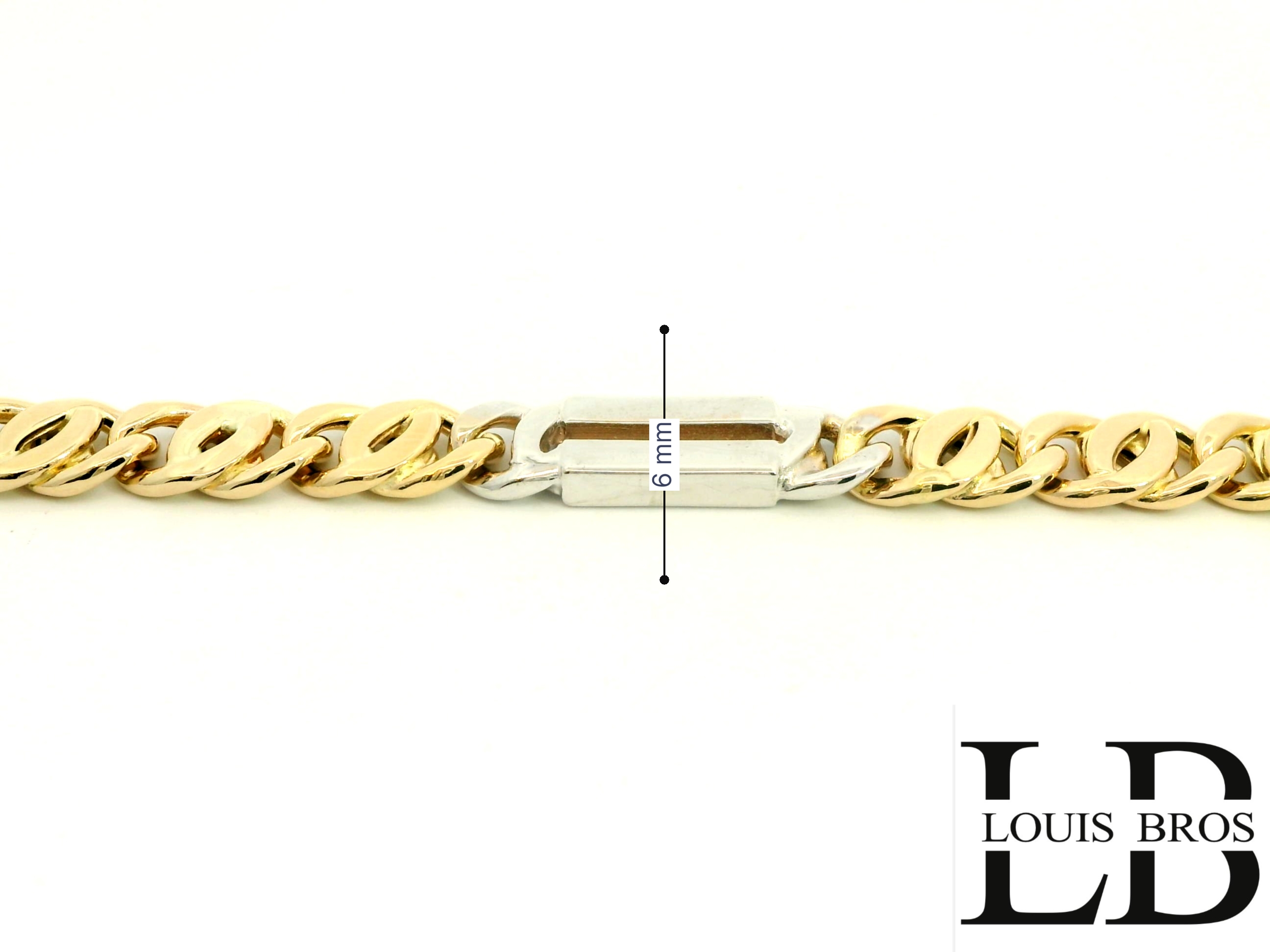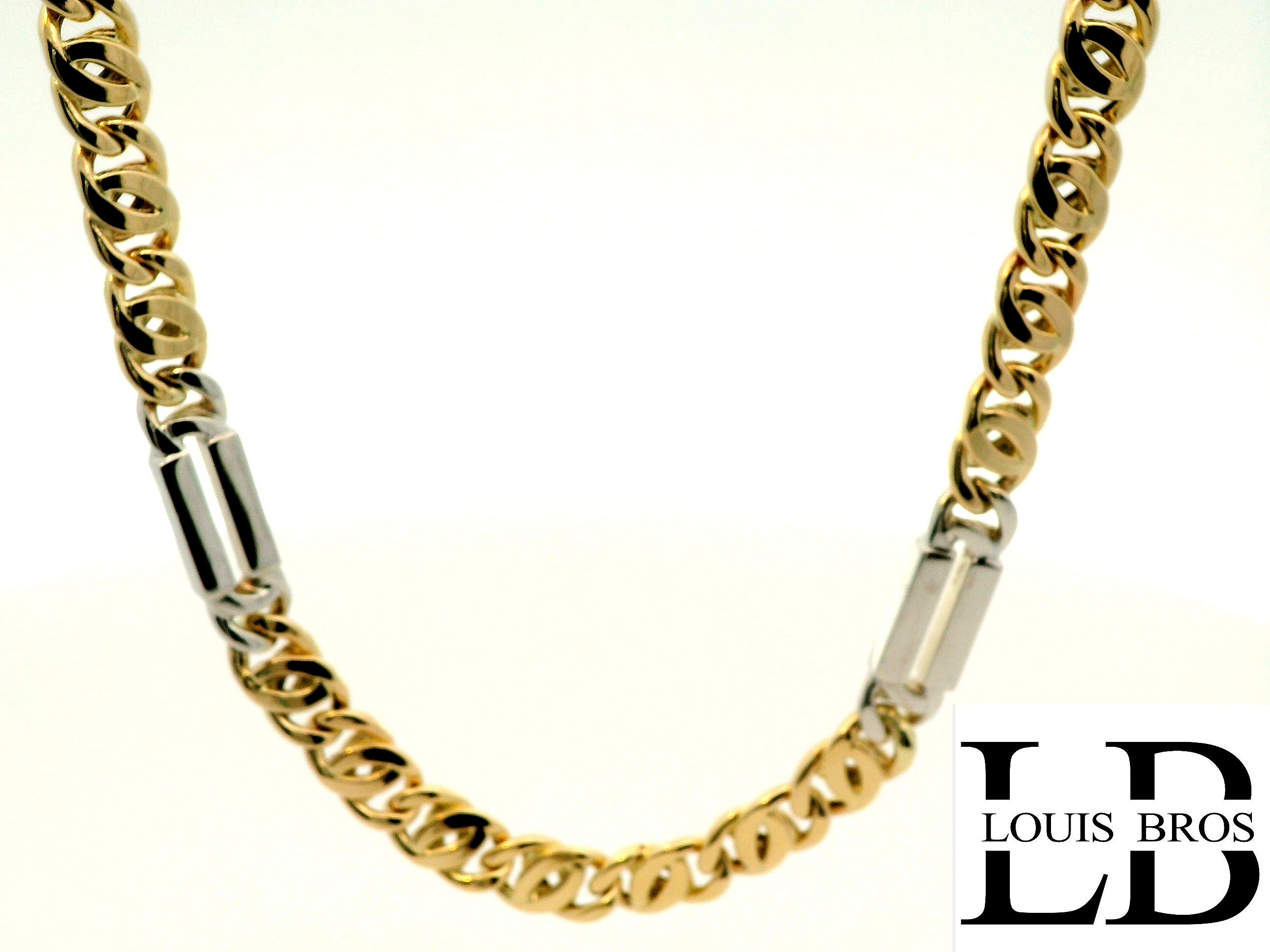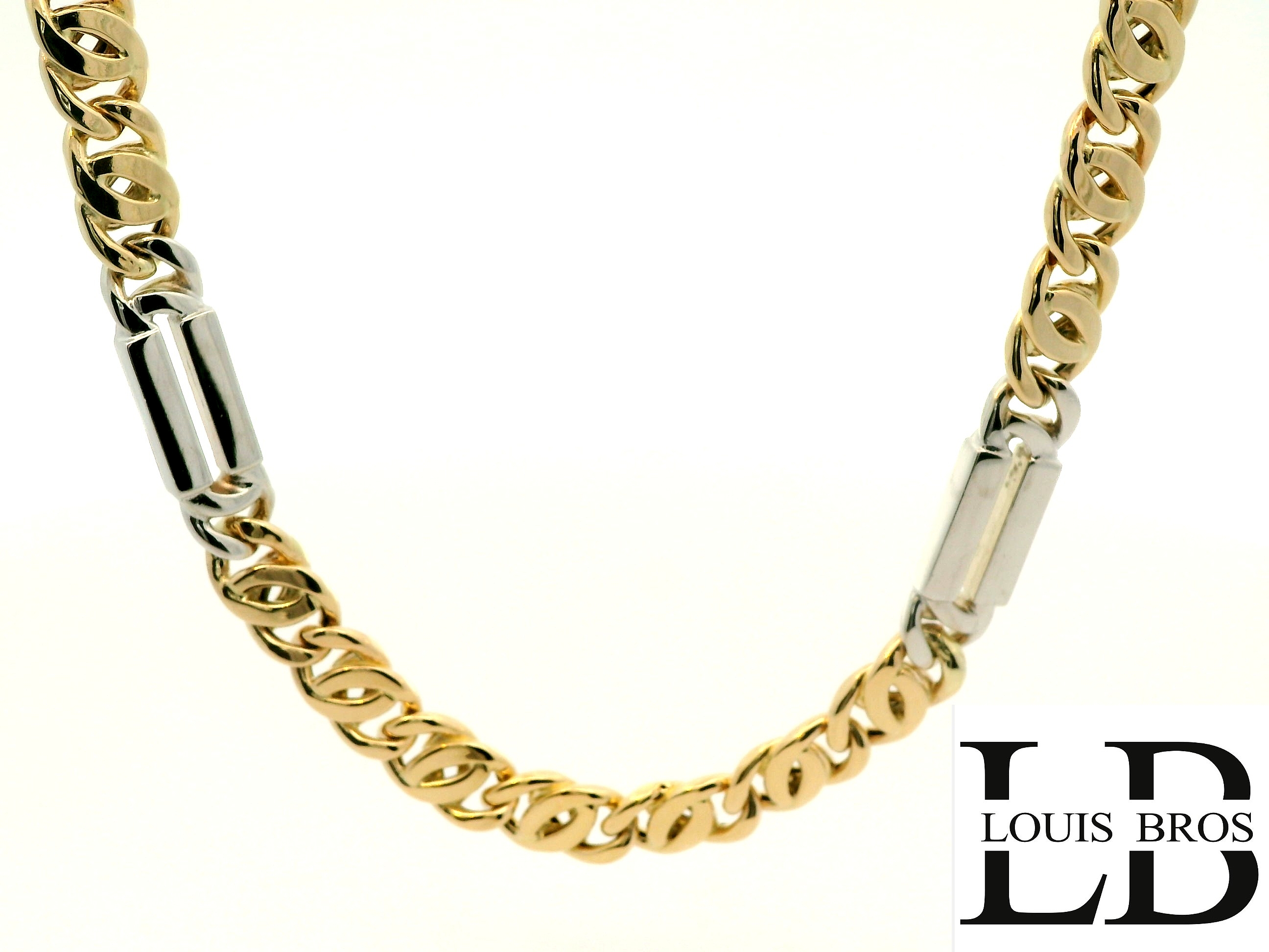 Dit stijlvolle heren collier van Louis Bros is een verfijnd sieraad dat luxe en moderniteit combineert. Het collier is vervaardigd uit 14 karaat goud (34.30 gr) en uitgevoerd in een bicolor design, waarbij geelgoud en witgoud op elegante wijze worden afgewisseld.