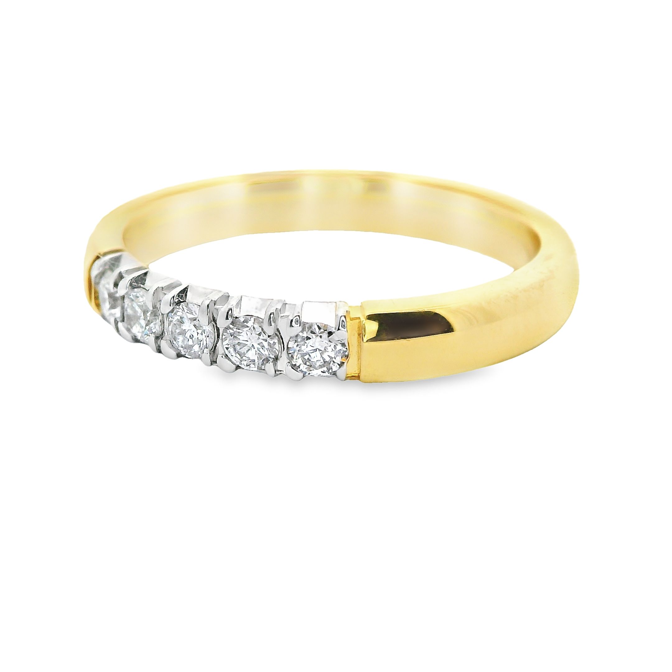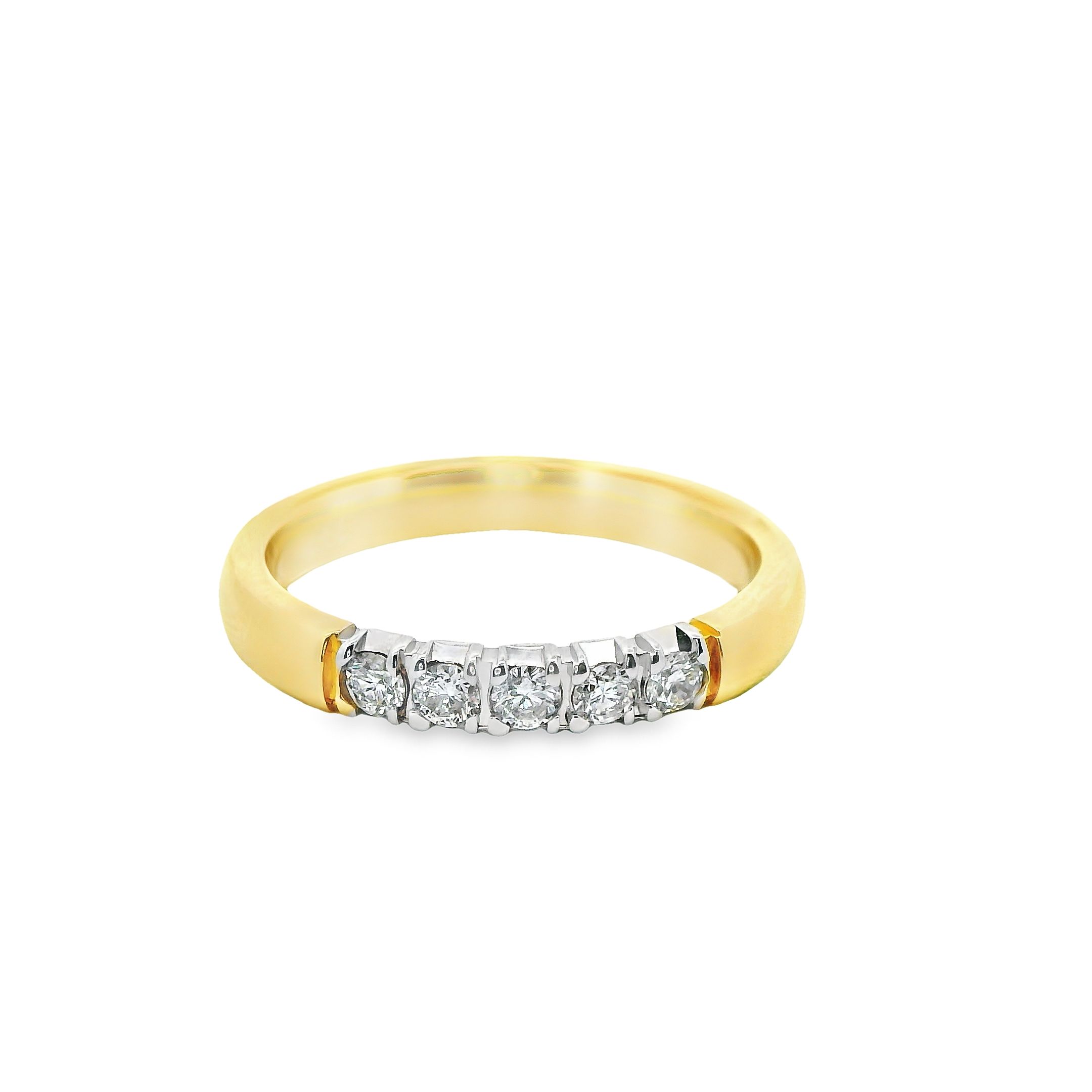 Deze ring van Louis Bros is vervaardigd uit 14 karaat bicolor (4 gr.) en is gezet met 5 briljant geslepen diamanten met een totaalgewicht van 0.25ct. De ring heeft een breedte van 3 mm en een dikte van 2 mm. Deze ring bestaat uit onze lijn van exclusieve modellen sieraden met prachtige designs van hoge kwaliteit.