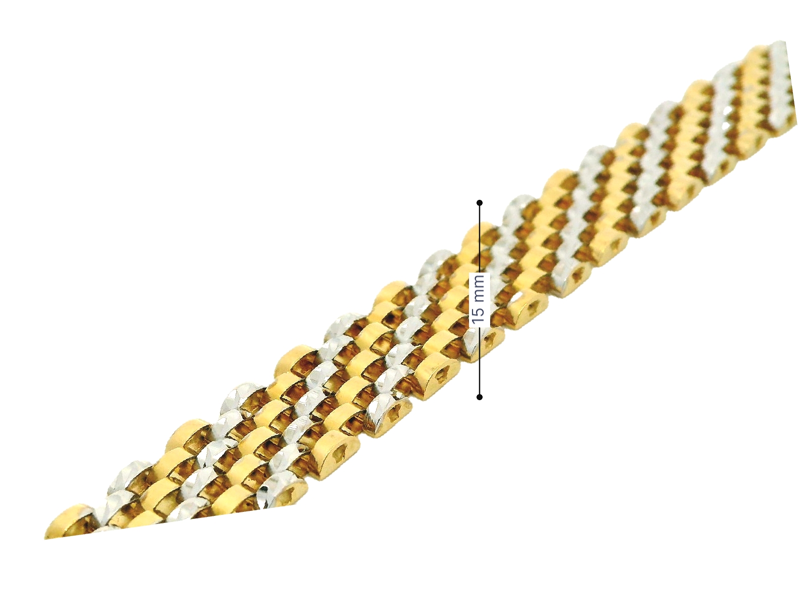 Deze armband van Louis Bros is vervaardigd uit 14 karaat bicolor (32.50 gr.). De armband heeft een lengte van 21 cm en een dikte van 2.5 mm. En een breedte van 15 mm.