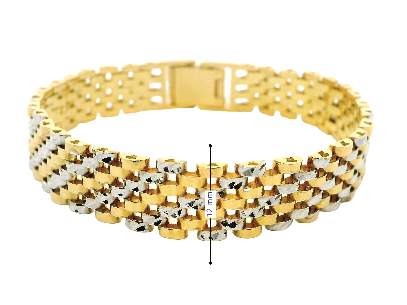 Deze armband van Louis Bros is vervaardigd uit 14 karaat bicolor (24.22 gr.). De armband heeft een lengte van 21 cm en een dikte van 2.5 mm. En een breedte van 12 mm.