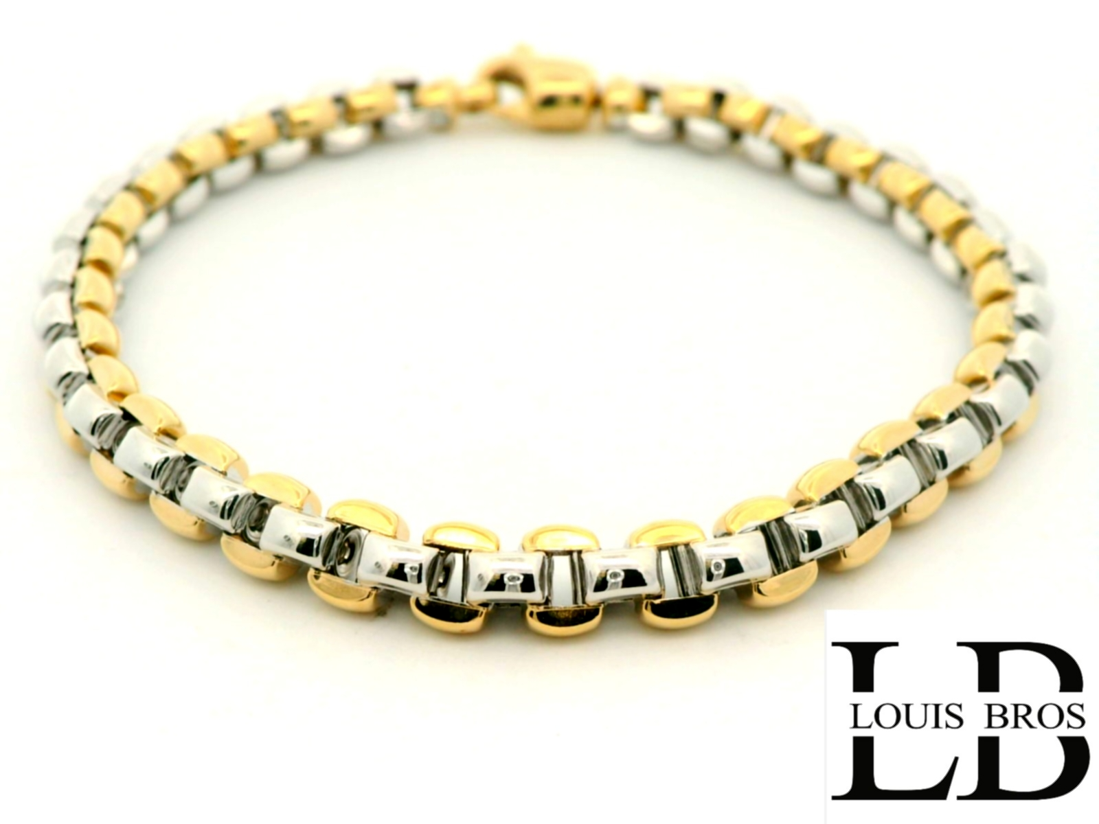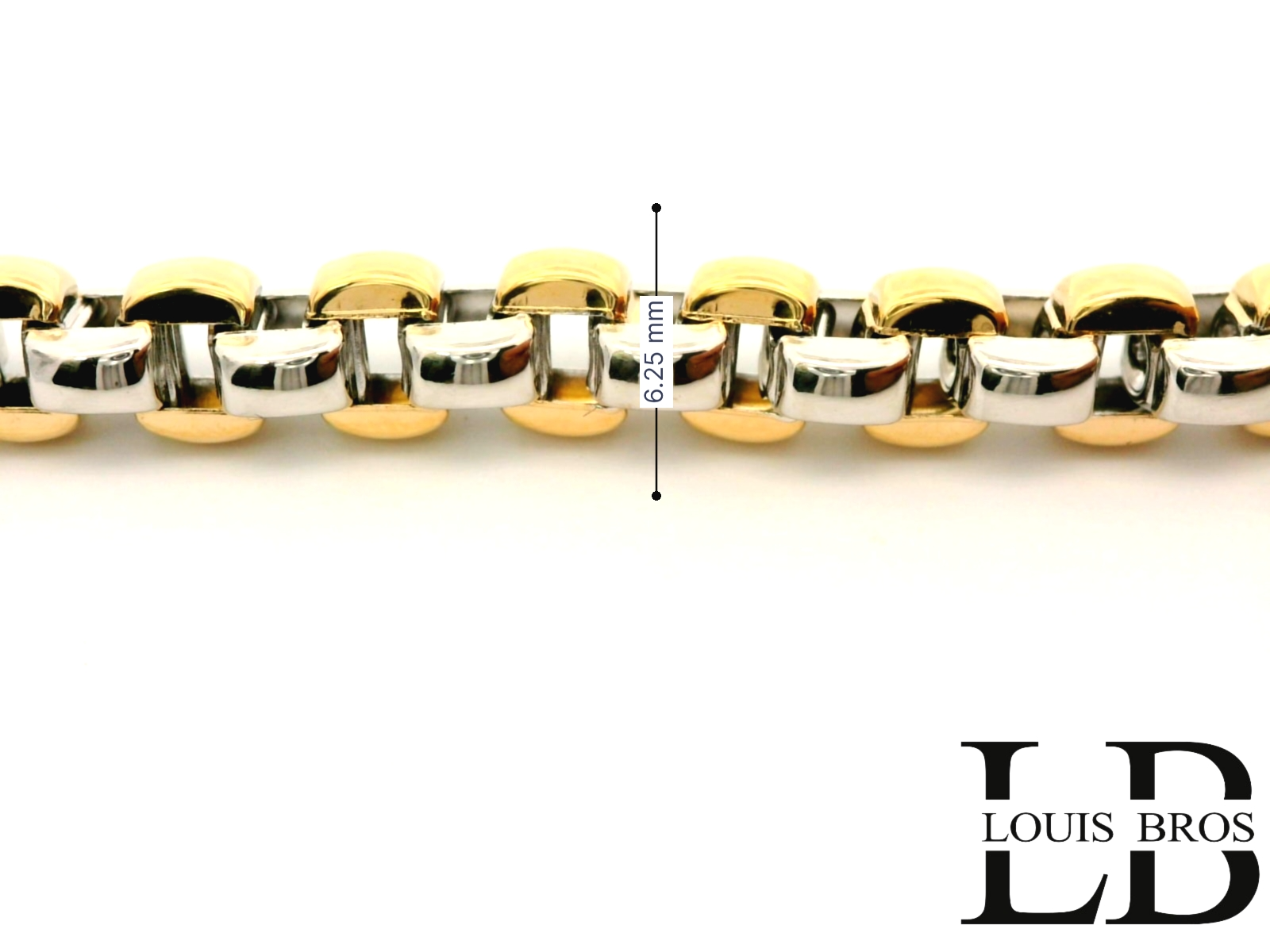 Deze elegante damesarmband is vervaardigd uit 14 karaat bicolor goud (14.40 gr) en combineert op subtiele wijze de warme glans van geelgoud met de verfijnde schittering van witgoud. Het chique en tijdloze design maakt dit sieraad tot een echte klassieker die moeiteloos bij elke gelegenheid gedragen kan worden. Een armband die elegantie en stijl uitstraalt en generaties lang zijn schoonheid behoudt.