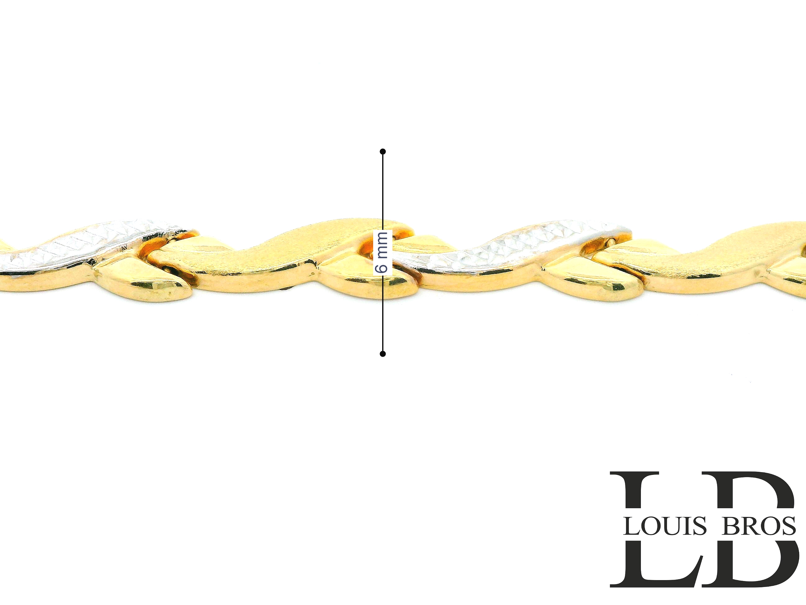 Geef je pols een stijlvolle upgrade met deze verfijnde 14 karaat bicolor gouden armband (5.30 gr). Deze armband combineert glanzend geelgoud met elegant witgoud in een prachtig golvend schakeldesign. De schakels zijn zorgvuldig afgewerkt met een mix van glanzende en gematteerde oppervlakken, wat zorgt voor een subtiele maar luxe uitstraling.