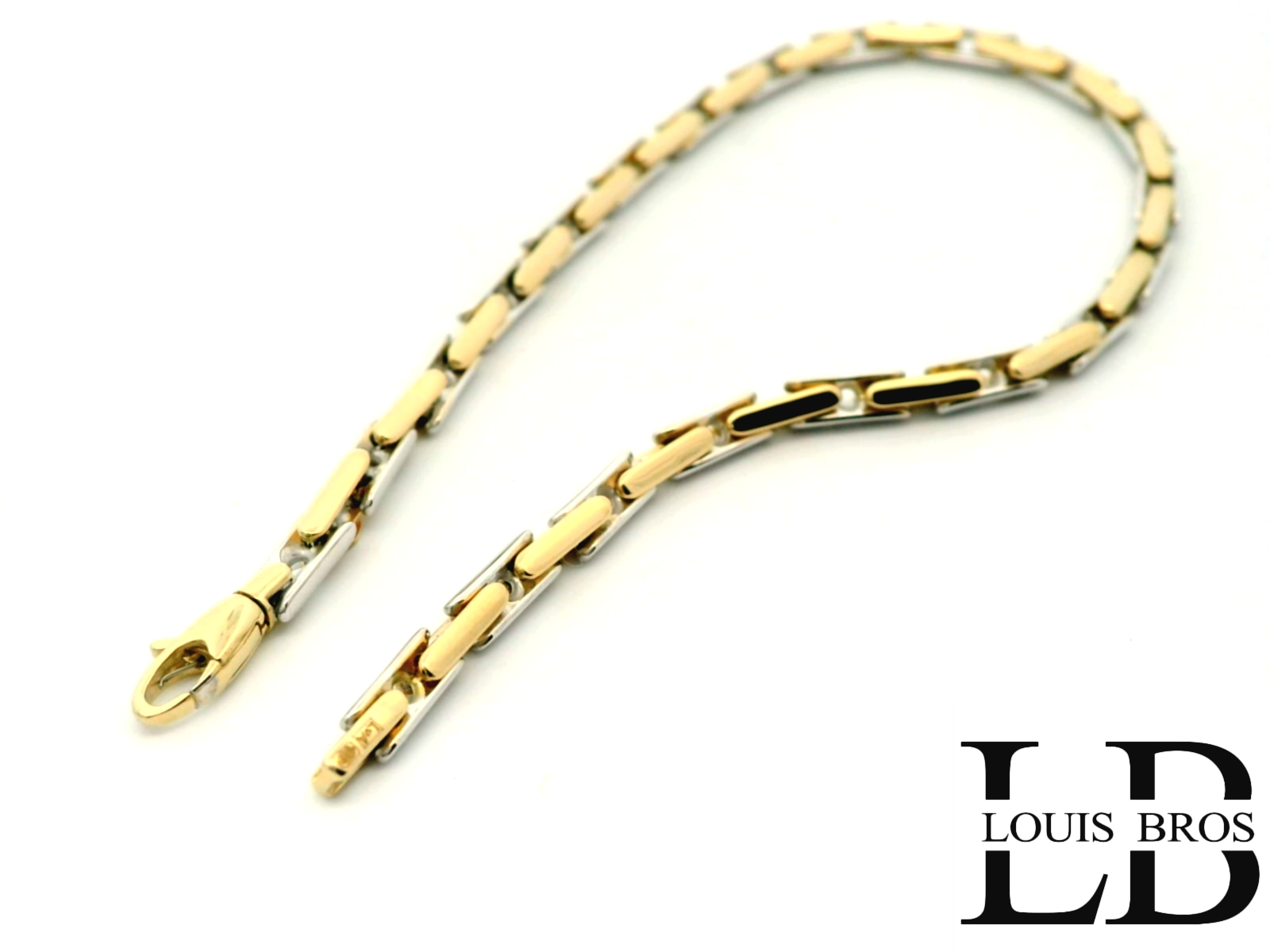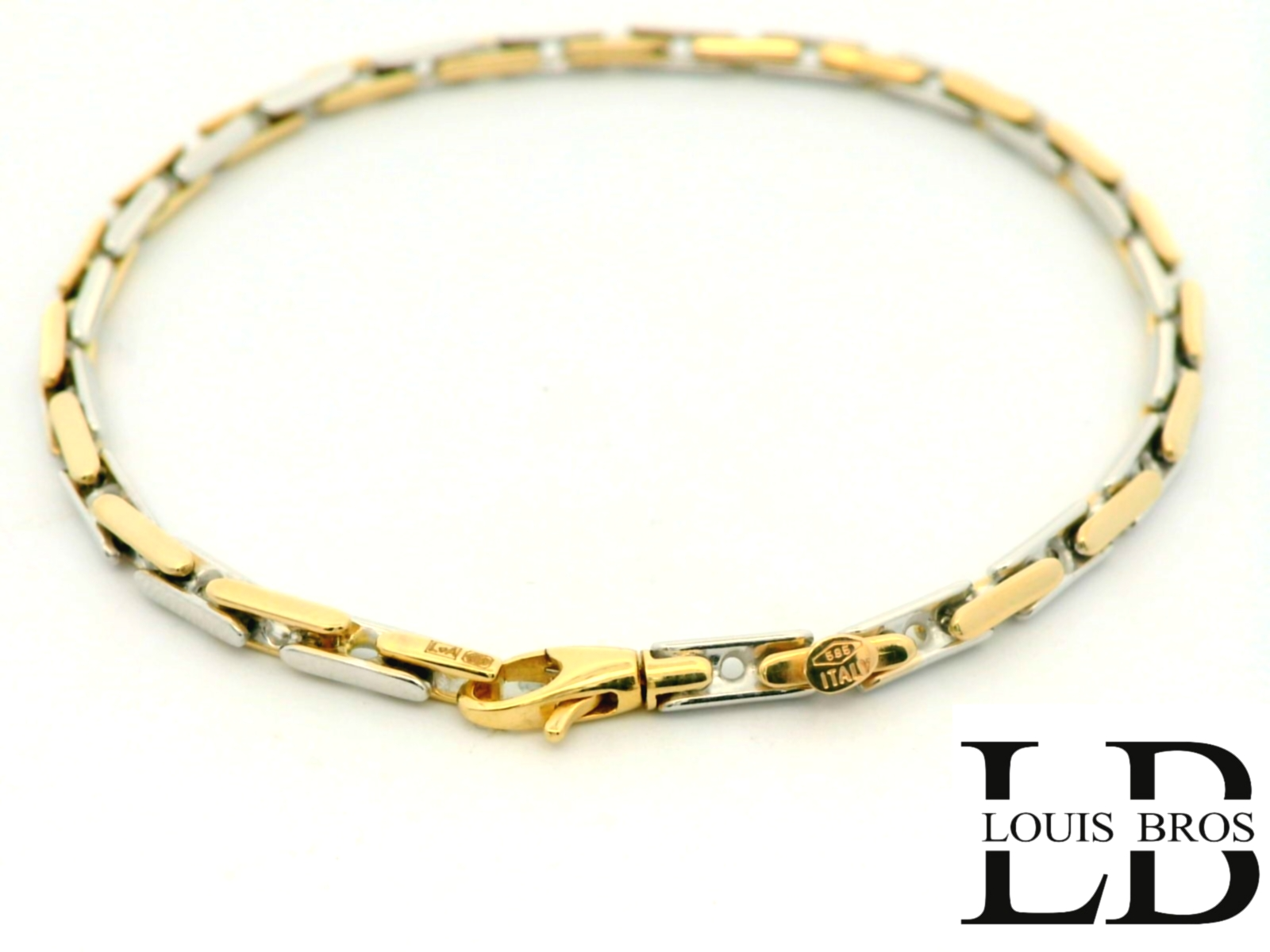 Deze elegante damesarmband is vervaardigd uit 14 karaat bicolor goud (6.24 gr) en combineert op subtiele wijze de warme glans van geelgoud met de verfijnde schittering van witgoud. Het chique en tijdloze design maakt dit sieraad tot een echte klassieker die moeiteloos bij elke gelegenheid gedragen kan worden. Een armband die elegantie en stijl uitstraalt en generaties lang zijn schoonheid behoudt.