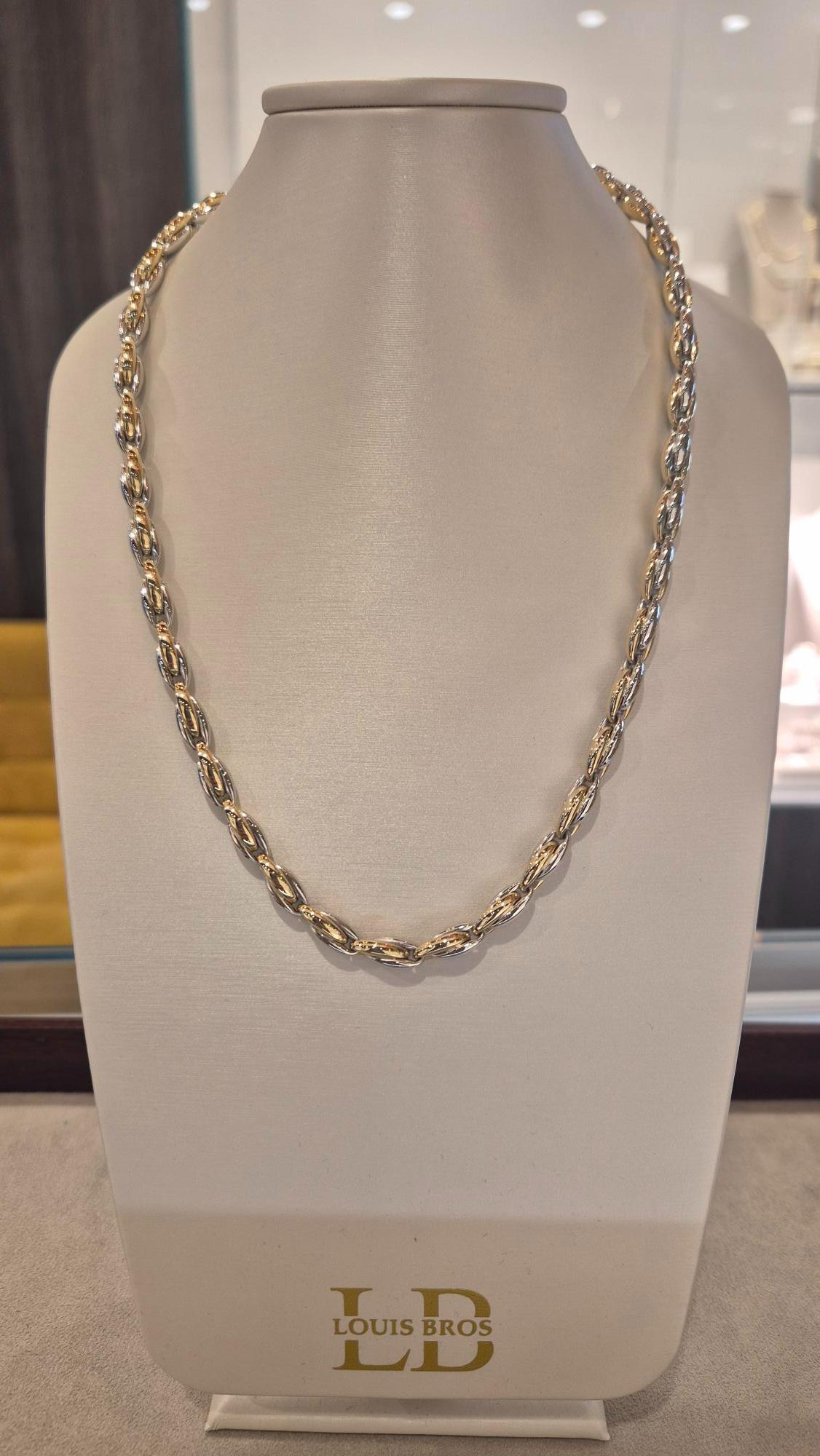 Dit verfijnde damescollier is vervaardigd uit 14 karaat bicolor goud (23.43 gr) en combineert de warme gloed van geelgoud met de elegante schittering van witgoud. Het speelse, maar toch chique ontwerp straalt luxe en tijdloze klasse uit, waardoor dit collier een echte blikvanger is bij elke gelegenheid. Exclusief verkrijgbaar bij Juwelier Louis Bros, is dit sieraad een symbool van vakmanschap, elegantie en stijl – een juweel dat generaties lang zijn schoonheid behoudt.