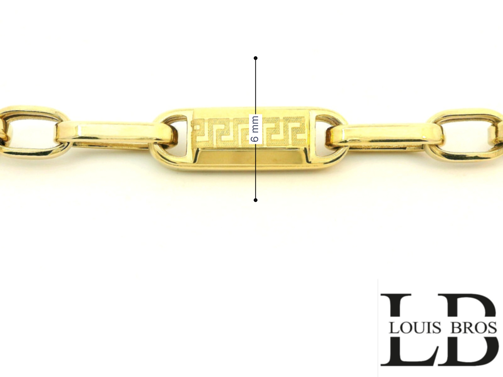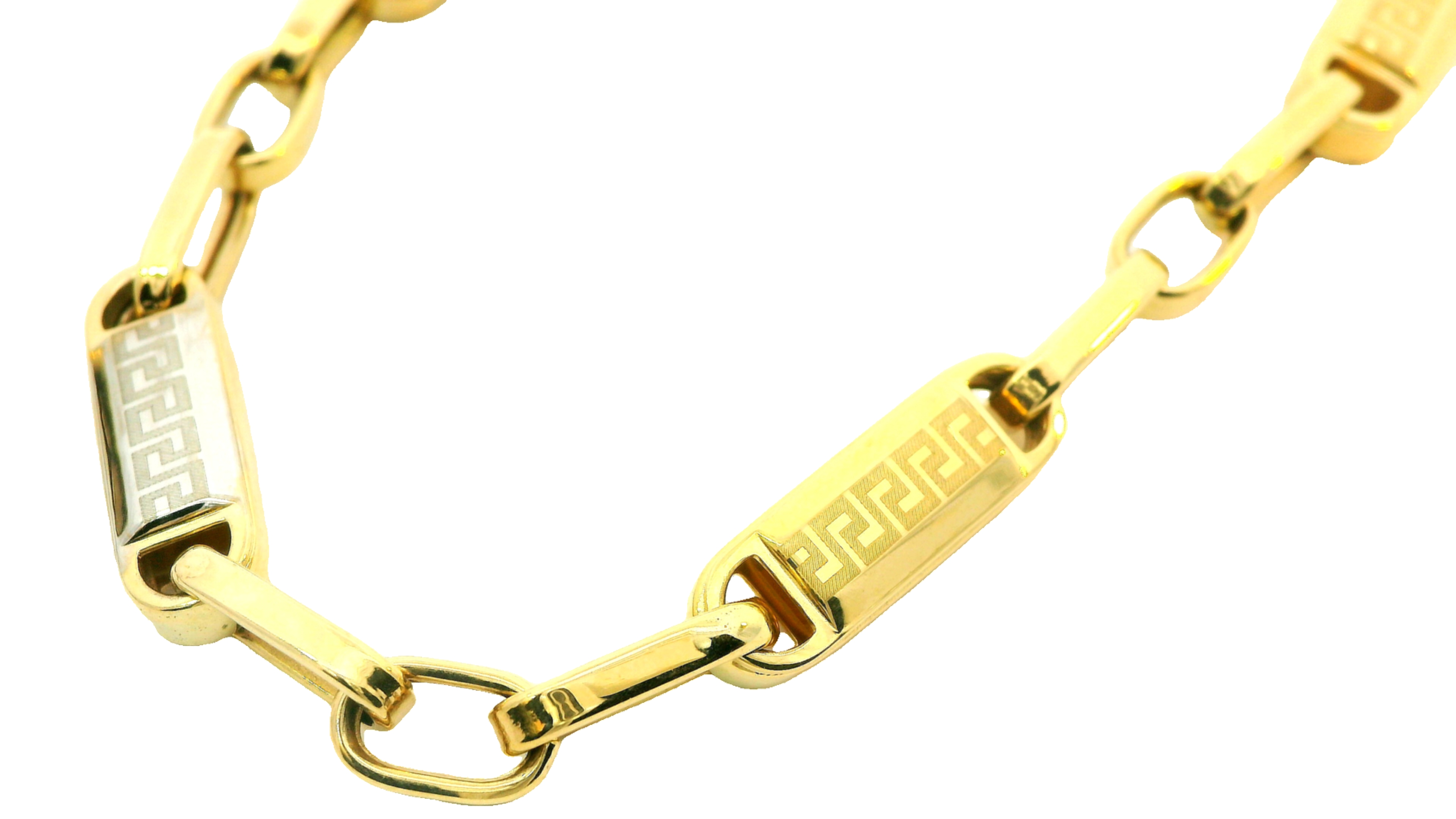 De robuuste rechthoekige schakels worden afgewisseld met verfijnde, gegraveerde tussenstukken voorzien van een klassiek Grieks sleutelpatroon. Deze gravure geeft het collier een uniek en luxe accent, terwijl de gepolijste afwerking zorgt voor een prachtige glans.