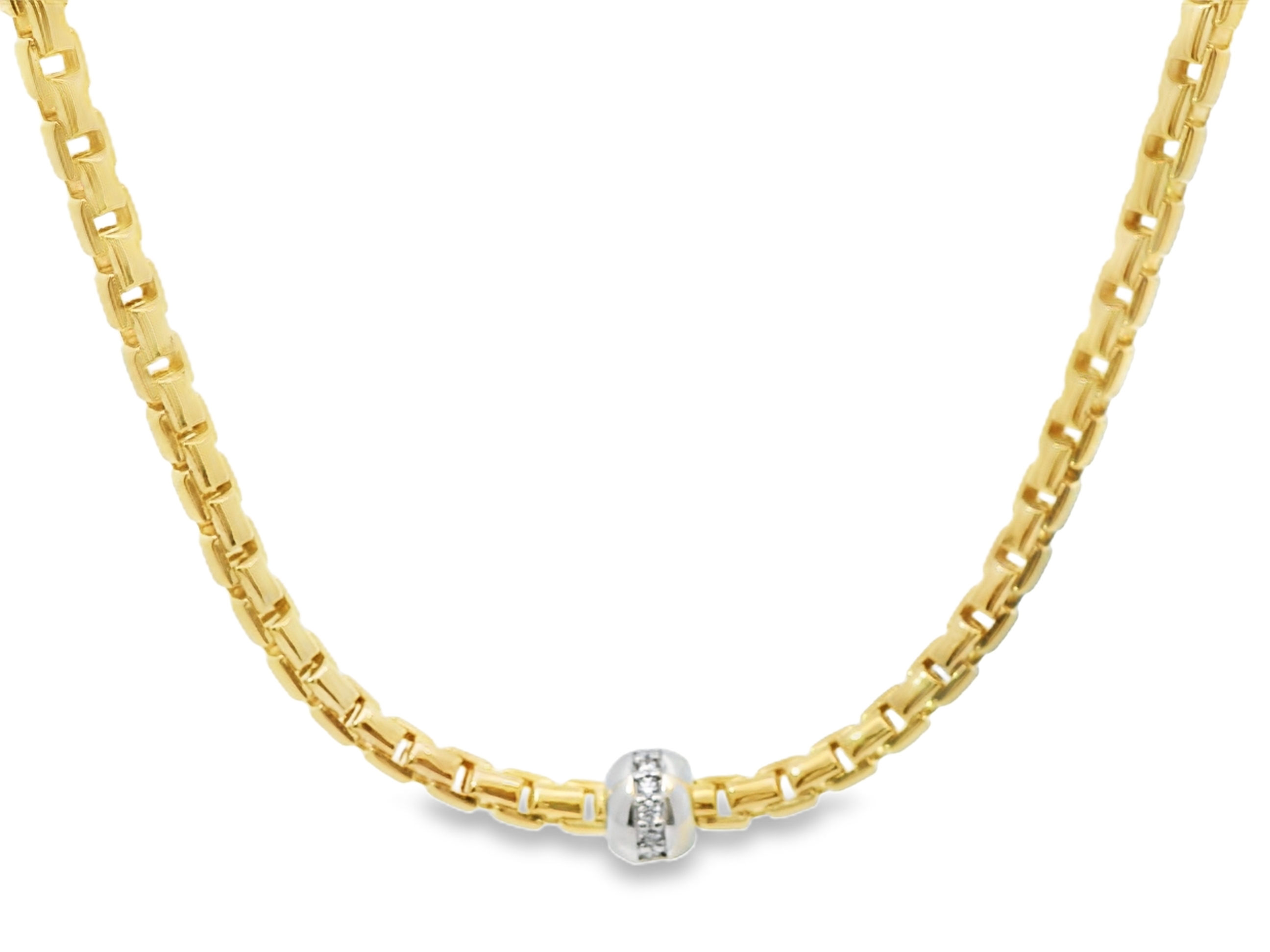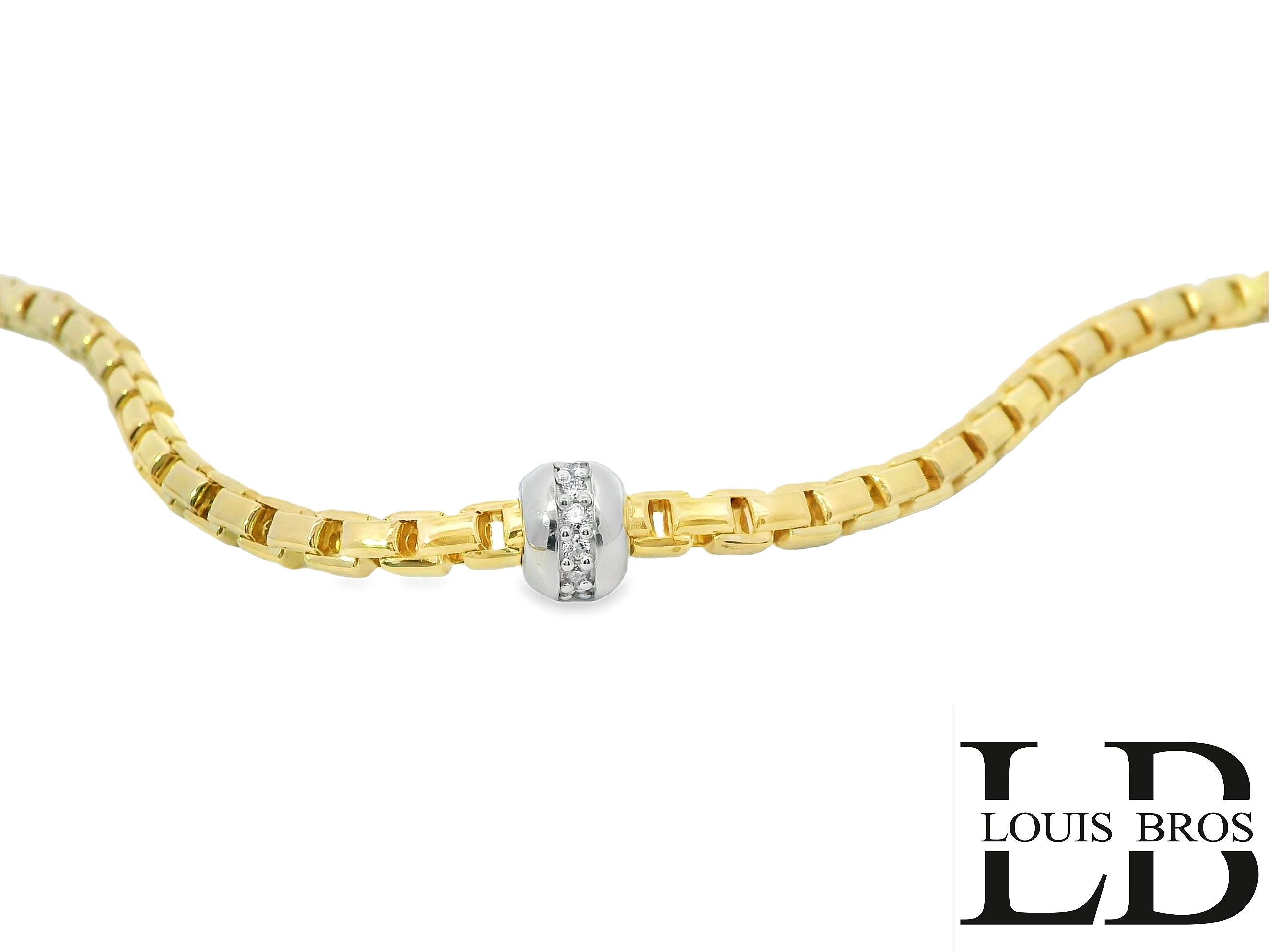 In het midden schittert een oogverblindende eyecatcher: een bal van witgoud, subtiel bezet met fonkelende diamanten. Deze luxueuze touch creëert een prachtig contrast met het warme geelgoud en geeft het sieraad een exclusieve uitstraling.