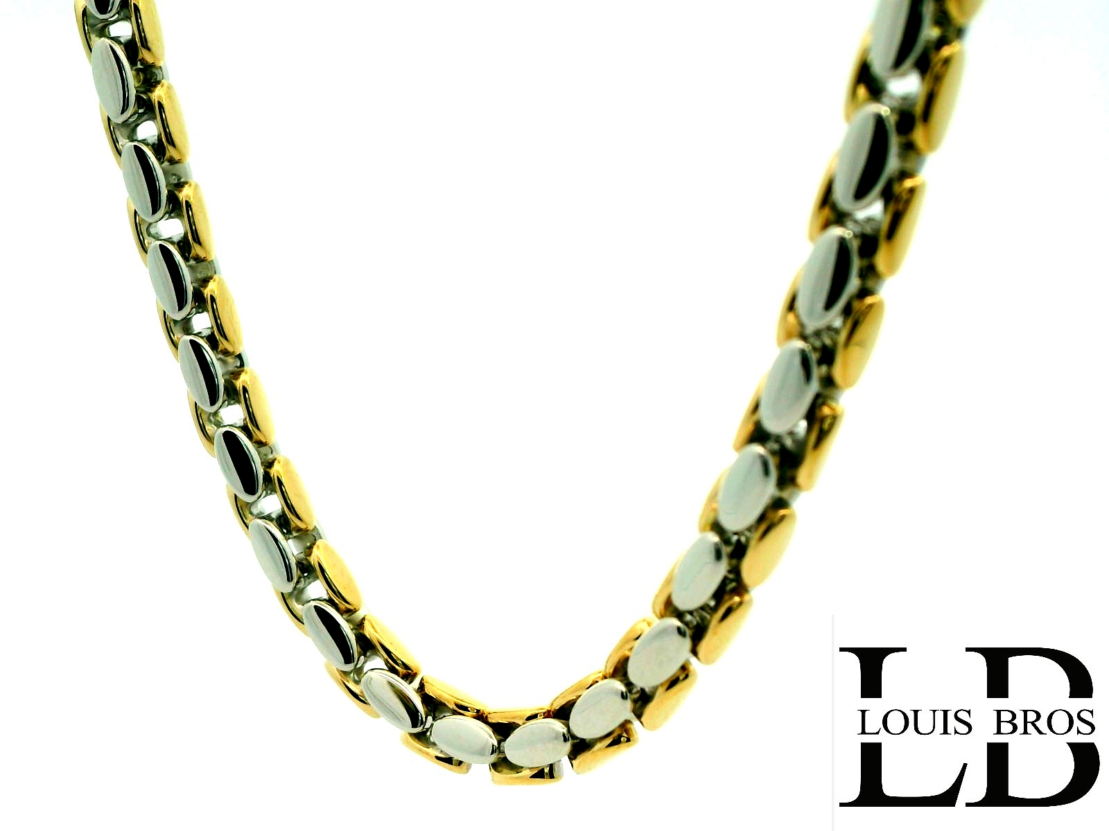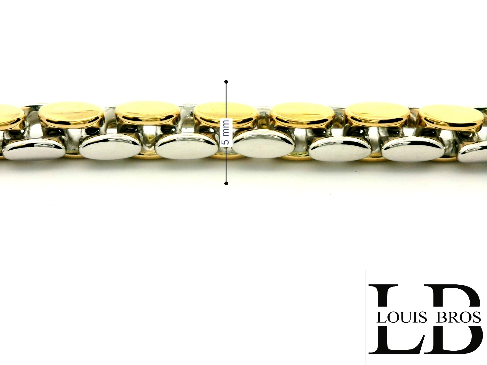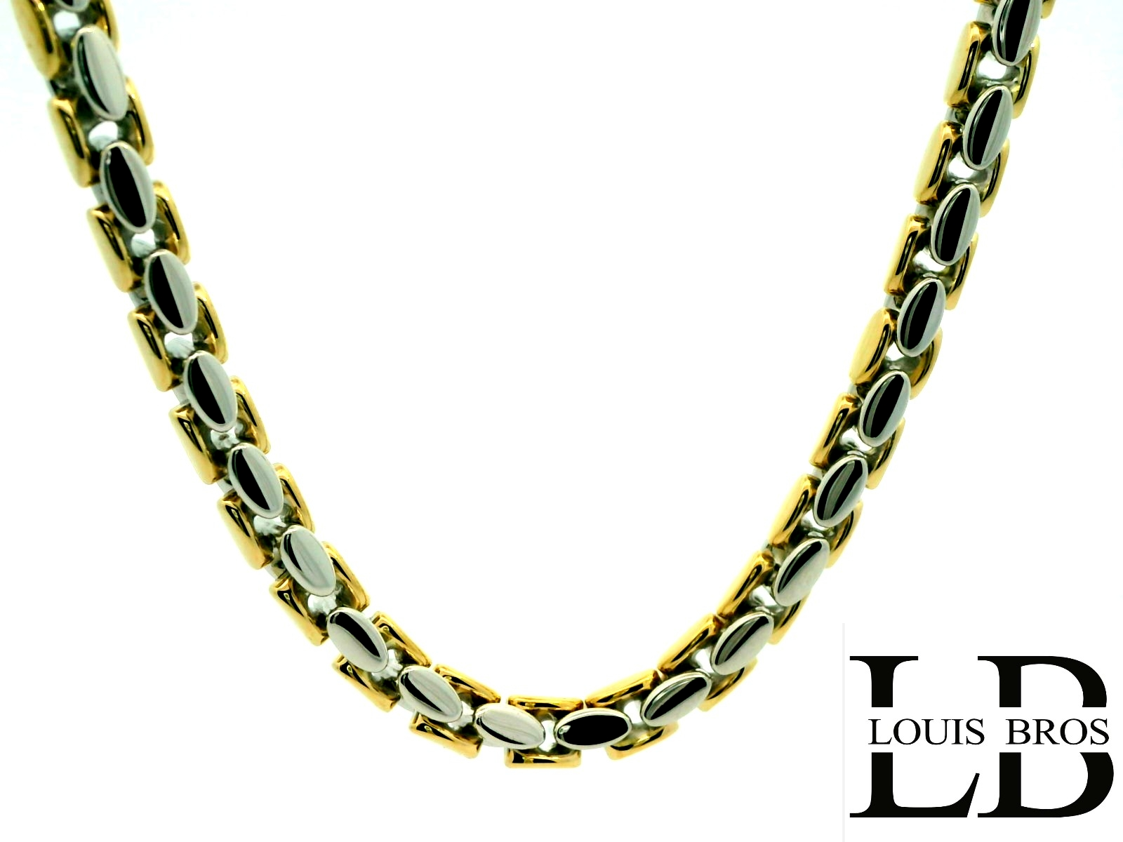 Dit verfijnde damescollier is vervaardigd uit 14 karaat bicolor goud (30.95 gr) en combineert de warme gloed van geelgoud met de elegante schittering van witgoud. Het speelse, maar toch chique ontwerp straalt luxe en tijdloze klasse uit, waardoor dit collier een echte blikvanger is bij elke gelegenheid. Exclusief verkrijgbaar bij Juwelier Louis Bros, is dit sieraad een symbool van vakmanschap, elegantie en stijl – een juweel dat generaties lang zijn schoonheid behoudt.