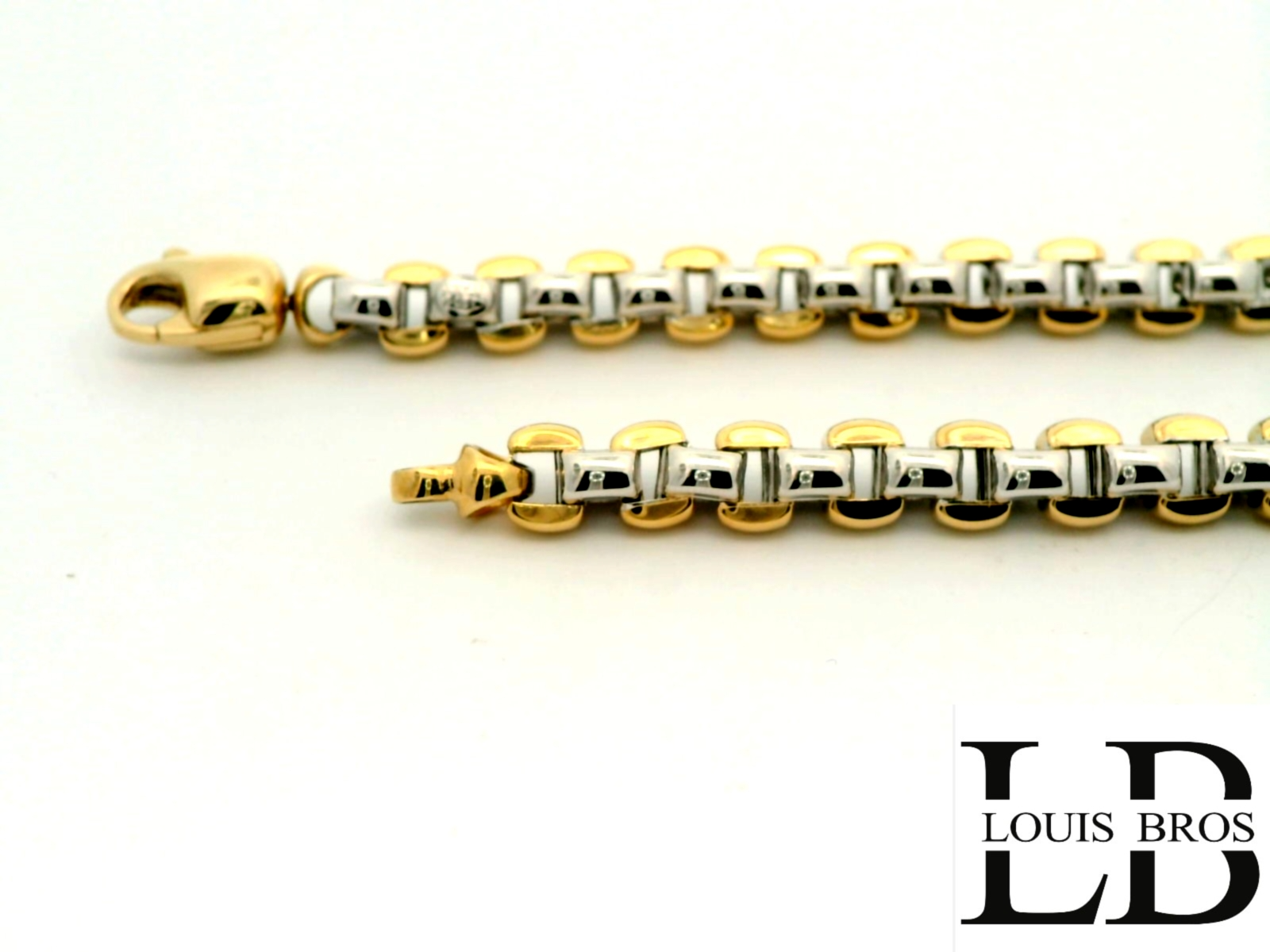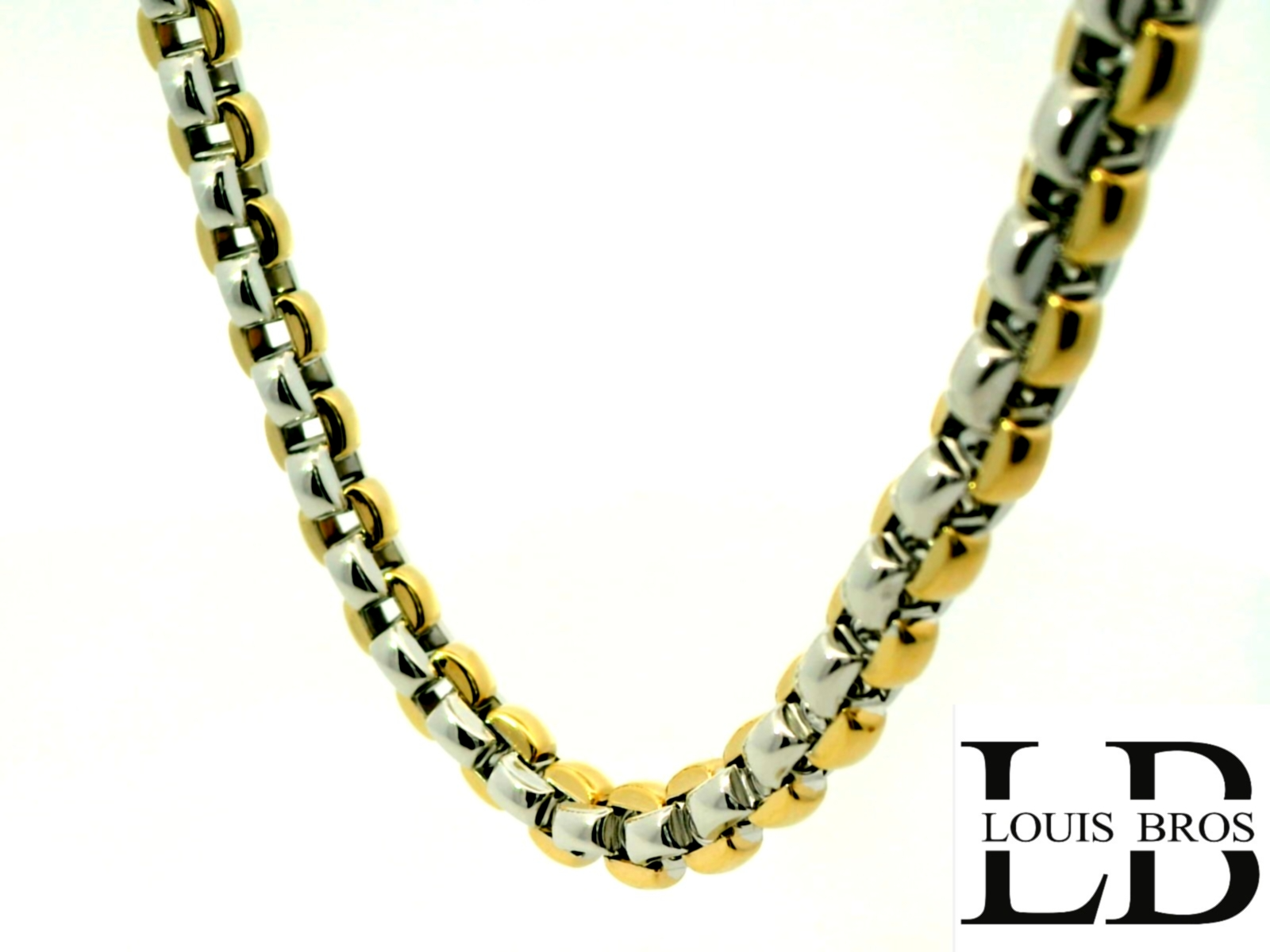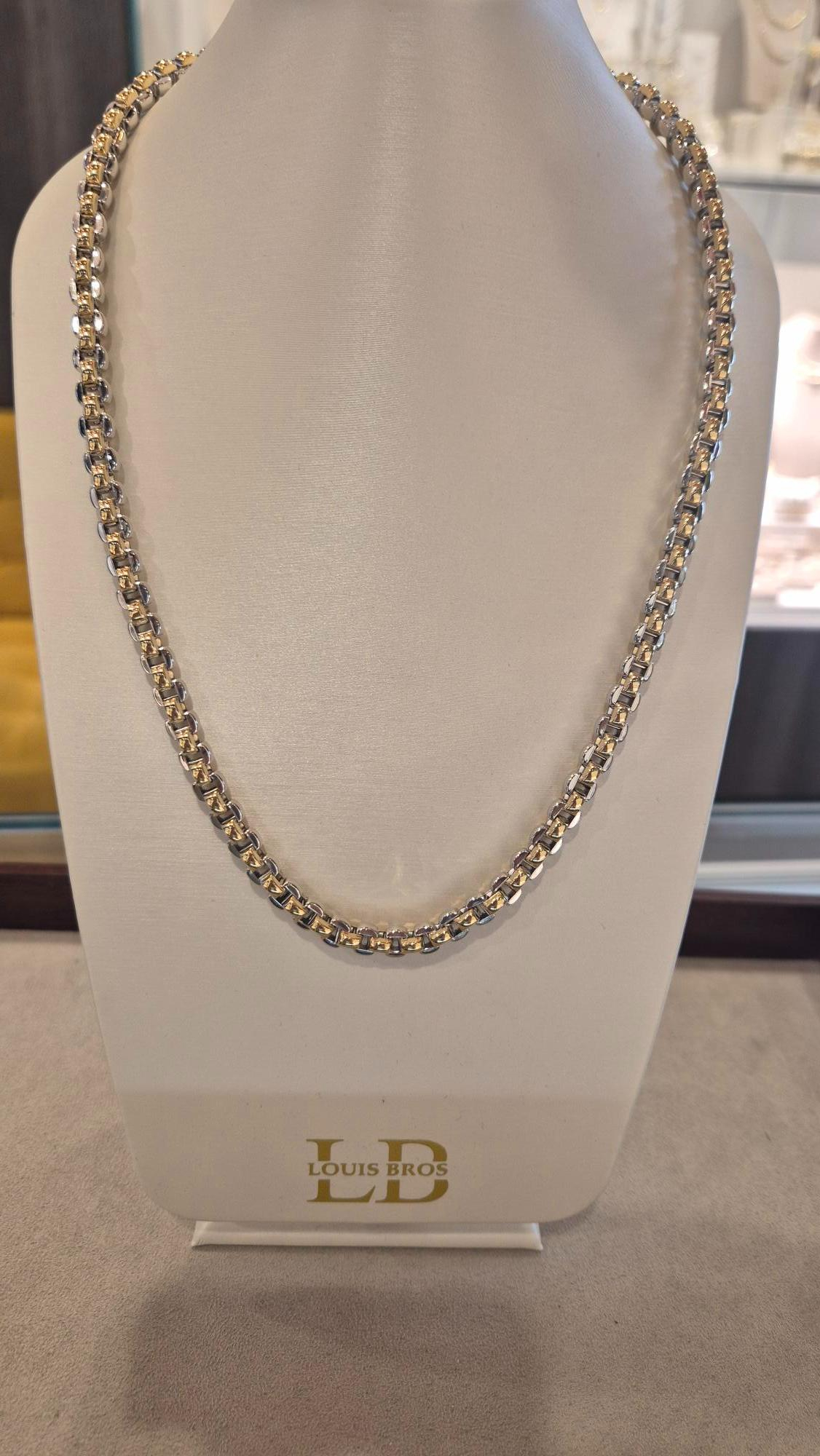Dit prachtige damescollier is vervaardigd uit 14 karaat bicolor goud (32.18 gr) en verenigt de warme gloed van geelgoud met de verfijnde schittering van witgoud. Het elegante ontwerp straalt tijdloze klasse uit en is exclusief verkrijgbaar bij Juwelier Louis Bros. Dankzij de subtiele combinatie van twee goudtinten is dit collier een veelzijdig juweel dat moeiteloos elke stijl compleet maakt – van dagelijkse elegantie tot een feestelijke gelegenheid. Een tijdloos sieraad dat generaties lang zijn schoonheid behoudt.