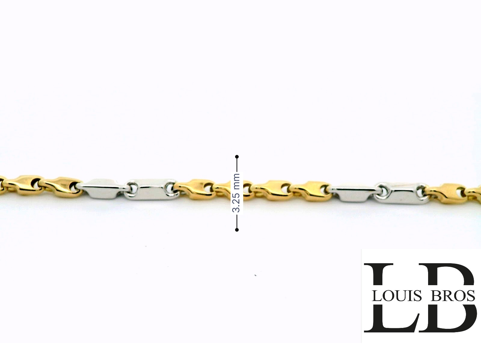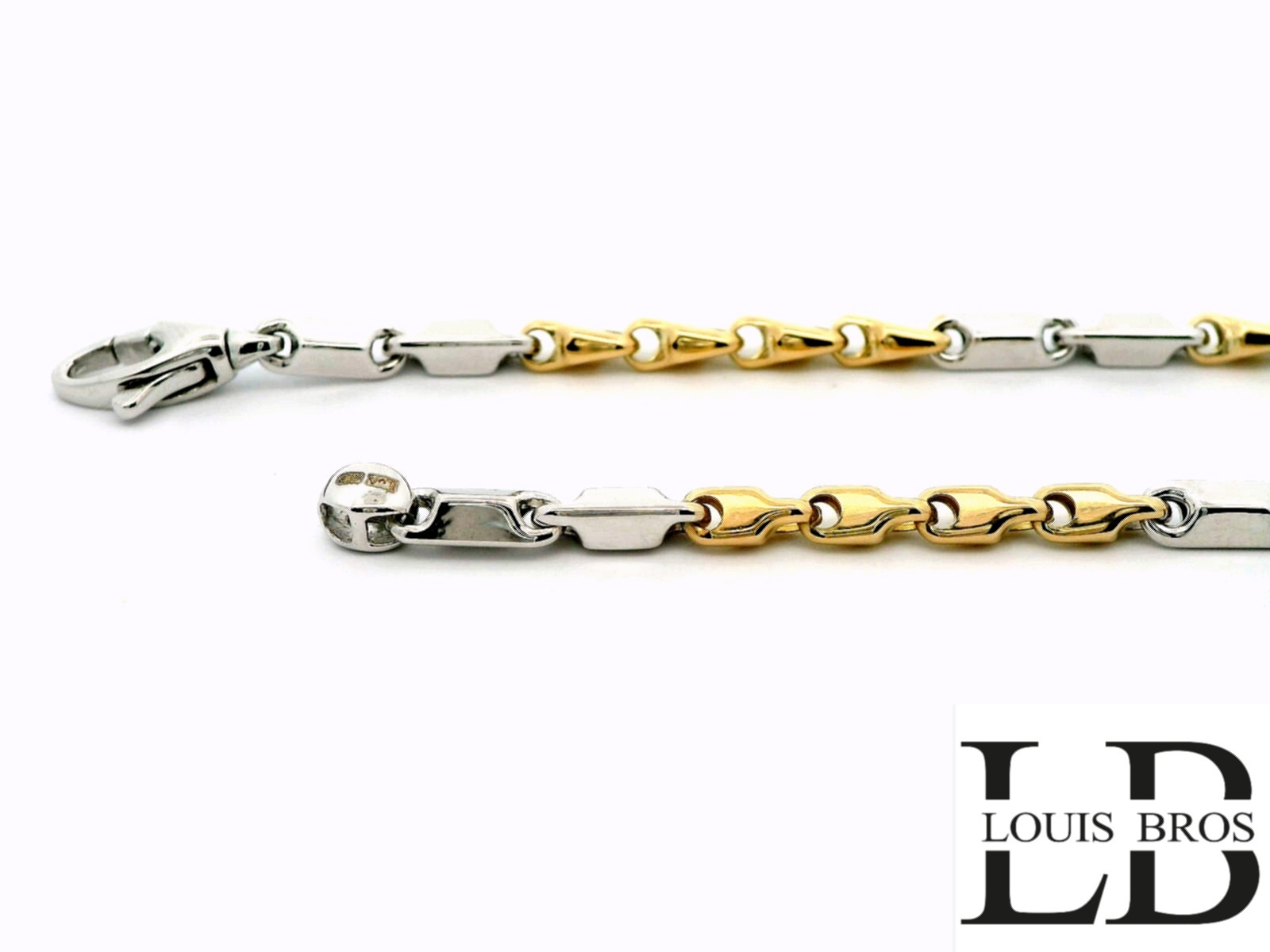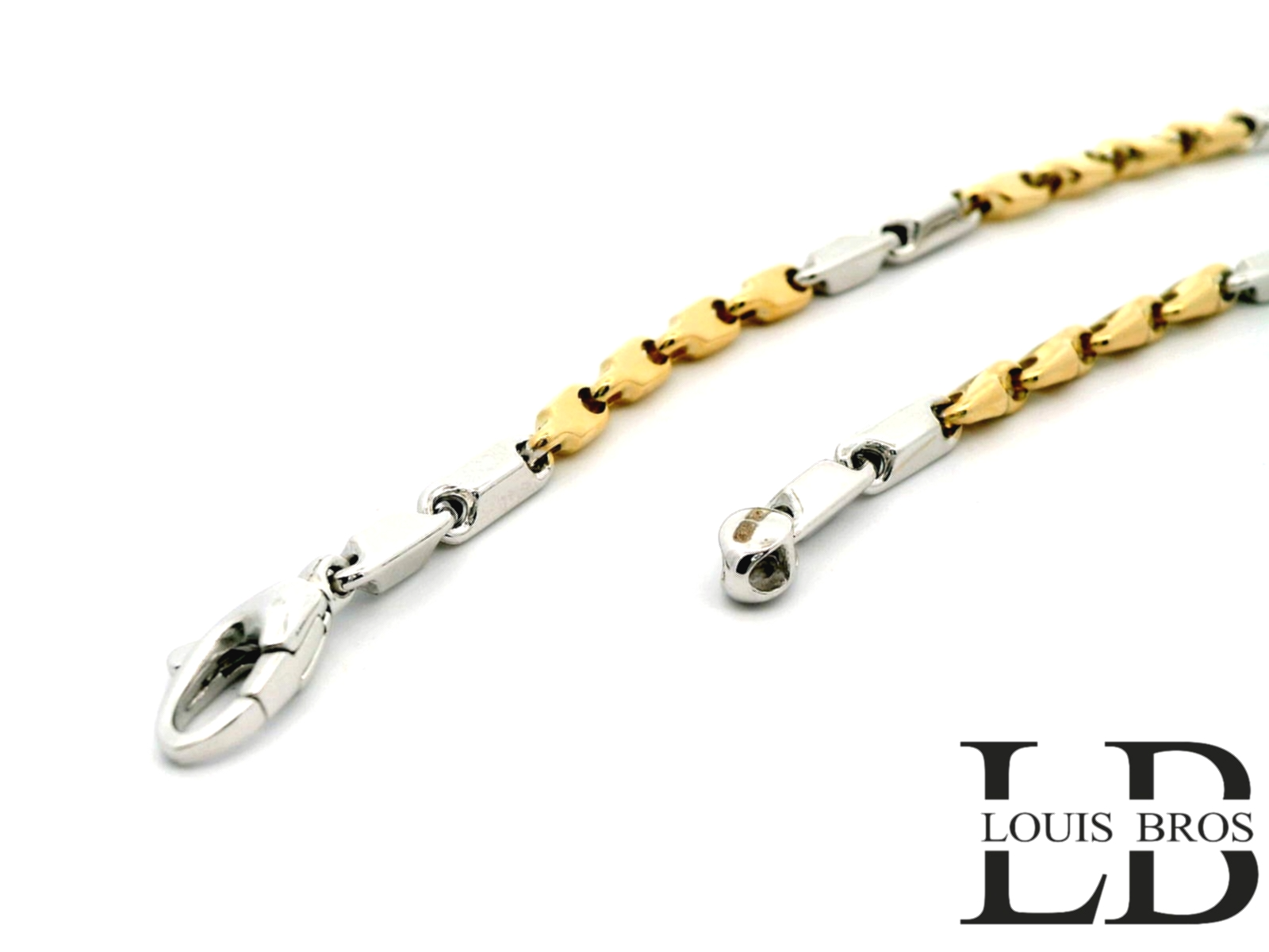 Dit stijlvolle bicolor collier van 14 karaat goud (12. gr) straalt klasse en verfijning uit. De schakels zijn elegant vormgegeven in een afwisselend patroon van geelgoud en witgoud, wat zorgt voor een modern en luxe contrast. Het strakke design maakt dit collier niet alleen chic en elegant, maar ook tijdloos en veelzijdig te dragen.