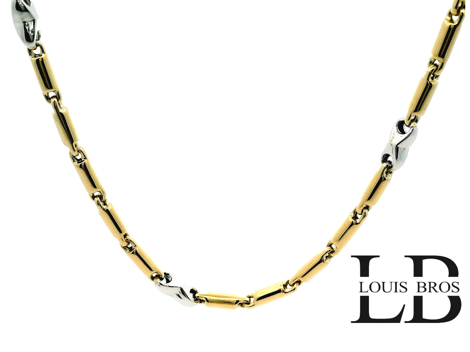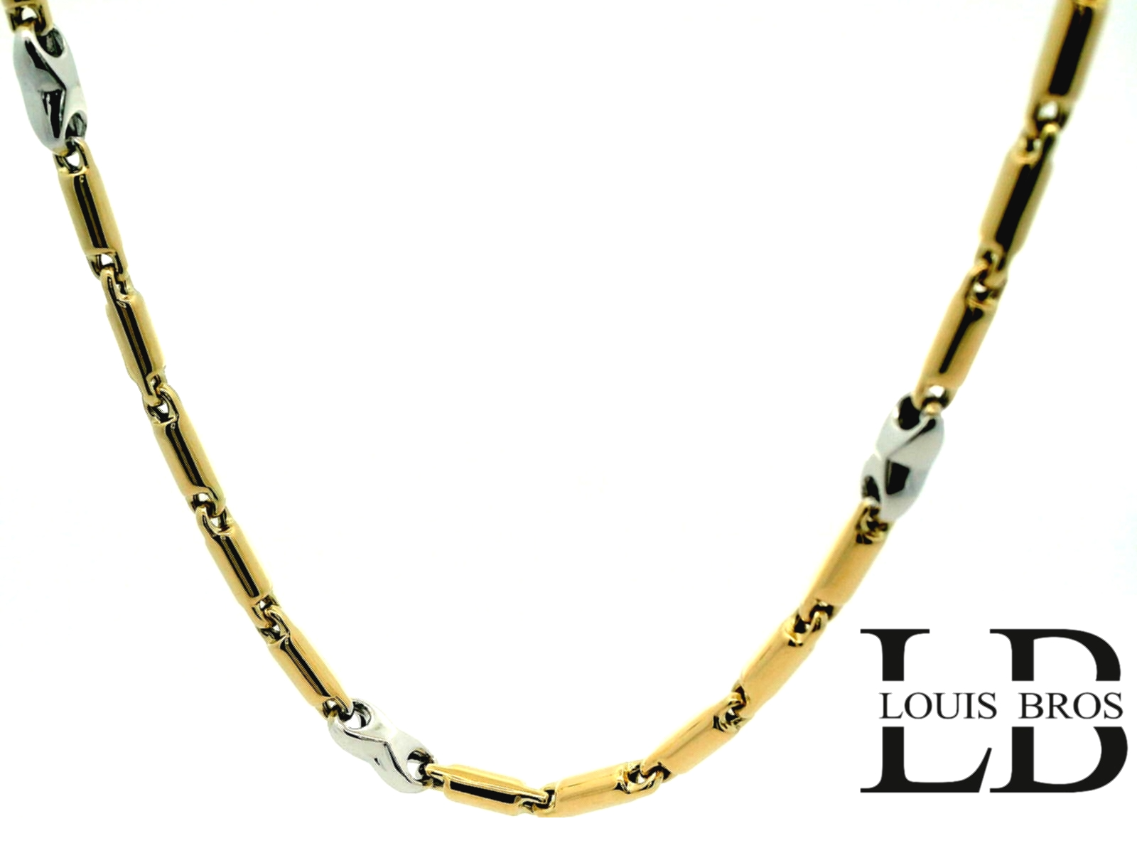 Dit stijlvolle bicolor collier van 14 karaat goud (10.85 gr) straalt klasse en verfijning uit. De schakels zijn elegant vormgegeven in een afwisselend patroon van geelgoud en witgoud, wat zorgt voor een modern en luxe contrast. Het strakke design maakt dit collier niet alleen chic en elegant, maar ook tijdloos en veelzijdig te dragen.