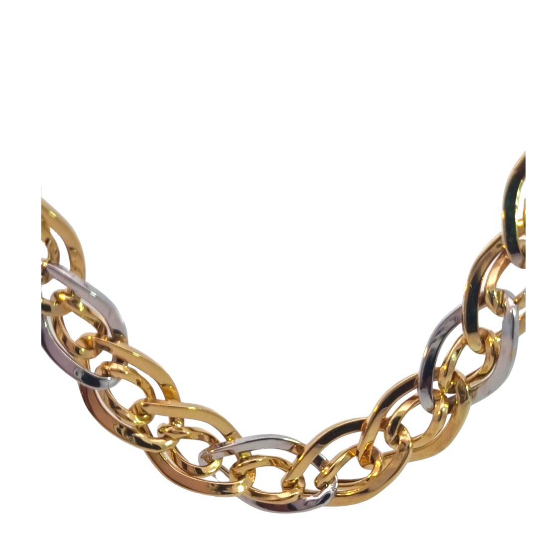 Dit gouden collier is een prachtig voorbeeld van elegantie en verfijning. Gemaakt van een harmonieuze combinatie van wit- en geelgoud, biedt dit collier een uniek en bijzonder ontwerp dat in het oog springt. De delicate schakels en het stijlvolle contrast van de twee goudtinten maken het een sieraad dat zowel modern als tijdloos is. Perfect voor speciale gelegenheden of als een luxe dagelijkse accessoire, voegt dit collier een vleugje klasse toe aan elke outfit.