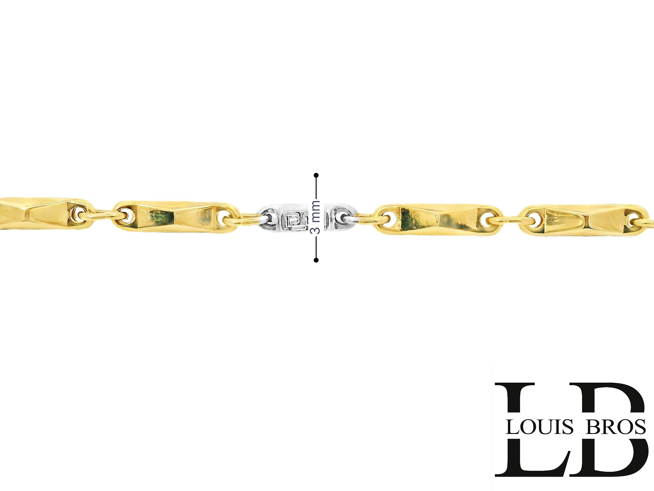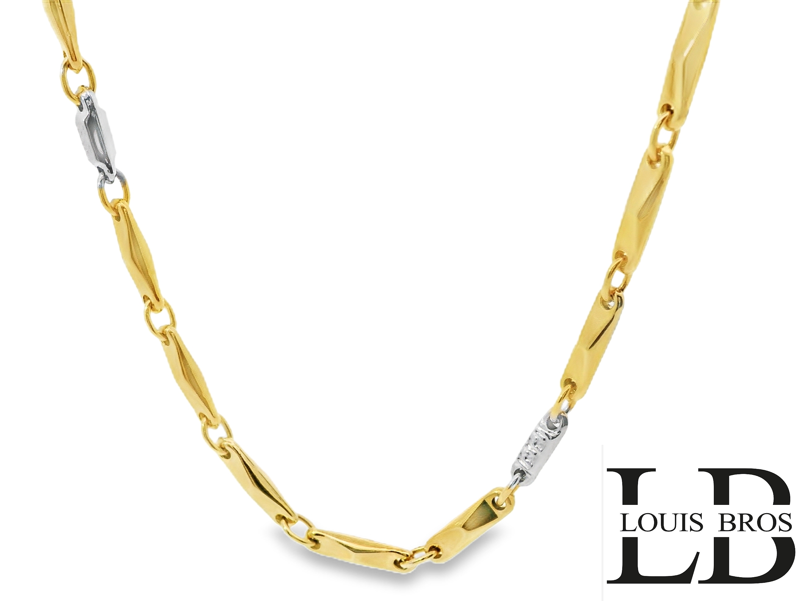 Dit collier van Louis Bros is vervaardigd uit 14 karaat bicolor (11.55 gr). Het collier heeft een lengte van 65 cm en een dikte van 3 mm. Dit collier is stijlvol, eenvoudig en gemakkelijk te combineren.
