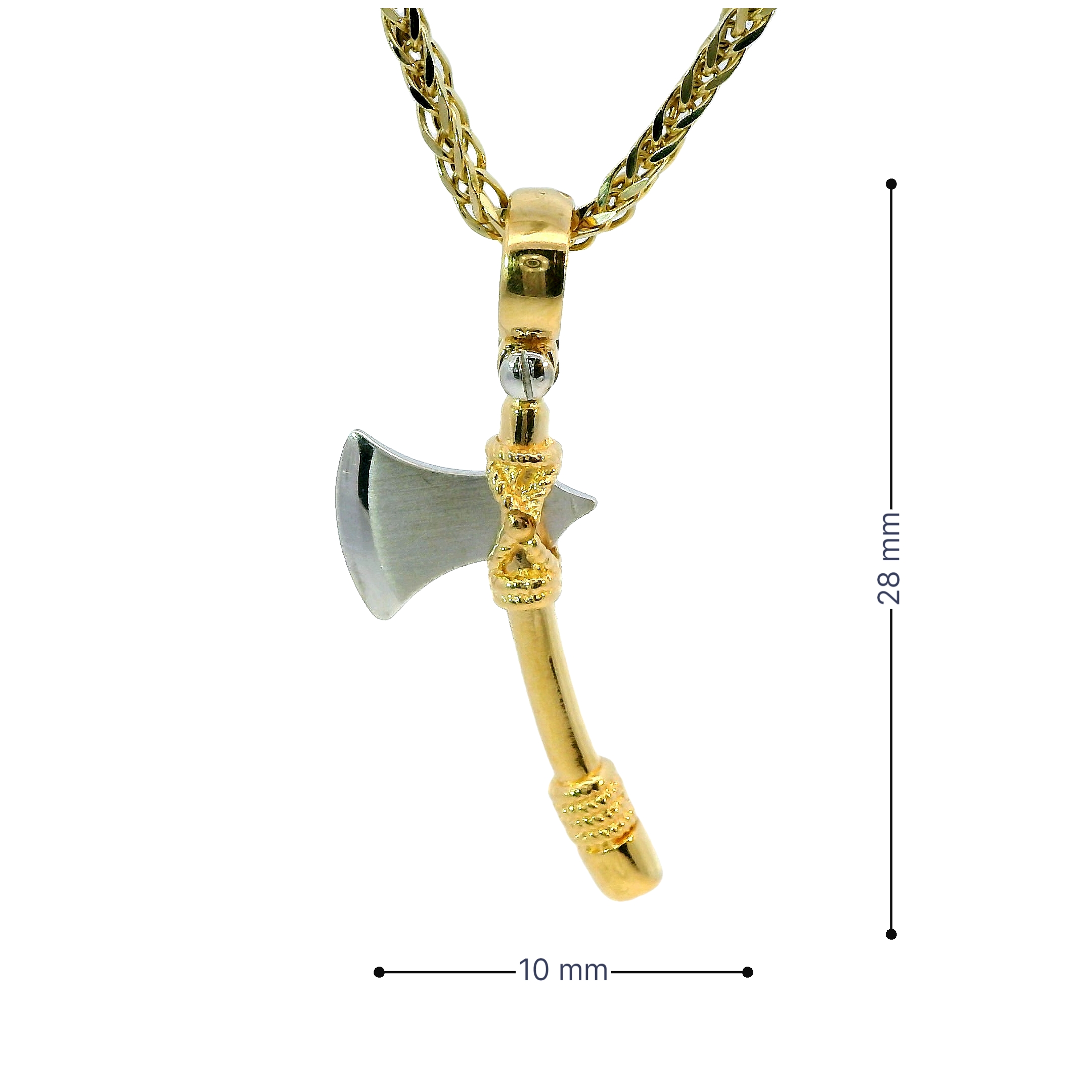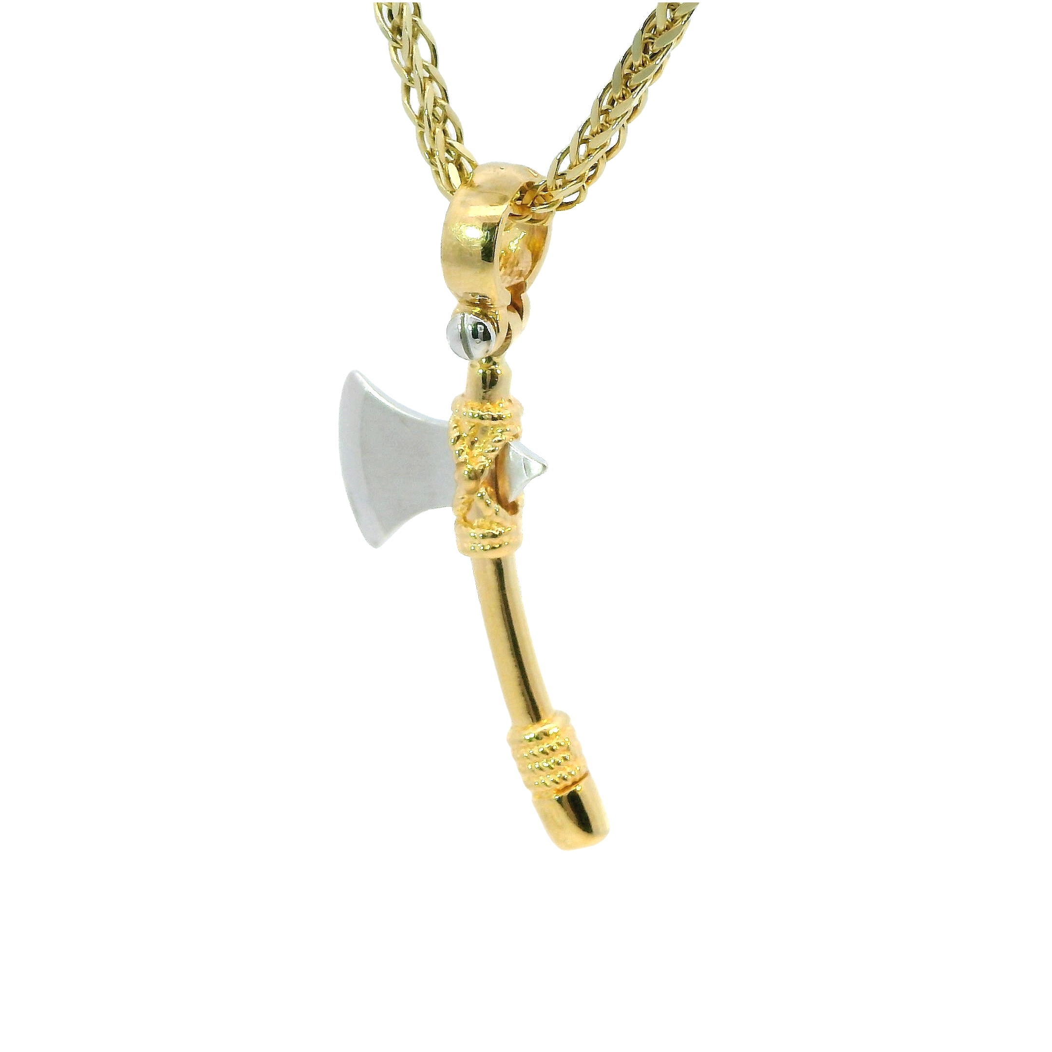 Deze hanger in de vorm van een bijl combineert twee soorten goud, vaak geel en wit goud, voor een opvallend contrast en elegante uitstraling. Deze hanger, geïnspireerd door de kracht en symboliek van de bijl, straalt zowel kracht als verfijning uit. Het vakmanschap in de afwerking zorgt ervoor dat de verschillende goudtinten subtiel in elkaar overlopen, wat het sieraad een tijdloze en veelzijdige keuze maakt. Perfect voor zowel dagelijks gebruik als speciale gelegenheden, brengt deze hanger stijl en betekenis samen in een uniek ontwerp.