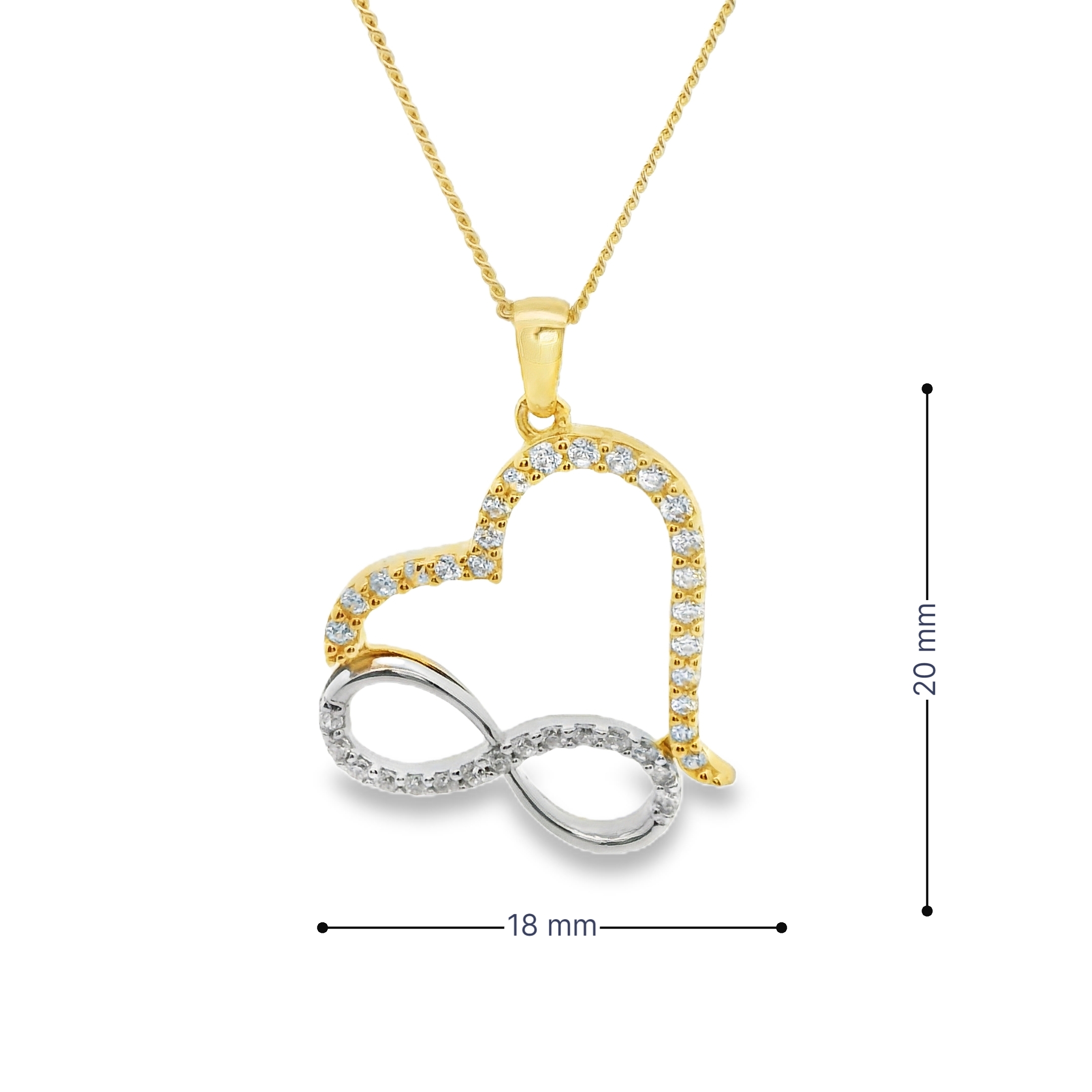 Deze hanger in de vorm van een hartje en infinity-teken, versierd met zirkonia, symboliseert oneindige liefde en verbondenheid. De combinatie van wit- en geelgoud geeft het sieraad een verfijnd contrast, terwijl de fonkelende zirkonia's een vleugje glamour toevoegen. Dit elegante en betekenisvolle sieraad is perfect voor wie zijn of haar onvoorwaardelijke liefde wil uitdrukken. Een tijdloos cadeau en een prachtige toevoeging aan elke sieradencollectie.