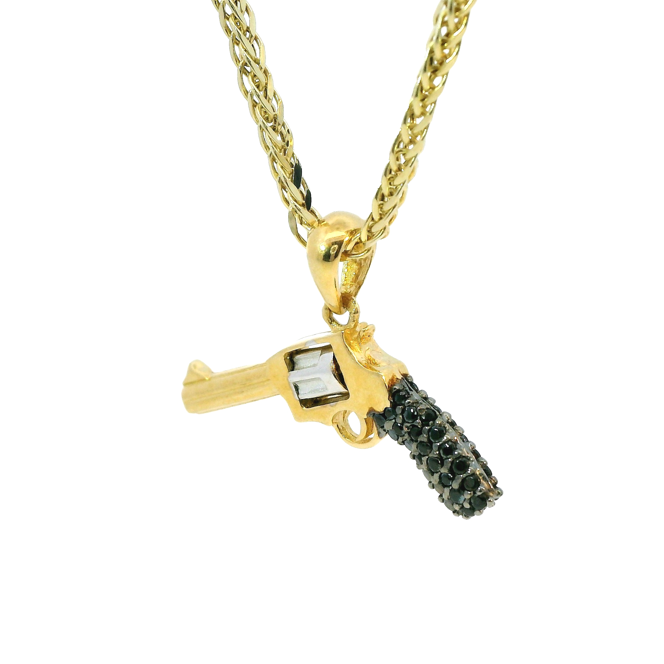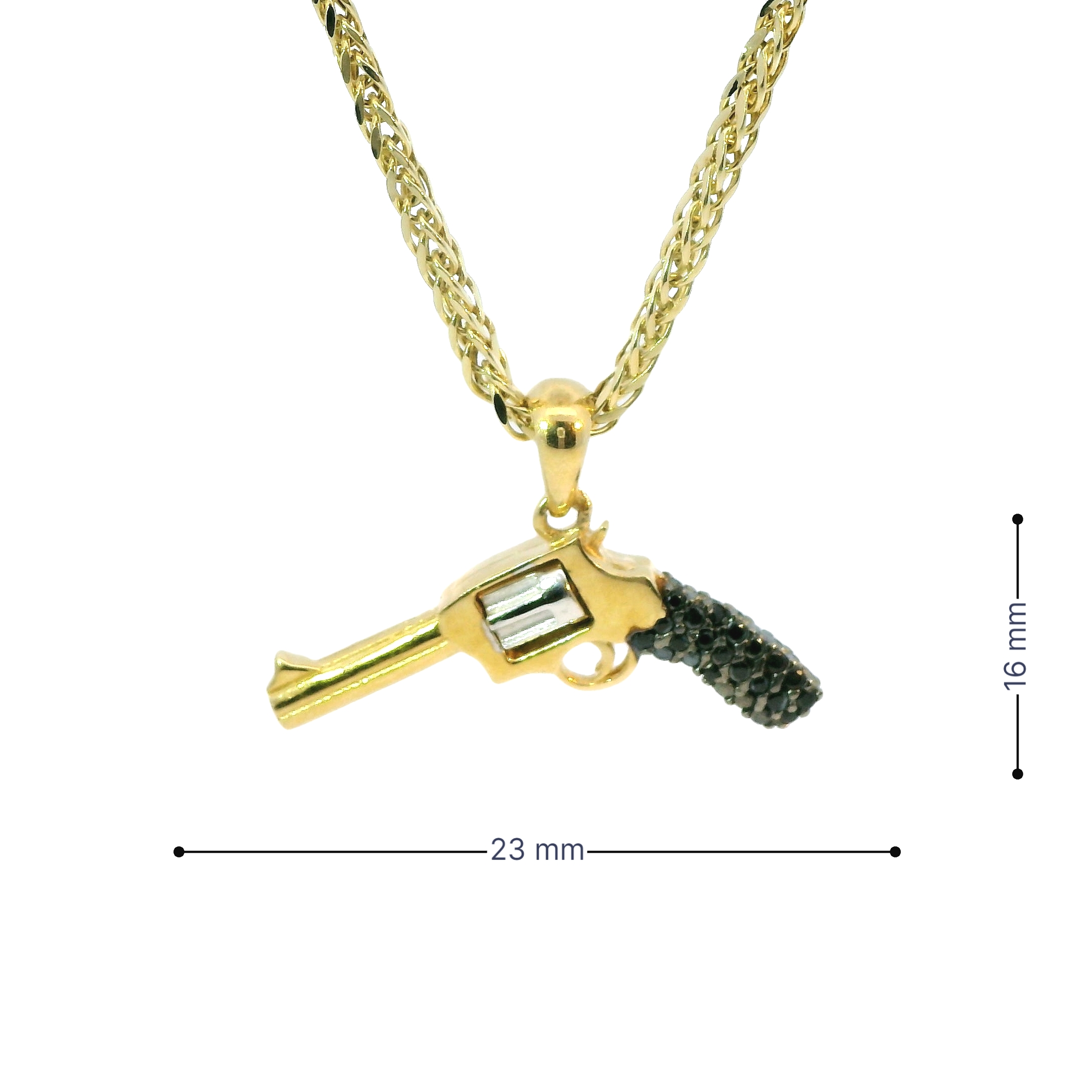Deze hanger in de vorm van een pistool combineert twee tinten met finesse en geeft een gedurfde, eigentijdse look. Het pistool is verfijnd versierd met glinsterende zwarte zirkonia's, die een mysterieus en krachtig effect creëren. De mix van kleuren zorgt voor een stijlvol contrast, waardoor het sieraad opvalt zonder zijn elegantie te verliezen. Een perfect accessoire voor wie kracht en luxe in één statement wil verenigen.