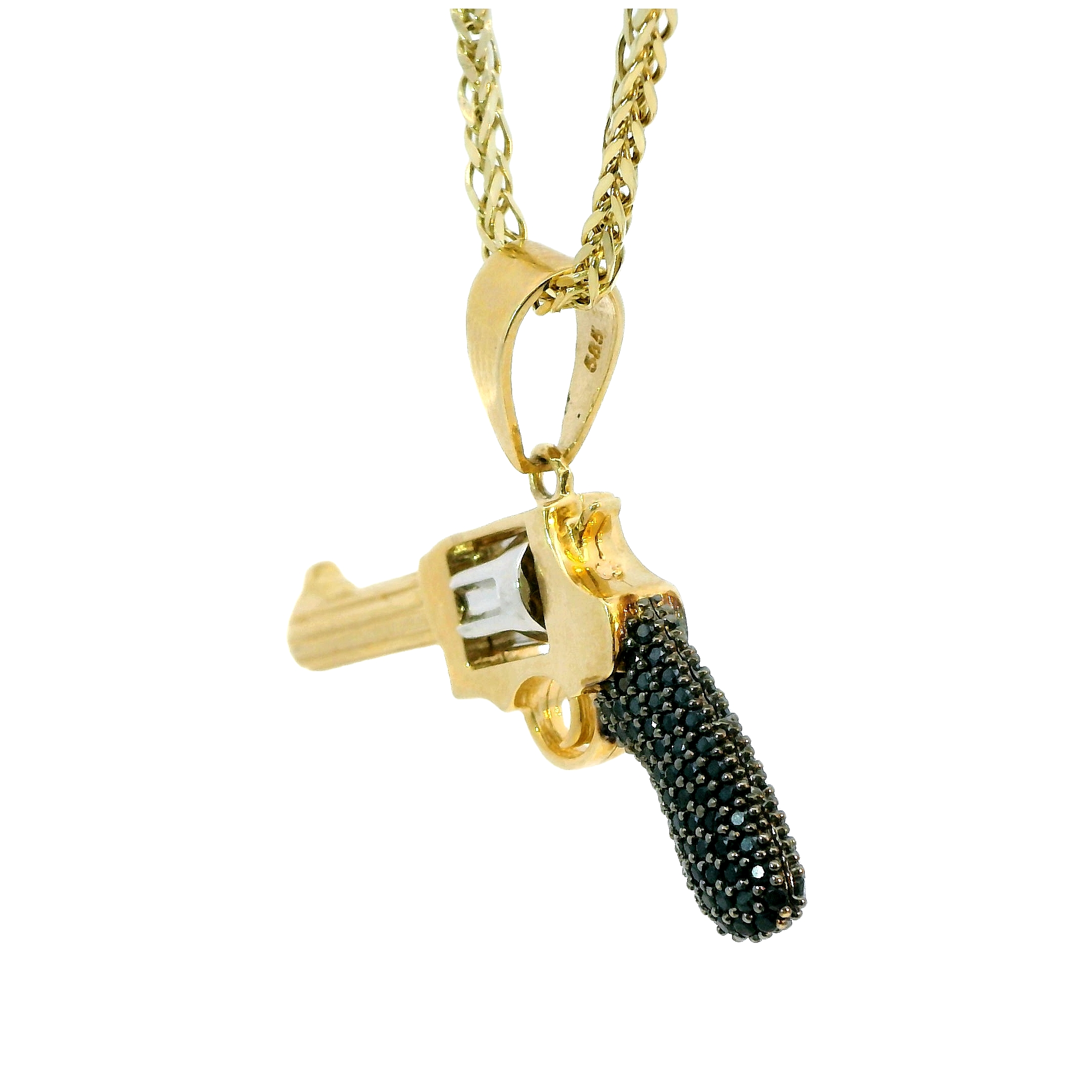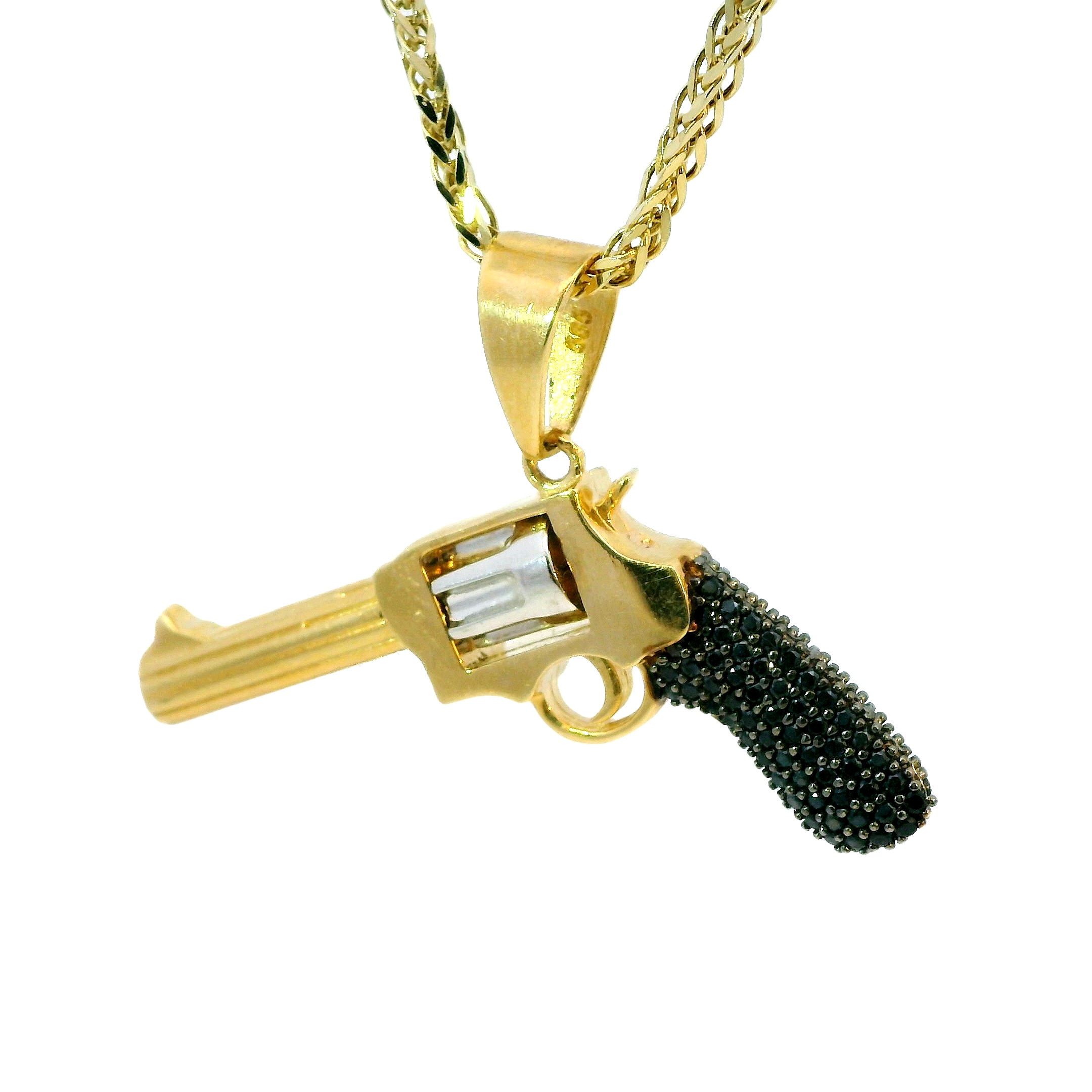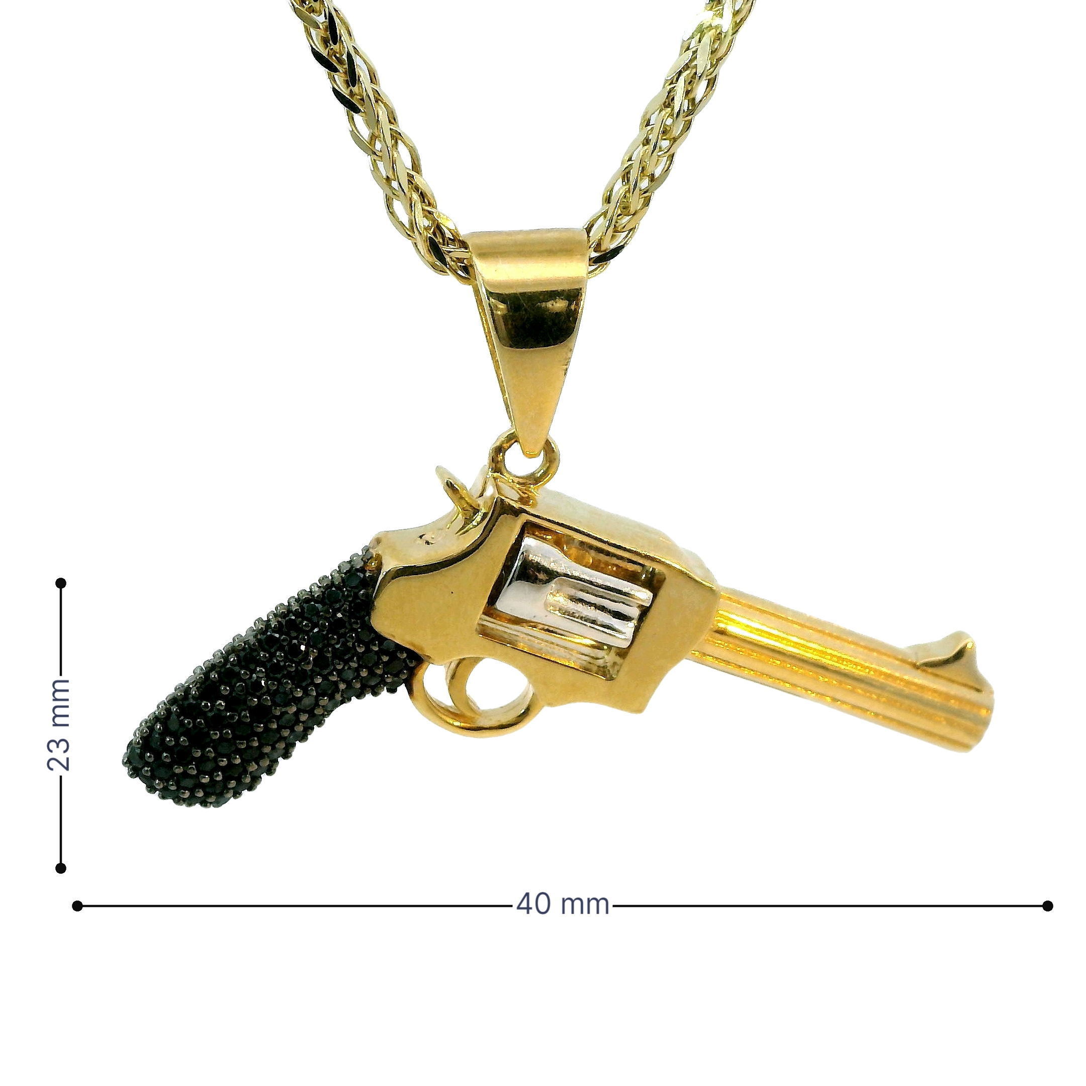 Deze hanger in de vorm van een pistool combineert twee tinten met finesse en geeft een gedurfde, eigentijdse look. Het pistool is verfijnd versierd met glinsterende zwarte zirkonia's, die een mysterieus en krachtig effect creëren. De mix van kleuren zorgt voor een stijlvol contrast, waardoor het sieraad opvalt zonder zijn elegantie te verliezen. Een perfect accessoire voor wie kracht en luxe in één statement wil verenigen.