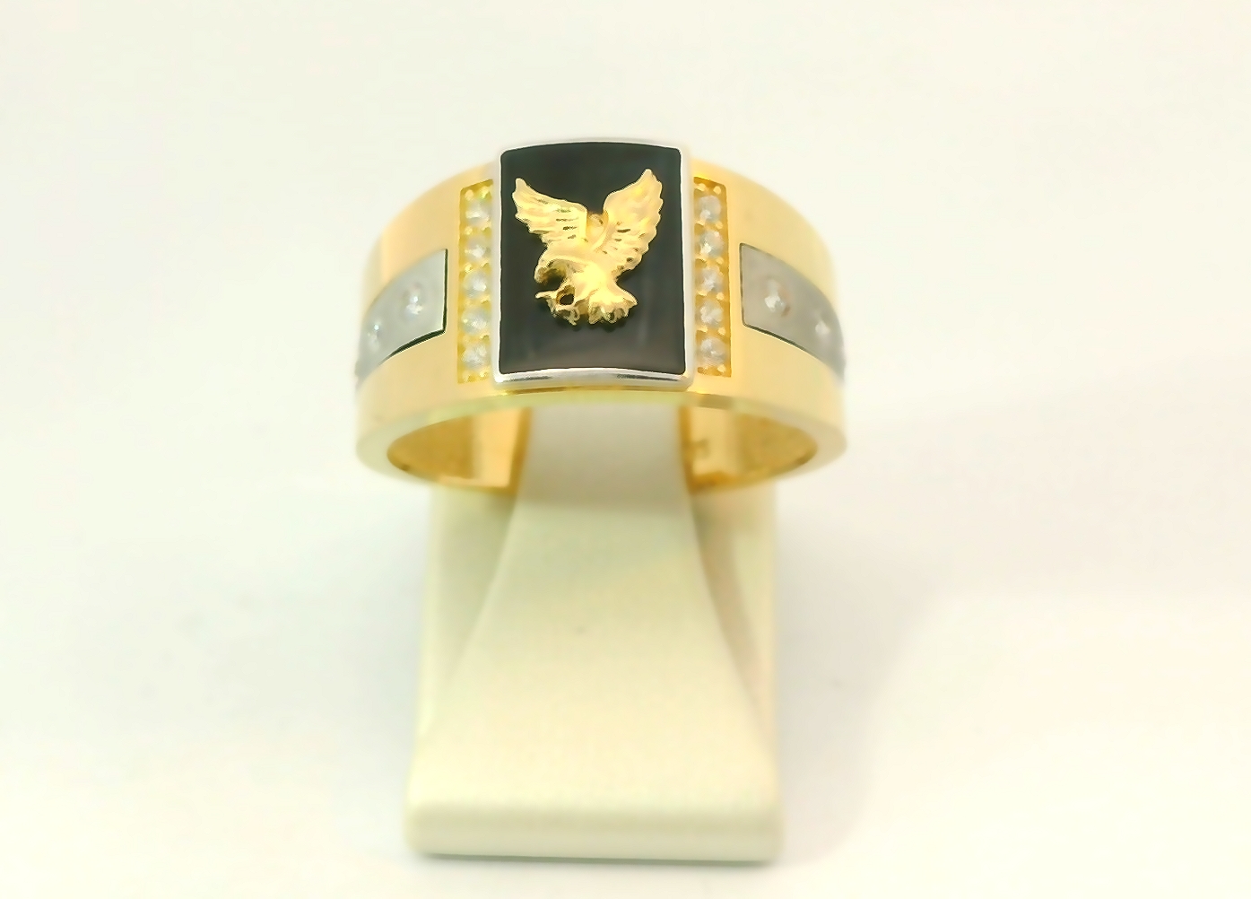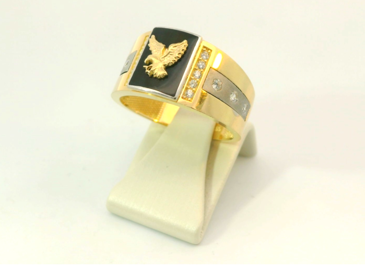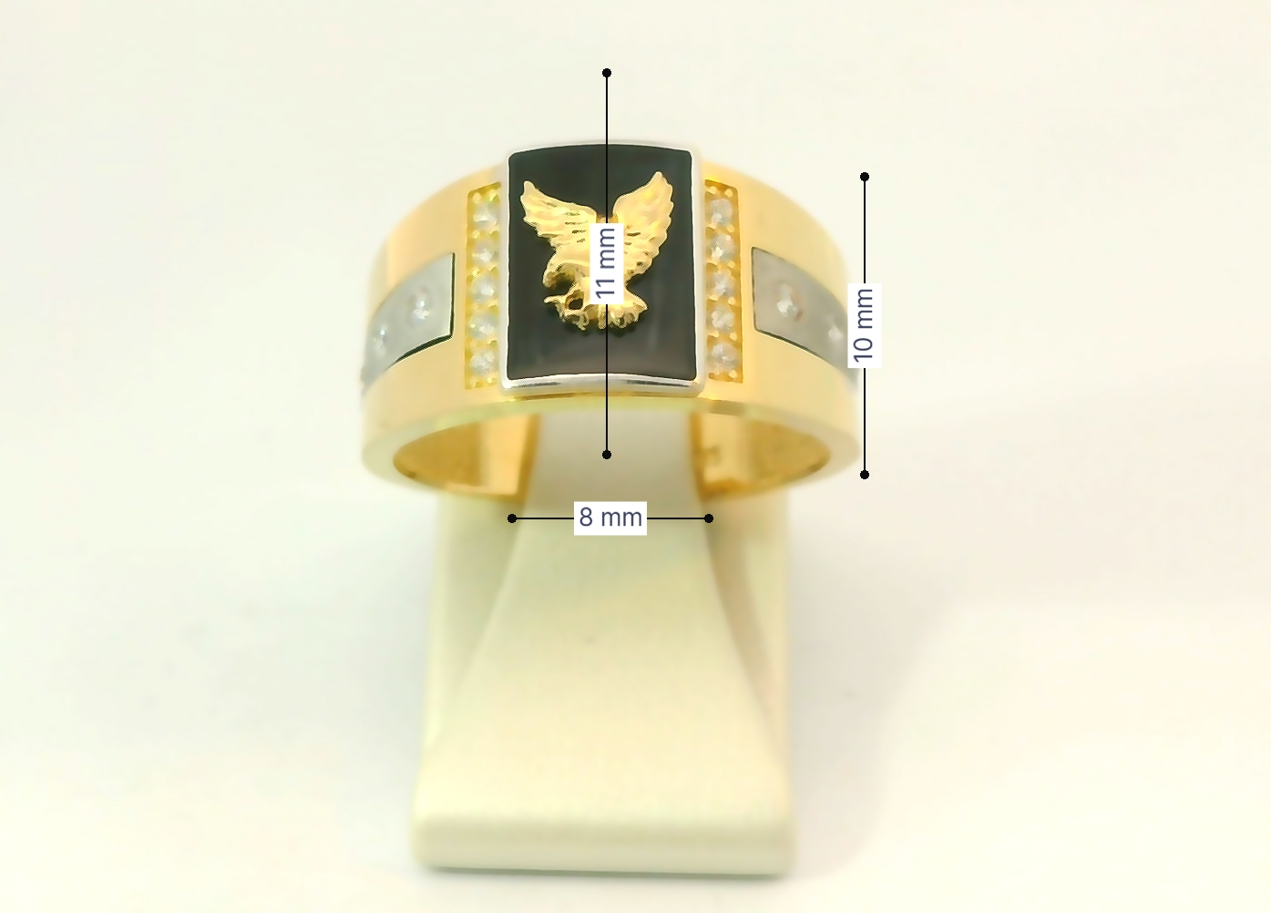 Deze prachtige bicolor herenring van 14 karaat goud heeft een stoere uitstraling met een onyx steen en een geelgouden adelaar die op de steen is geplaatst. De ring is perfect voor heren die van een opvallend en uniek sieraad houden. Draag deze ring alleen aan je ringvinger voor een stijlvolle look die zeker de aandacht zal trekken.