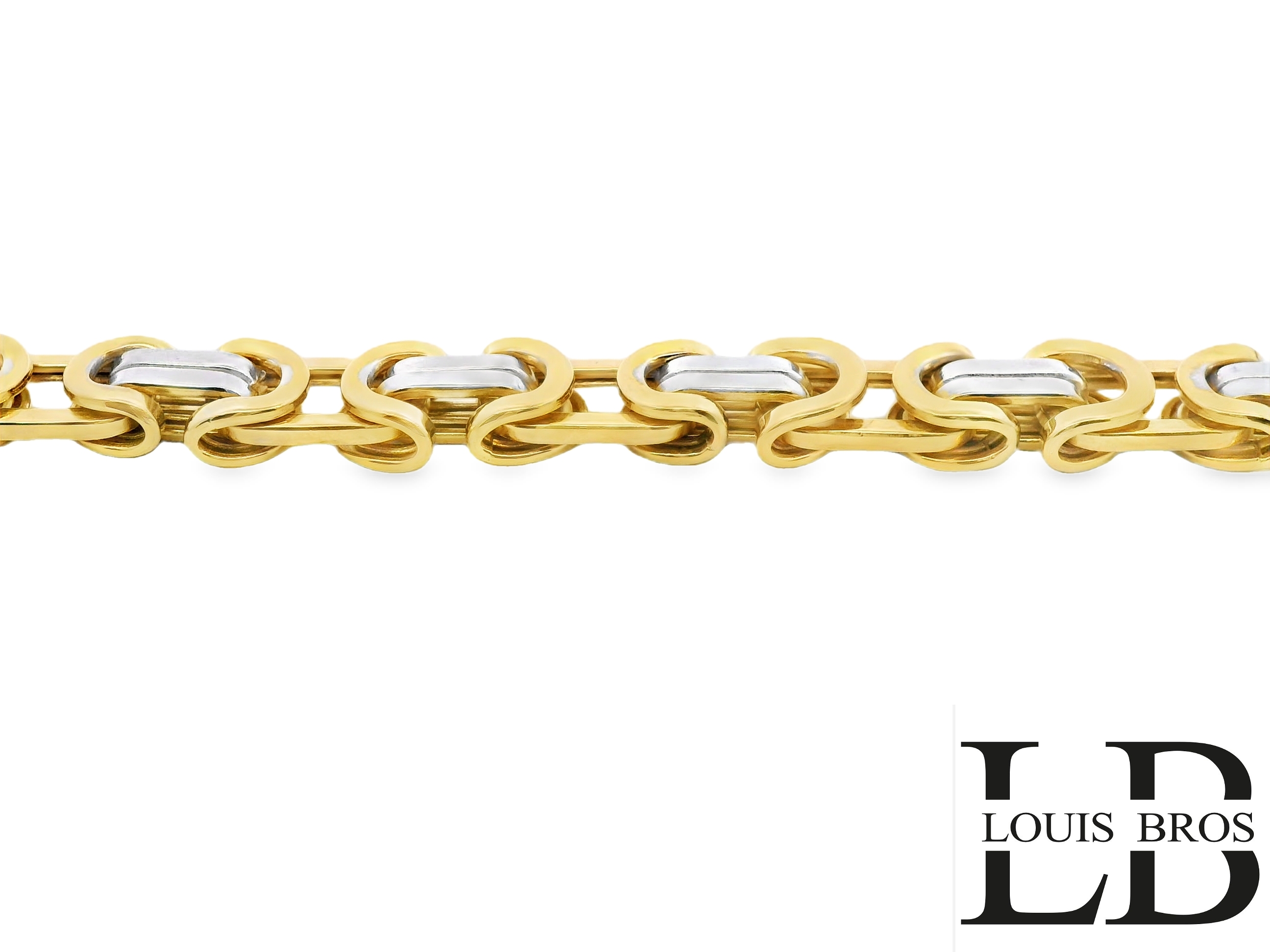 Deze koningsschakel collier van Louis Bros is vervaardigd uit 14 karaat bicolor (31.30 gr) .Het collier heeft een lengte van 65 cm en een breedte van 7.5. En een dikte van 5mm .De koningsschakel is een stoere blikvanger. Houd jij van stoer en opvallend? En draag je graag gouden sieraden? Dan is dit exemplaar echt iets voor jou!