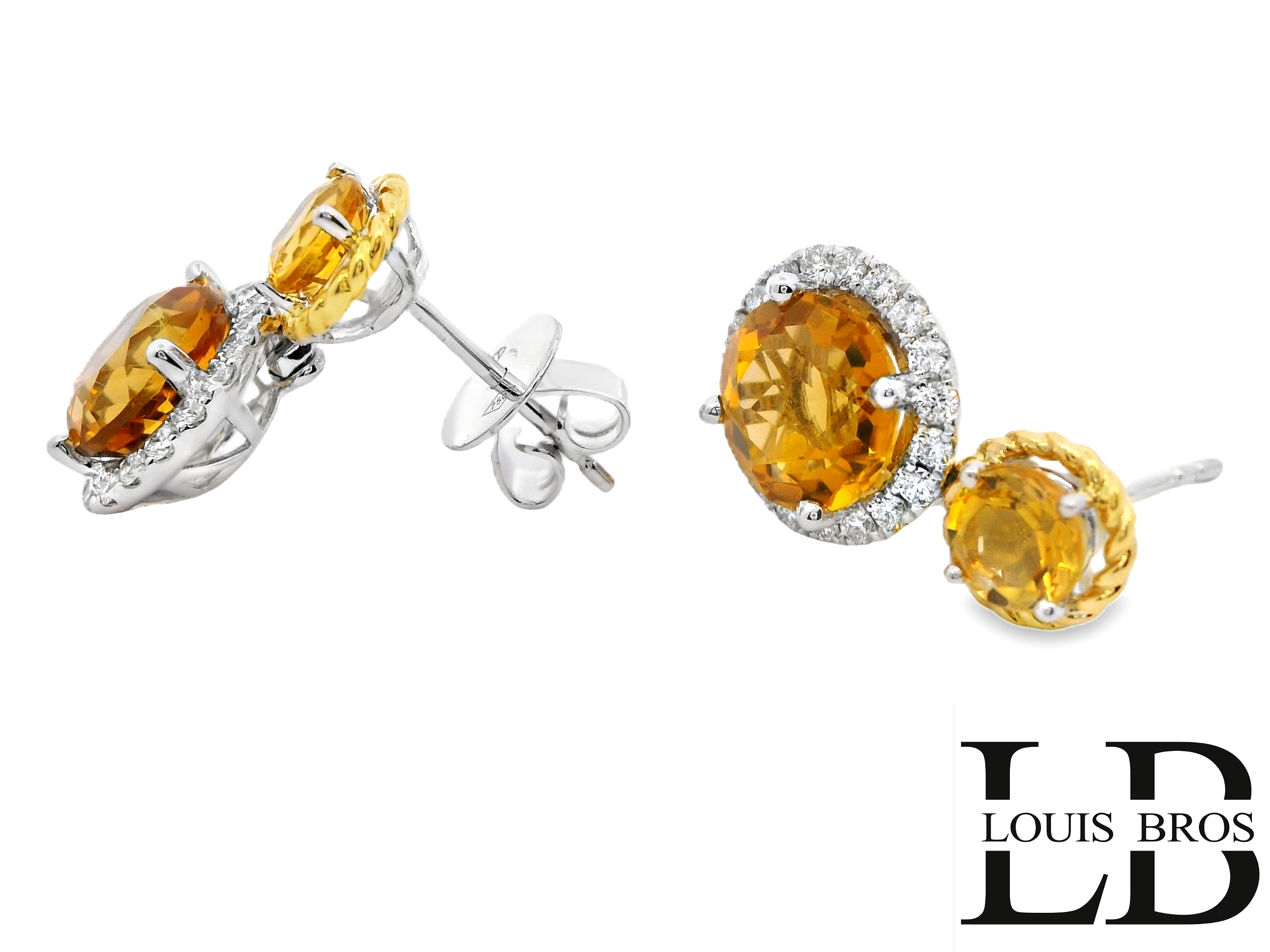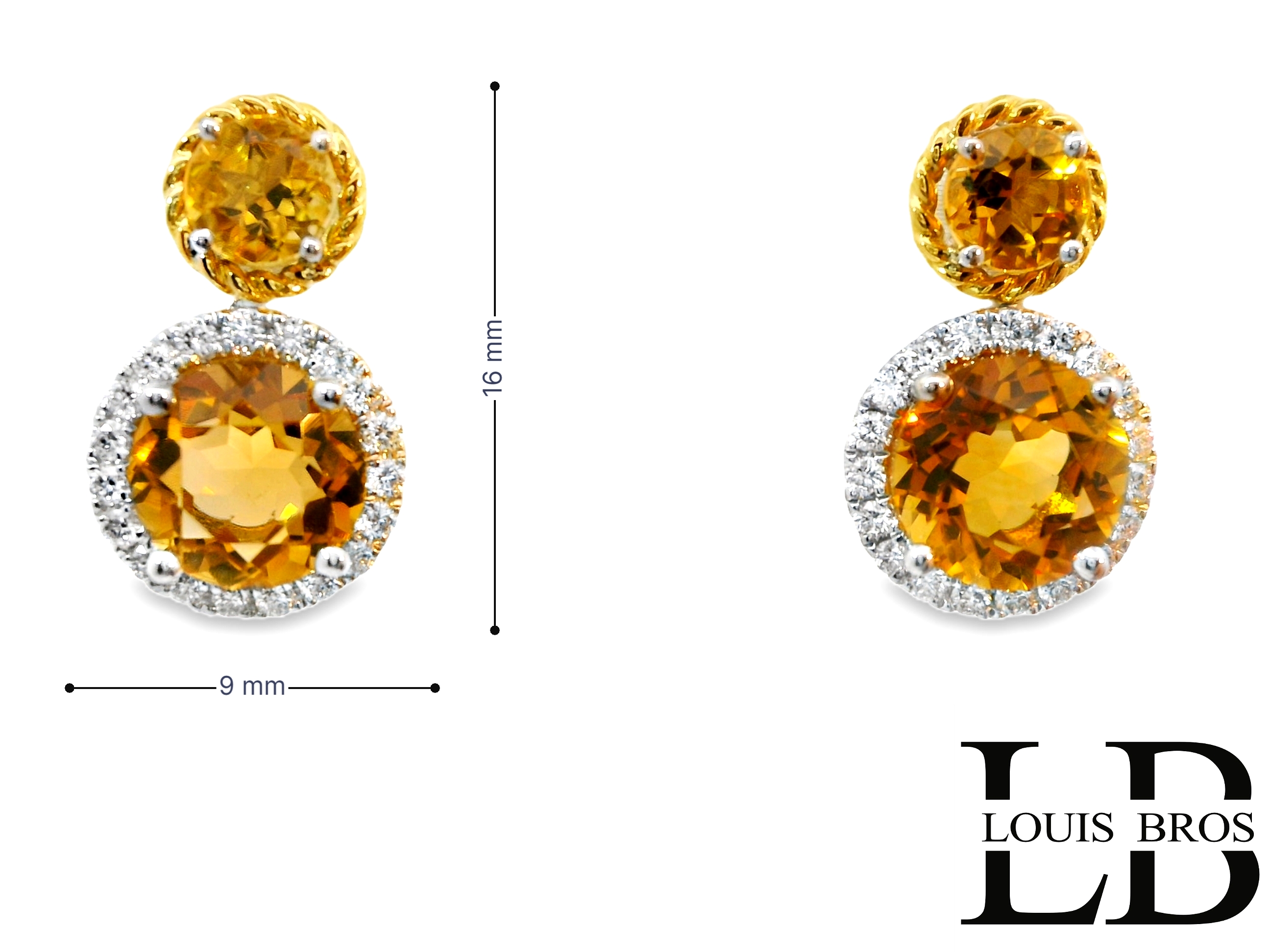Deze oorbellen van Louis Bros zijn vervaardigd uit 18 karaat bicolor (5.05 gr.) en zijn gezet met 4 citrien 4.62ct en 38 briljant geslepen diamanten met een totaalgewicht van 0.45 ct. De oorsieraden hebben een diameter van 16 mm en een breedte van 9 mm.