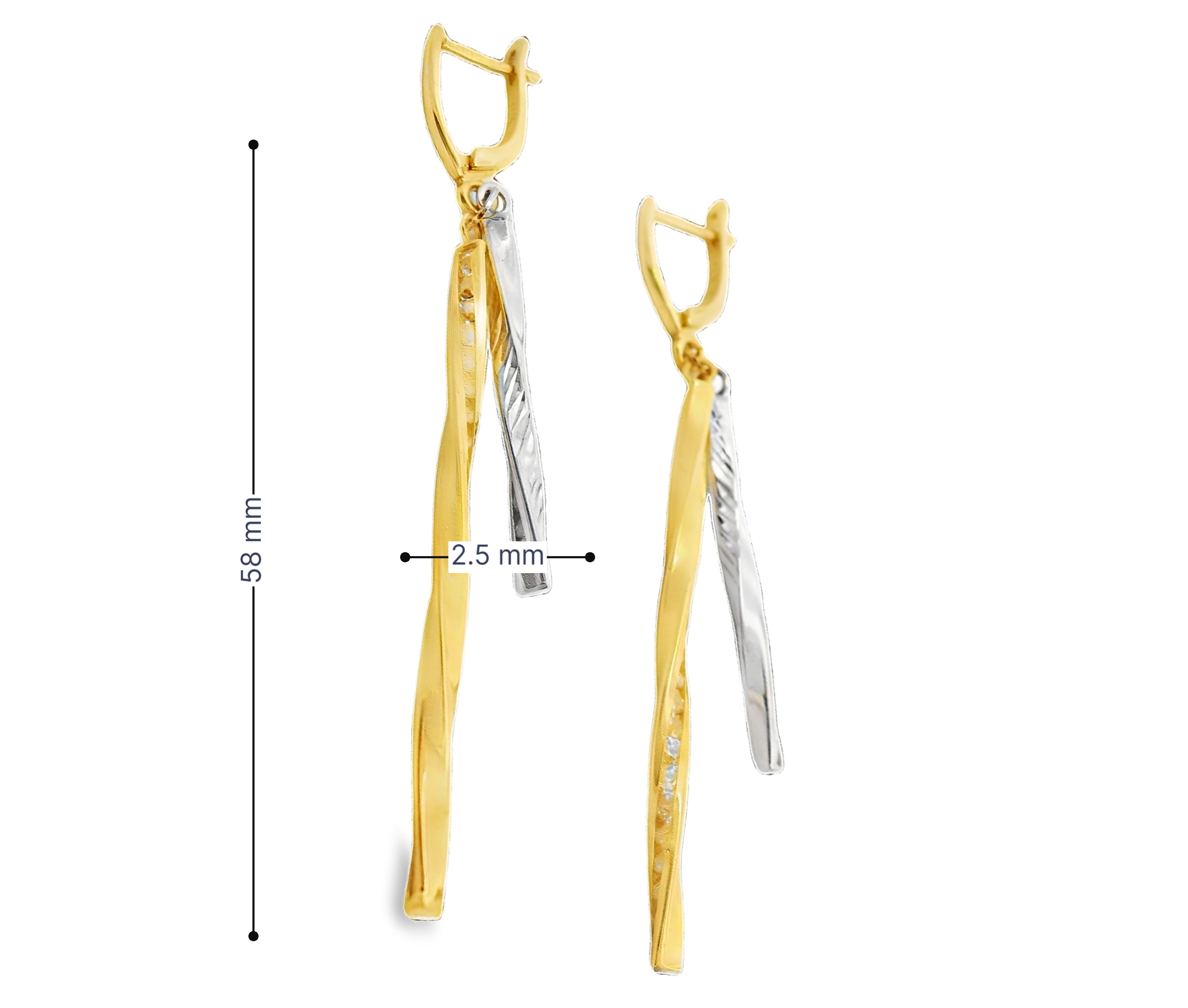 De geelgouden strook is verfijnd bezet met fonkelende zirkonia’s, die een schitterend lichteffect geven bij elke beweging. De witgouden strook heeft een elegante, bewerkte afwerking die de oorbellen een extra dimensie en karakter geeft.
