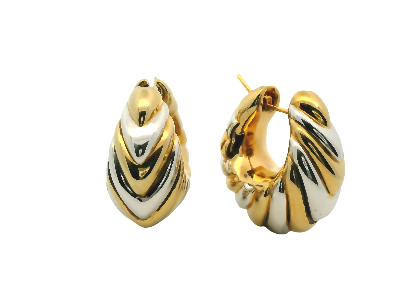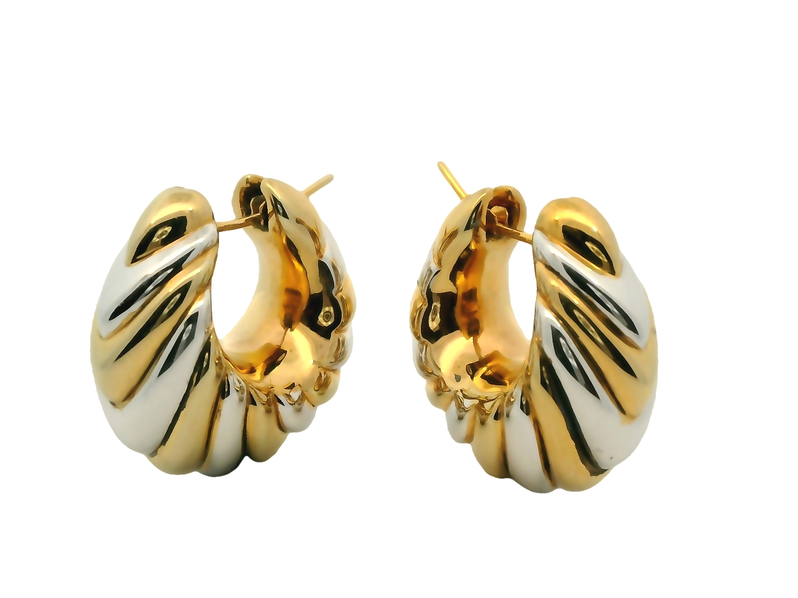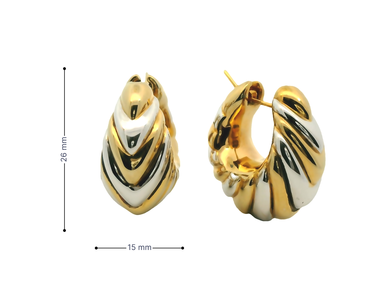 Deze elegante oorringen zijn gemaakt van 14 karaat bicolor (9.37 gr) en hebben een luxueus gedraaid ontwerp met een prachtige combinatie van geelgoud en witgoud. De geribbelde structuur zorgt voor een speels lichtspel, waardoor de oorbellen extra glans en diepte krijgen. Dankzij de stevige push-back sluiting blijven ze comfortabel en veilig zitten. Het tijdloze design maakt deze oorringen perfect voor zowel dagelijkse elegantie als speciale gelegenheden. Een verfijnde toevoeging aan elke sieradencollectie!