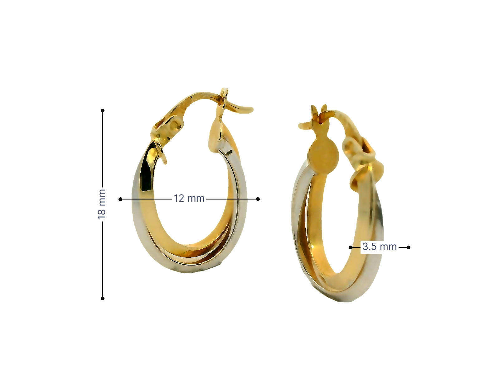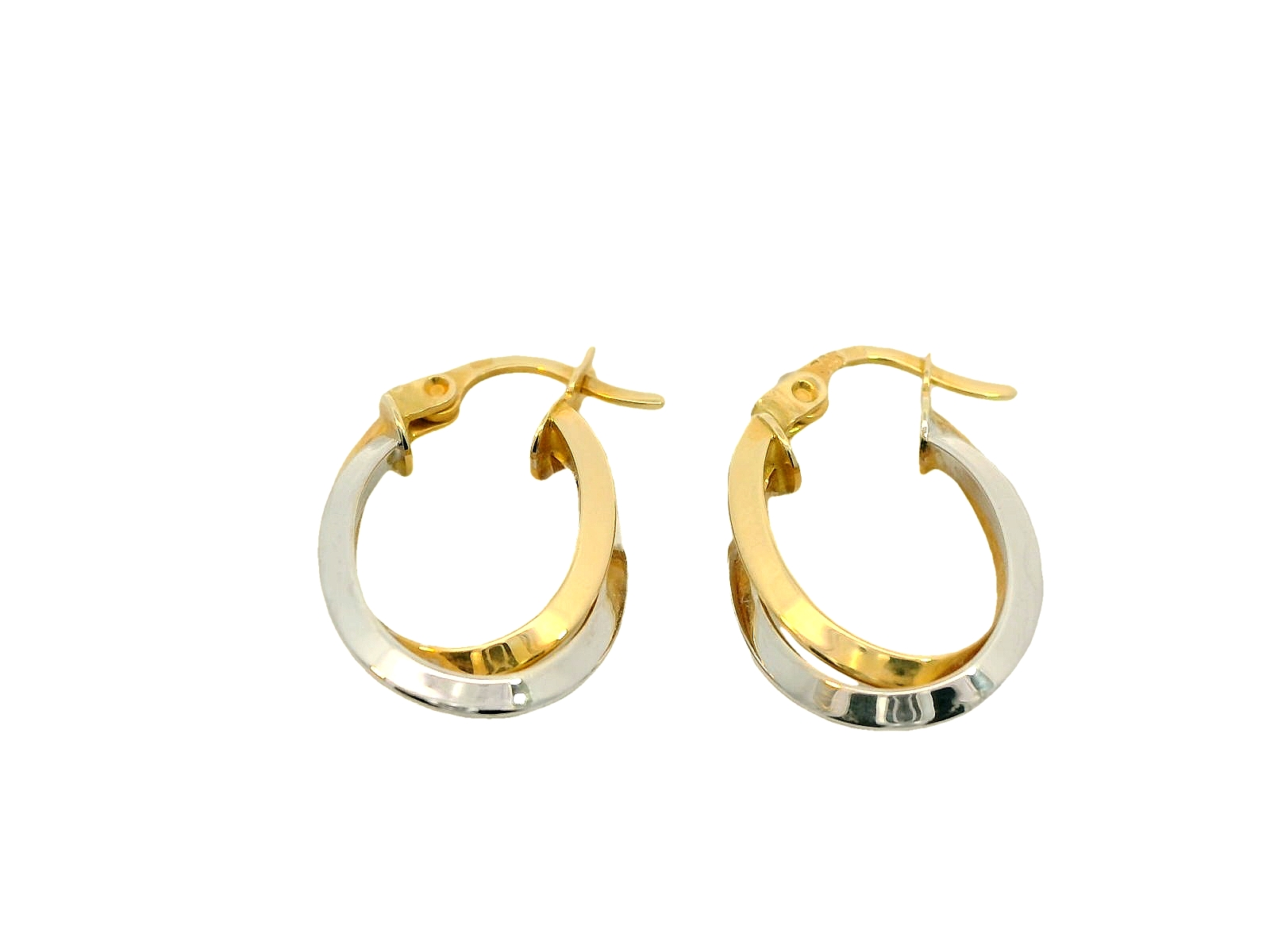 Deze elegante bicolor gouden oorringen van 14 karaat (1.80 gr) hebben een stijlvolle ovale vorm met twee speelse lijnen die zich sierlijk met elkaar verweven. De combinatie van geelgoud en witgoud zorgt voor een moderne en veelzijdige uitstraling. Dankzij de verfijnde afwerking en stevige sluiting zijn ze comfortabel en perfect voor zowel dagelijks gebruik als speciale gelegenheden. Een tijdloze toevoeging aan elke sieradencollectie!