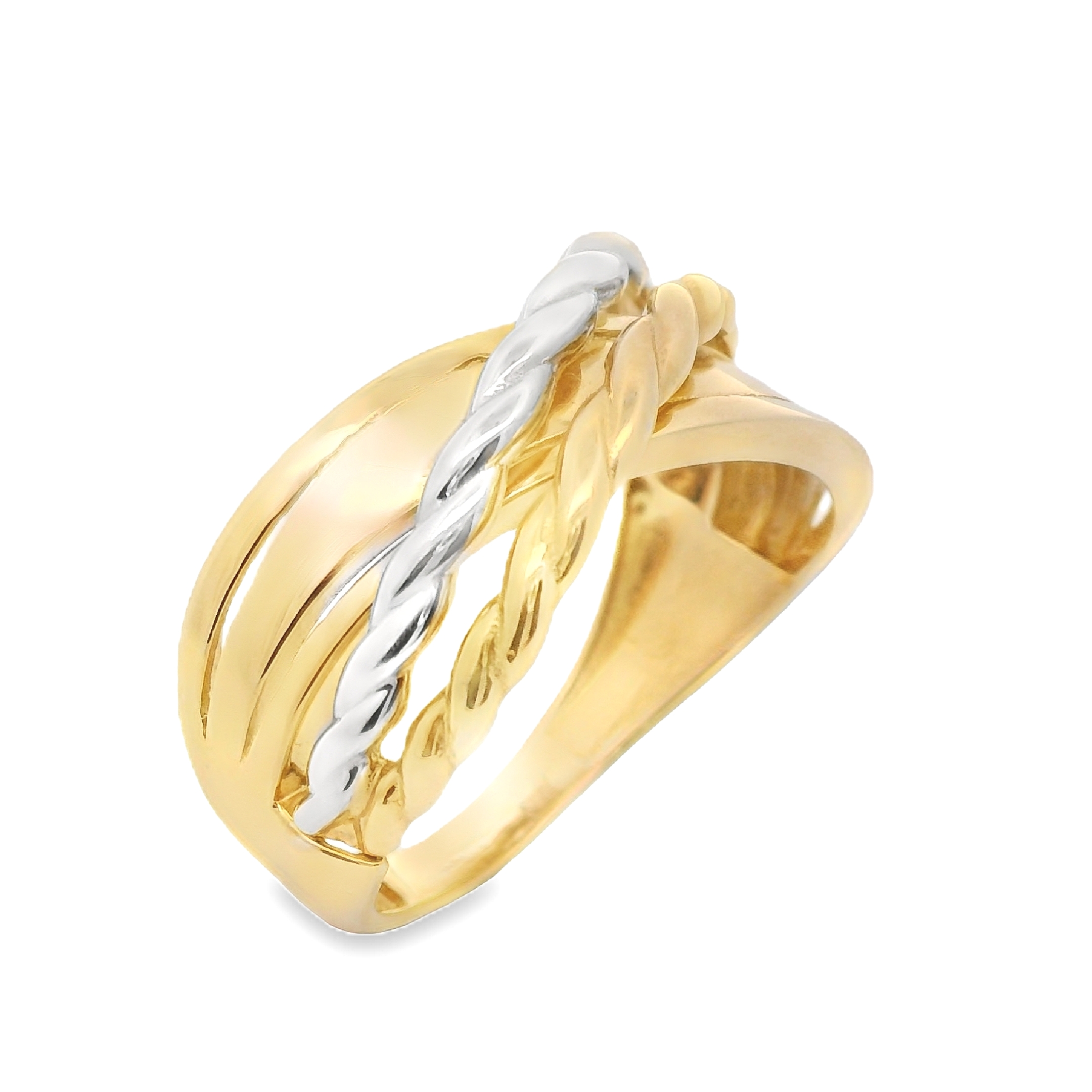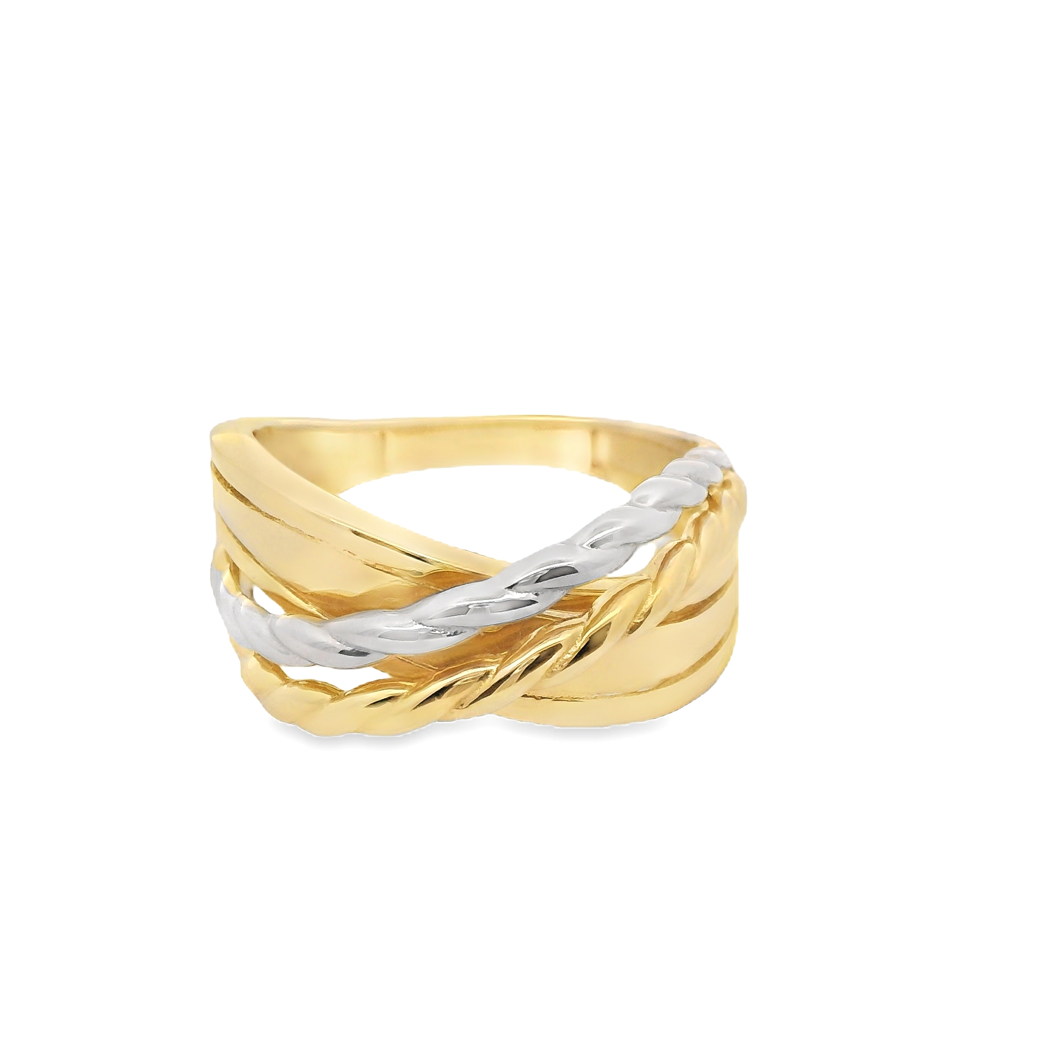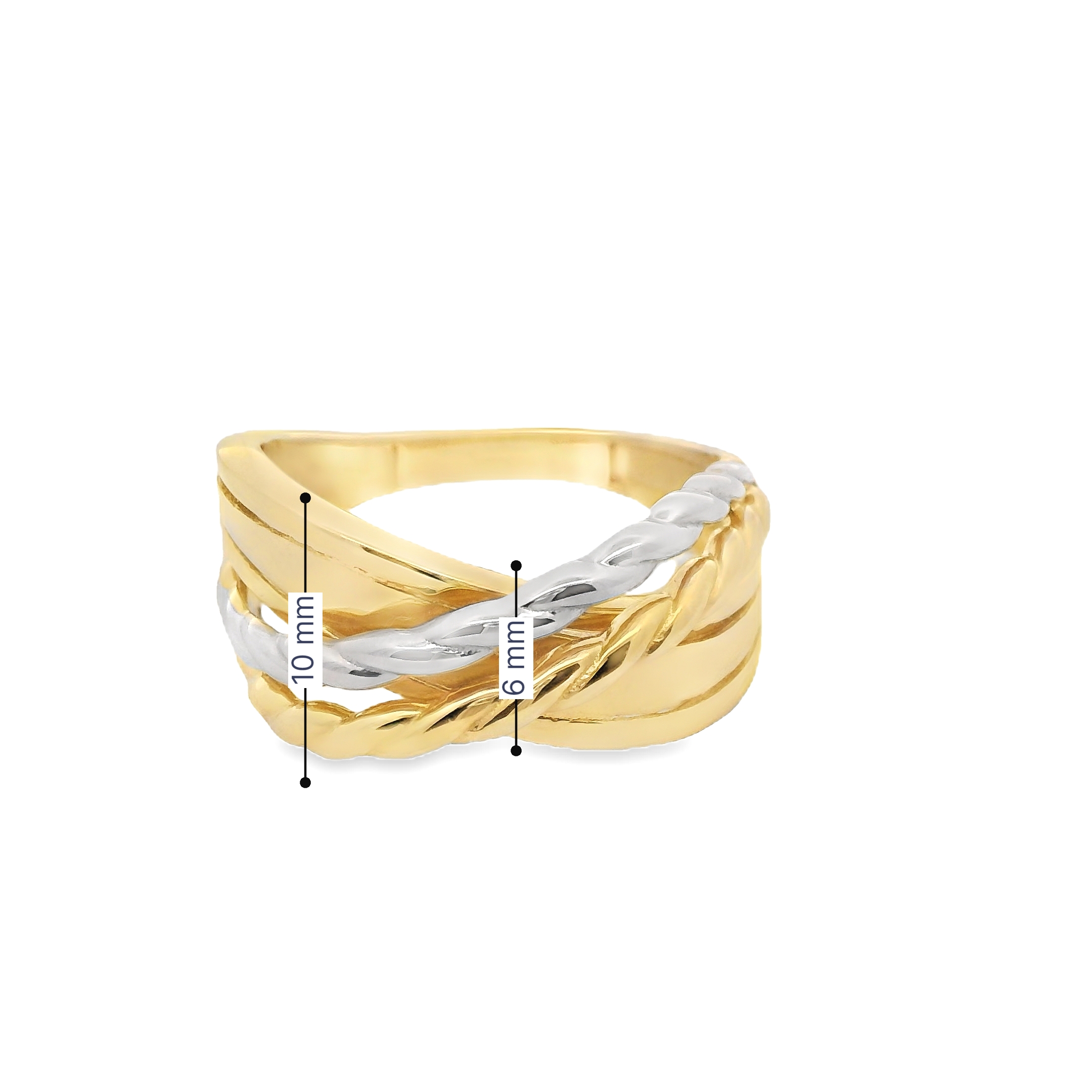 Deze betoverende ring is een prachtige combinatie van wit- en geelgoud, die samen een uniek bicolor ontwerp vormen. De ring straalt elegantie uit door zijn verfijnde lijnenpatroon, dat met precisie is aangebracht en een subtiel contrast biedt tussen de twee goudtinten. De strakke lijnen voegen een moderne twist toe aan het klassieke ontwerp, waardoor de ring zowel tijdloos als eigentijds is. Deze fantasierijke ring is niet alleen een schitterend sieraad, maar ook een symbool van verfijning en stijl, perfect voor elke gelegenheid.