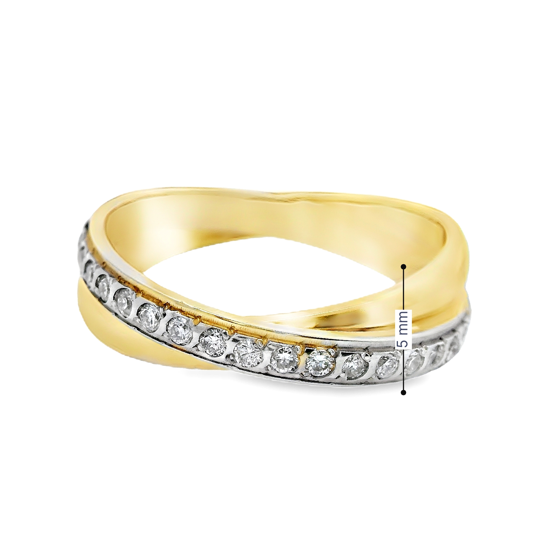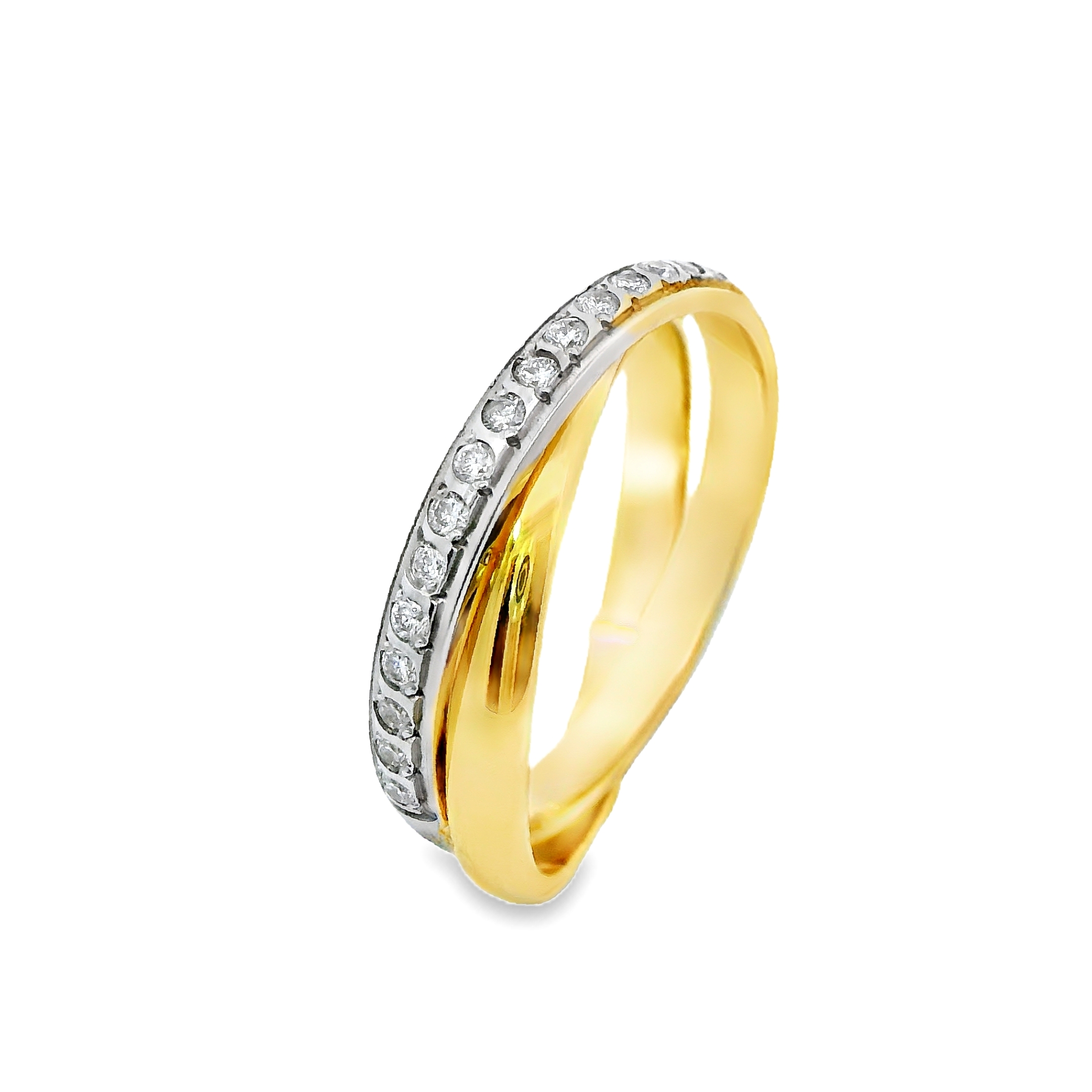 Deze ring met diamanten combineert het beste van twee werelden: de warme gloed van geelgoud en de koele elegantie van witgoud. Dit stijlvolle contrast geeft de ring een tijdloze en verfijnde uitstraling. De schitterende diamanten voegen een vleugje luxe en sprankeling toe, wat de ring perfect maakt voor zowel bijzondere gelegenheden als dagelijkse elegantie. Een bicolor gouden ring met diamanten is een veelzijdig sieraad dat moeiteloos elke outfit complimenteert en straalt met zijn unieke combinatie van kleuren en materialen.