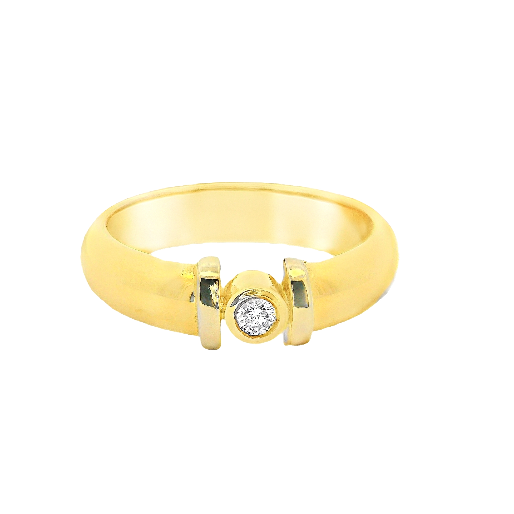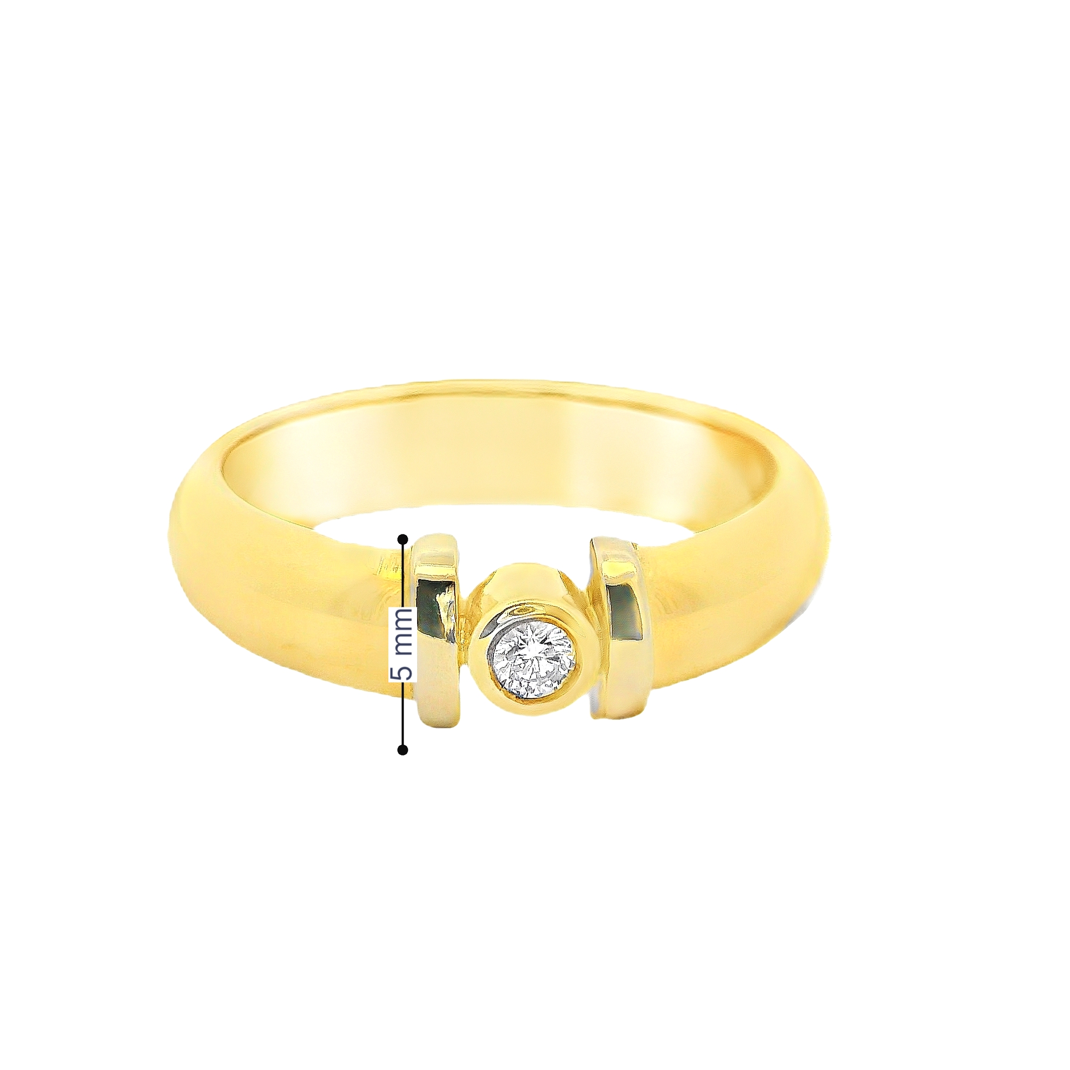 Deze ring van Louis Bros is vervaardigd uit 14 karaat bicolor (7 gr.) en is gezet met 1 briljant geslepen diamanten met een totaalgewicht van 0.10ct. De ring heeft een breedte van 5 mm en een dikte van 2 mm. Deze ring bestaat uit onze lijn van exclusieve modellen sieraden met prachtige designs van hoge kwaliteit.