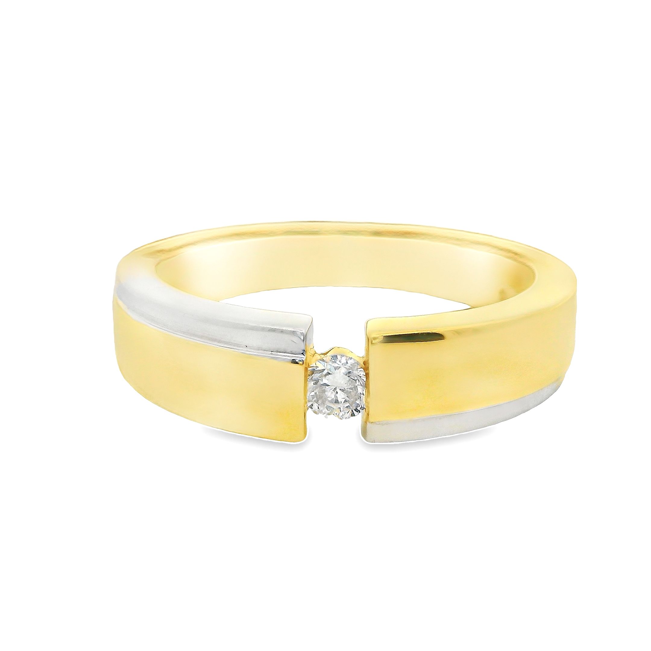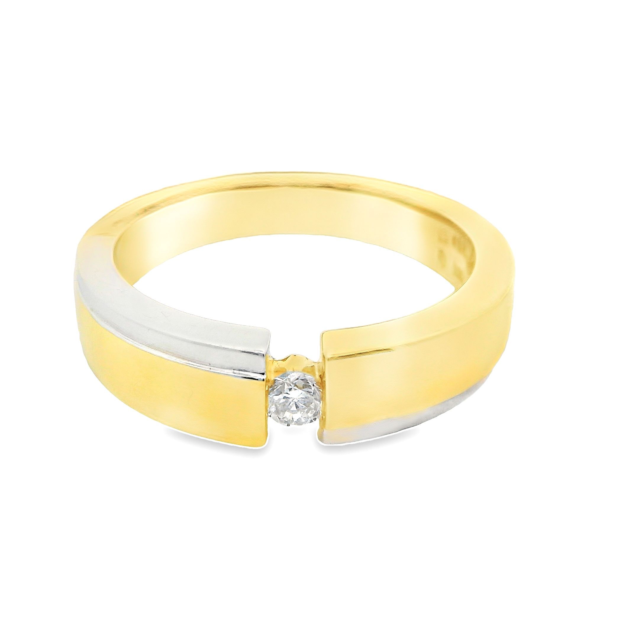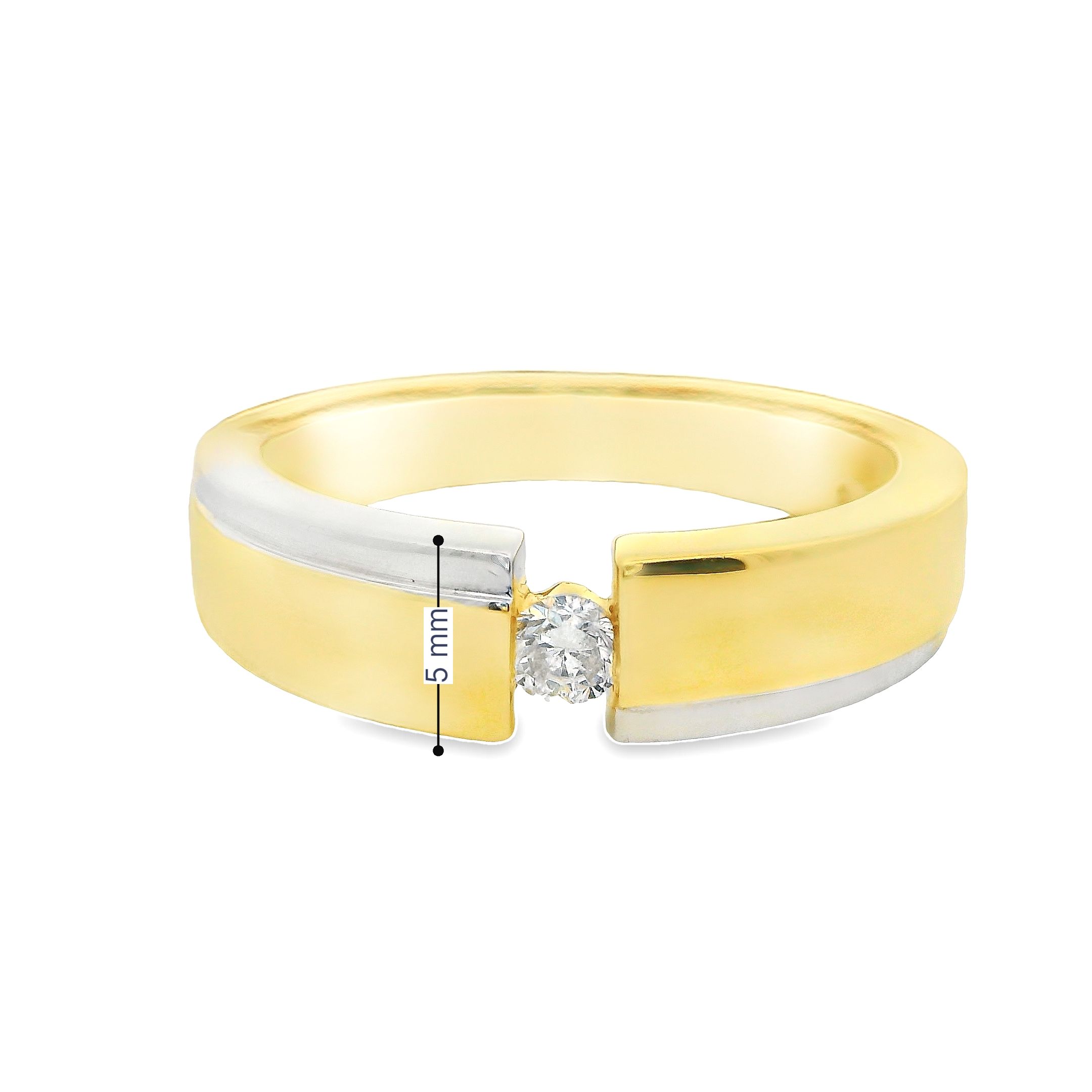 Deze exclusieve ring van Louis Bros is vervaardigd uit 14 karaat bicolor (6.90 gr.) en is gezet met 1 briljant geslepen diamanten met een totaalgewicht van 0.10 ct. De ring heeft een breedte van 5 mm en dikte van 3 mm. Met deze ring om je vinger ben jij het stralende middelpunt bij elke gelegenheid. Deze ring bestaat uit onze lijn van exclusieve modellen sieraden met prachtige designs en van hoge kwaliteit.