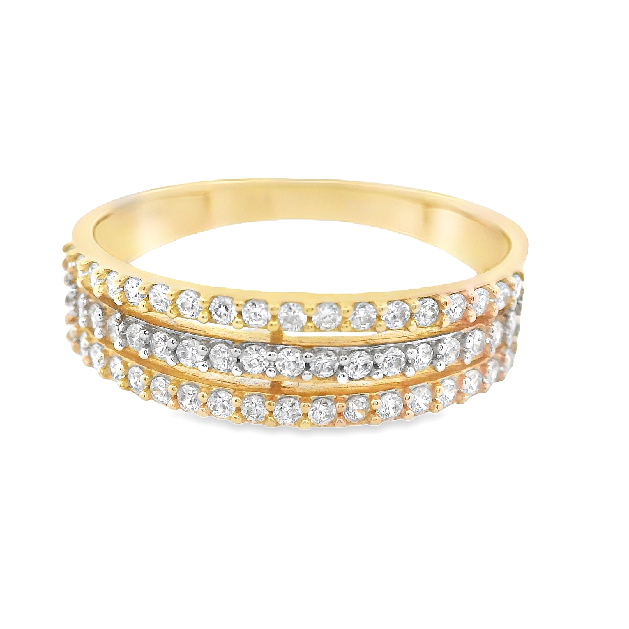 Deze ring combineert de luxe van geelgoud met de strakke uitstraling van witgoud in een modern design. Versierd met sprankelende zirkonia-steentjes, voegt deze ring een vleugje glans en elegantie toe. Het subtiele contrast van de metalen en de schittering van de zirkonia maken dit sieraad tot een verfijnd statementstuk, perfect voor elke moderne vrouw die houdt van tijdloze schoonheid met een eigentijdse twist.