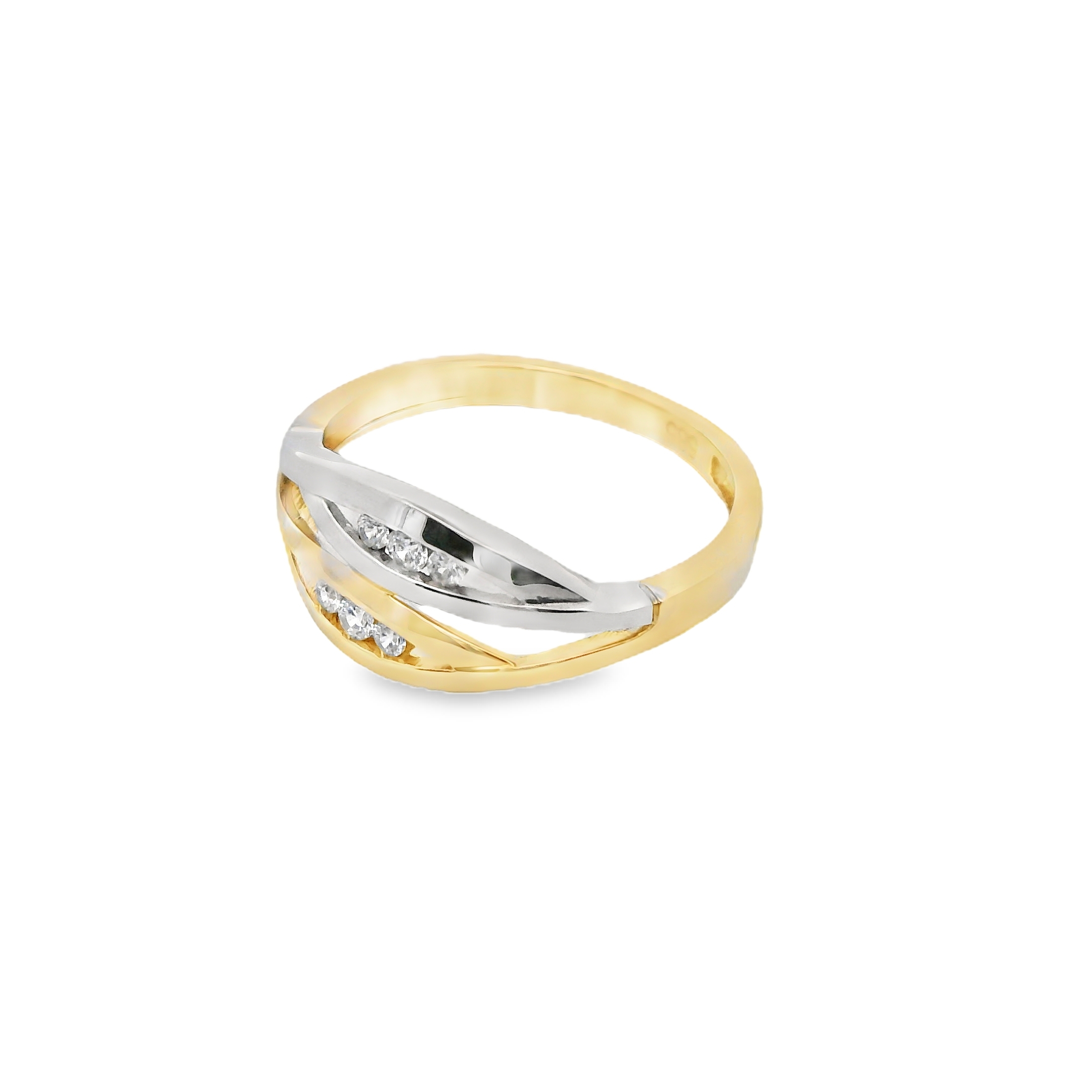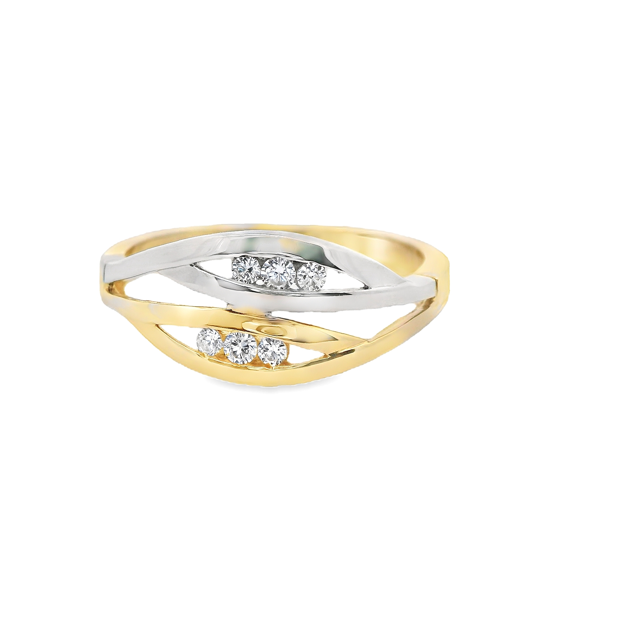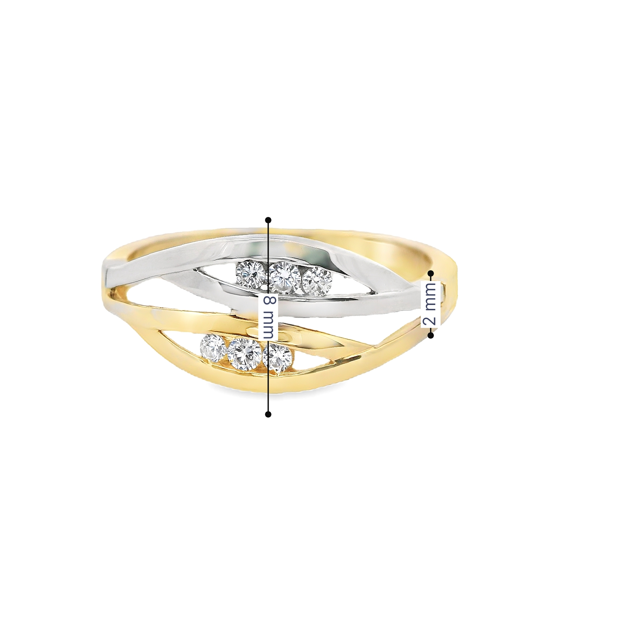 Deze ring combineert de luxe van geelgoud met de strakke uitstraling van witgoud in een modern design. Versierd met sprankelende zirkonia-steentjes, voegt deze ring een vleugje glans en elegantie toe. Het subtiele contrast van de metalen en de schittering van de zirkonia maken dit sieraad tot een verfijnd statementstuk, perfect voor elke moderne vrouw die houdt van tijdloze schoonheid met een eigentijdse twist.