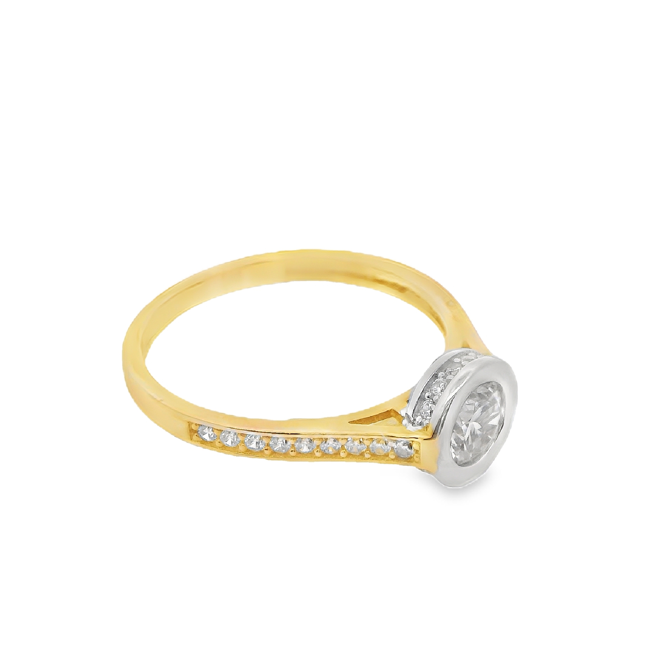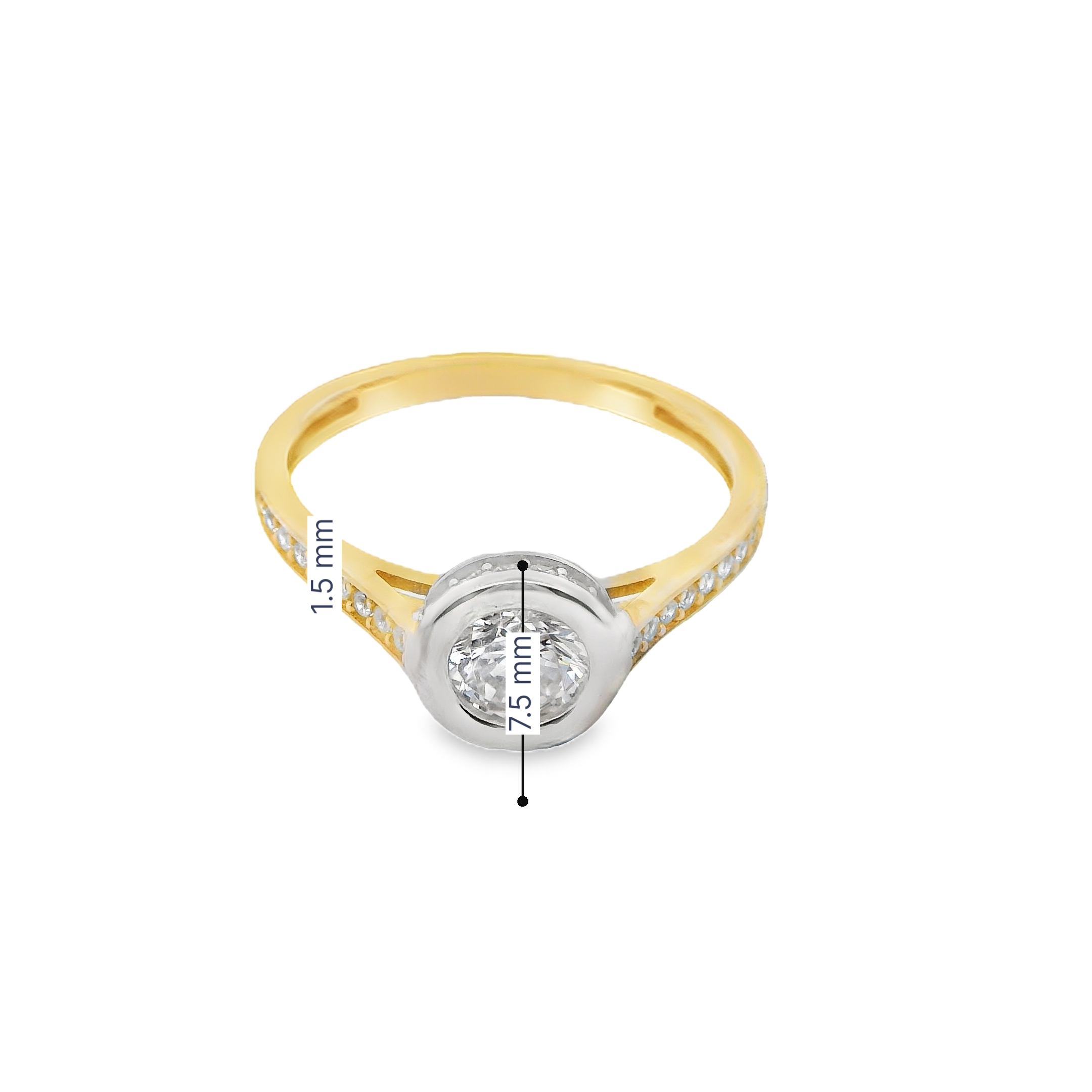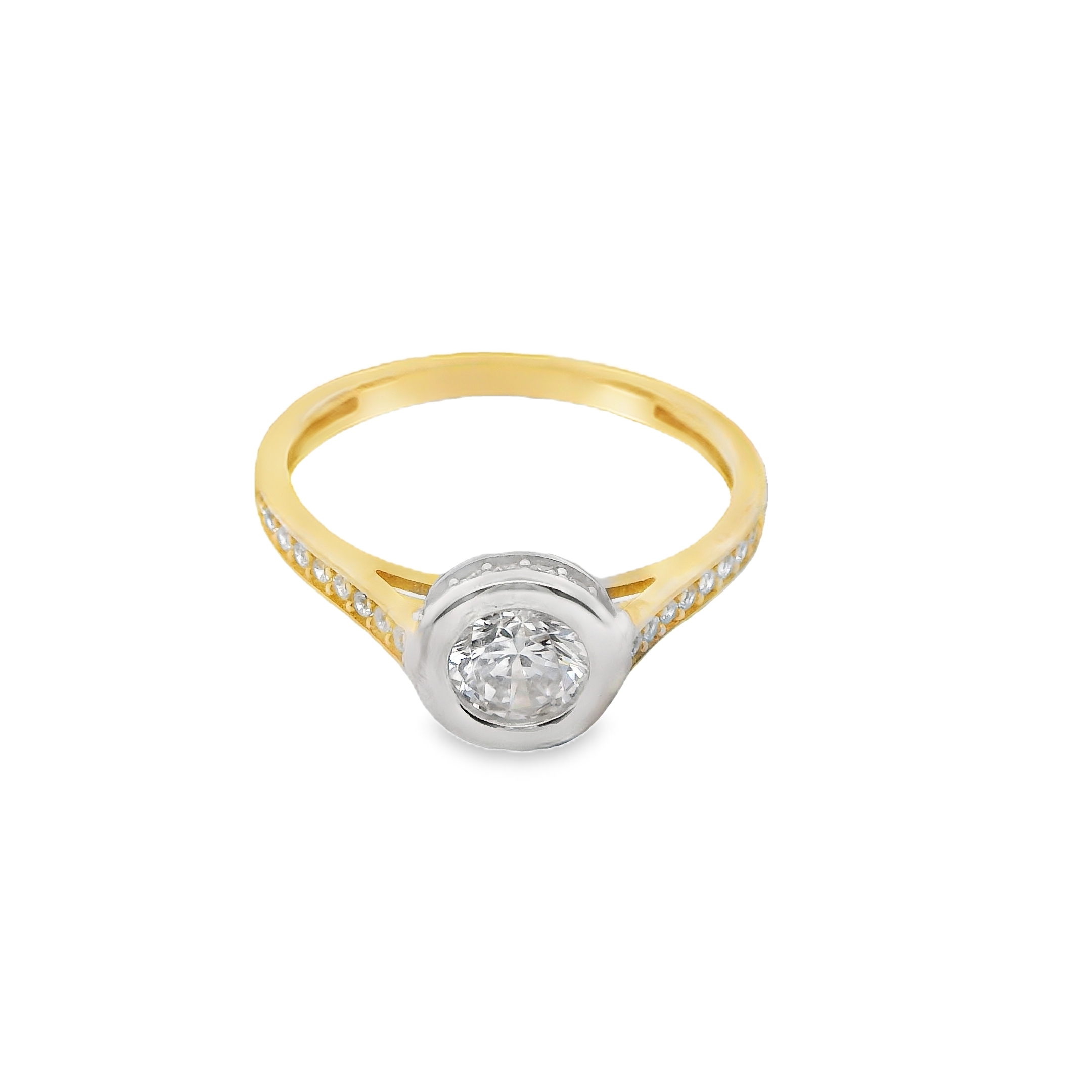 Deze ring combineert de luxe van geelgoud met de strakke uitstraling van witgoud in een modern design. Versierd met sprankelende zirkonia-steentjes, voegt deze ring een vleugje glans en elegantie toe. Het subtiele contrast van de metalen en de schittering van de zirkonia maken dit sieraad tot een verfijnd statementstuk, perfect voor elke moderne vrouw die houdt van tijdloze schoonheid met een eigentijdse twist.