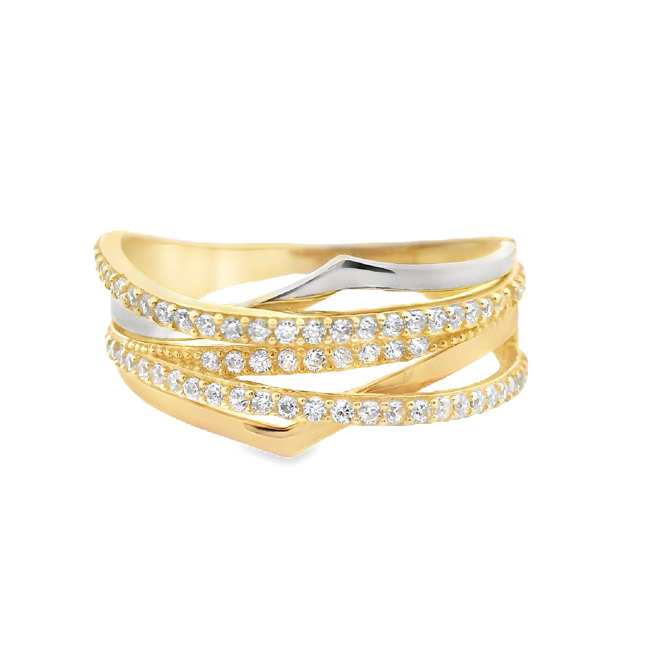 Deze ring combineert de luxe van geelgoud met de strakke uitstraling van witgoud in een modern design. Versierd met sprankelende zirkonia-steentjes, voegt deze ring een vleugje glans en elegantie toe. Het subtiele contrast van de metalen en de schittering van de zirkonia maken dit sieraad tot een verfijnd statementstuk, perfect voor elke moderne vrouw die houdt van tijdloze schoonheid met een eigentijdse twist.