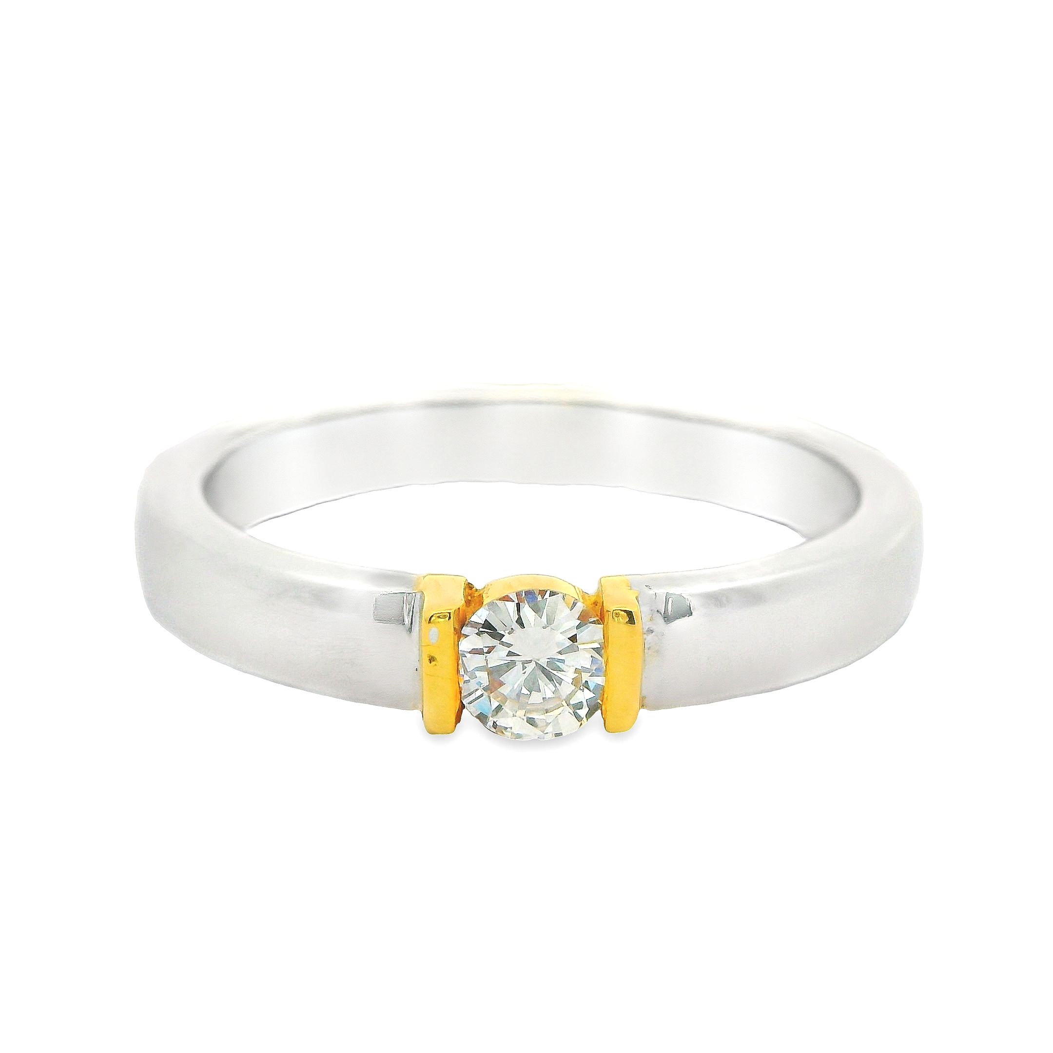 Deze ring is een prachtig en uniek sieraad. De combinatie van het koele witgoud en de warme geelgouden zetting zorgt voor een opvallend contrast, terwijl de centrale diamant een schitterend middelpunt vormt. Dit elegante ontwerp straalt zowel moderniteit als klassieke charme uit, waardoor het een ideale keuze is voor bijzondere gelegenheden zoals verlovingen of jubilea. Het samenspel van edelmetalen en de fonkelende diamant maakt deze ring tot een tijdloos meesterwerk dat generaties lang gekoesterd zal worden.