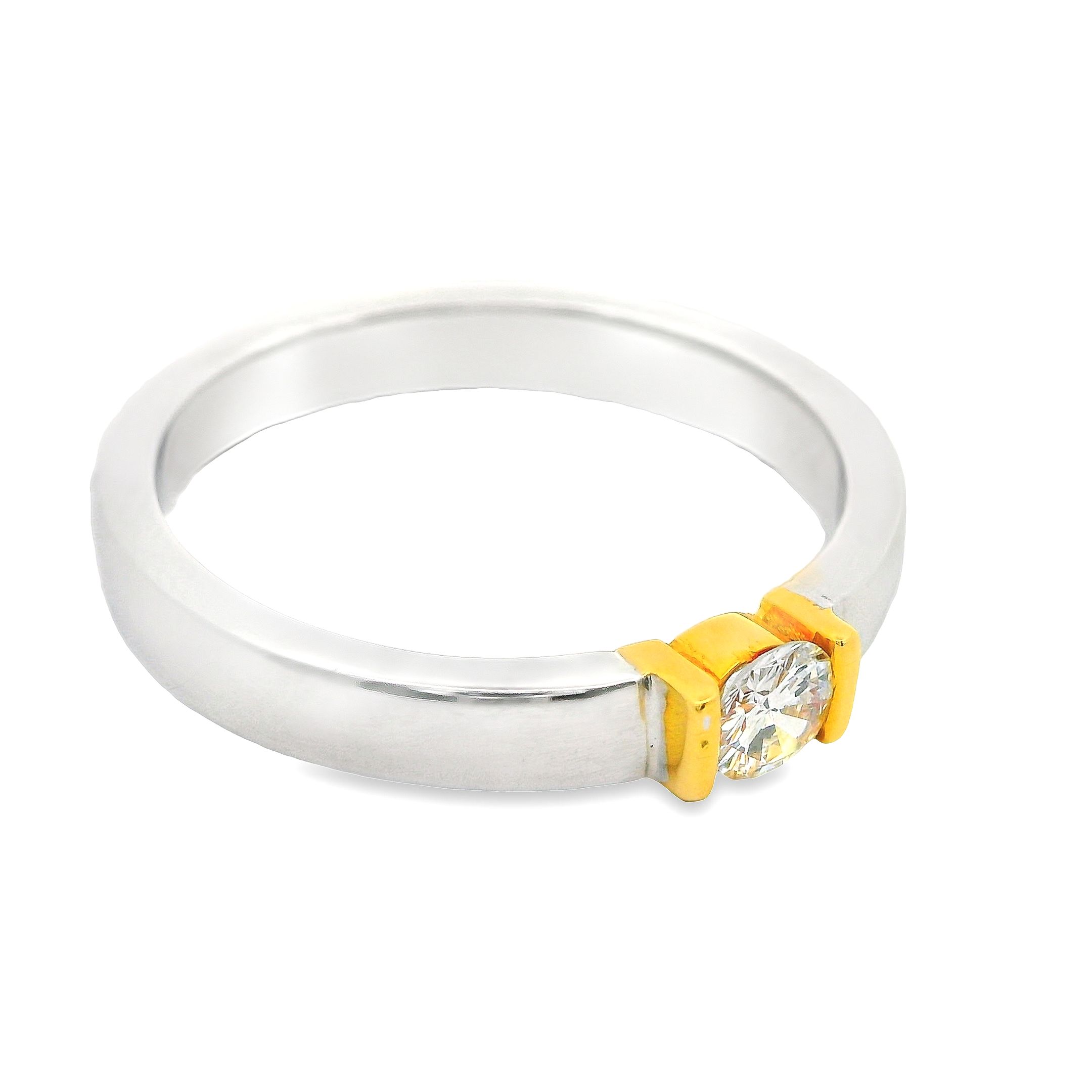 Deze ring is een prachtig en uniek sieraad. De combinatie van het koele witgoud en de warme geelgouden zetting zorgt voor een opvallend contrast, terwijl de centrale diamant een schitterend middelpunt vormt. Dit elegante ontwerp straalt zowel moderniteit als klassieke charme uit, waardoor het een ideale keuze is voor bijzondere gelegenheden zoals verlovingen of jubilea. Het samenspel van edelmetalen en de fonkelende diamant maakt deze ring tot een tijdloos meesterwerk dat generaties lang gekoesterd zal worden.