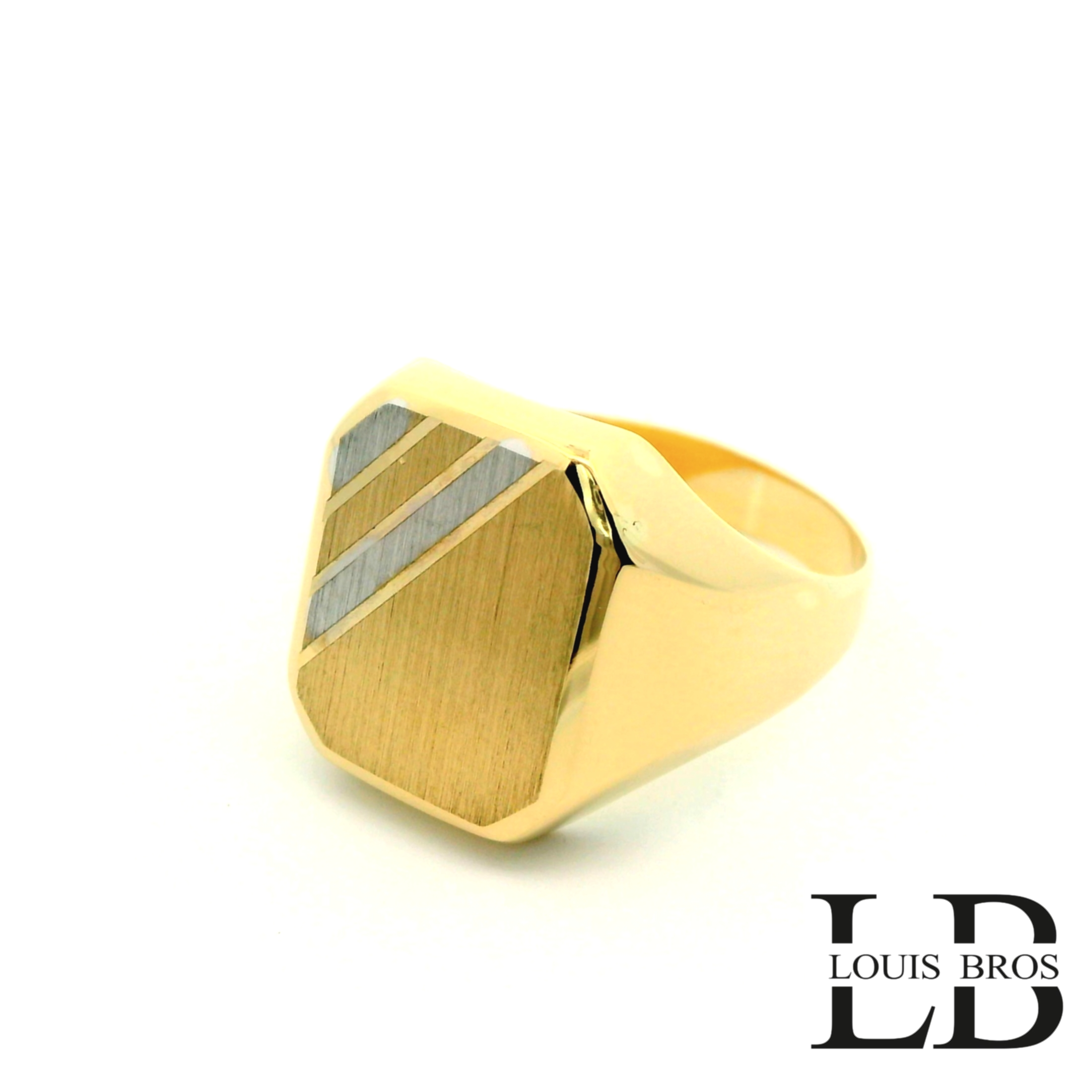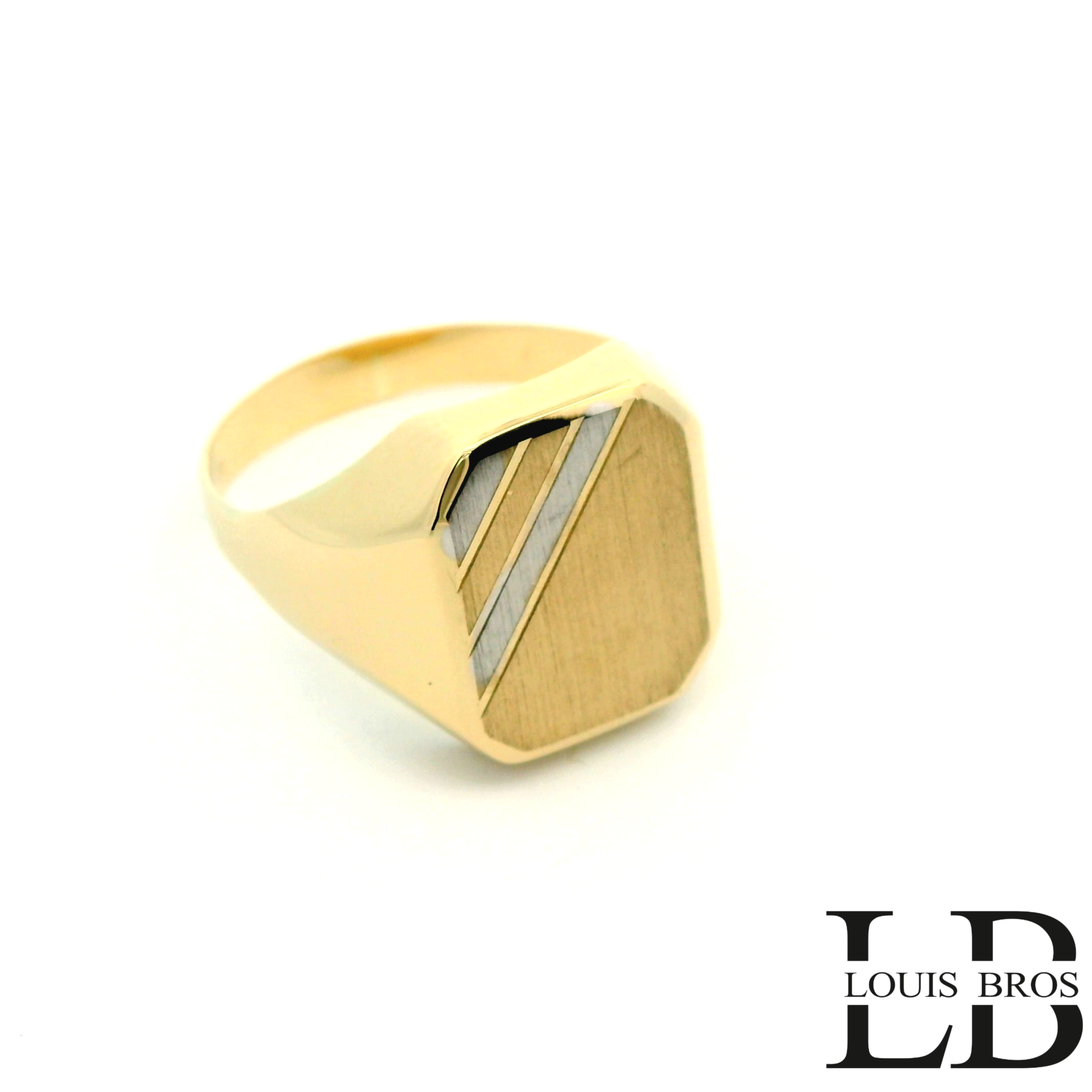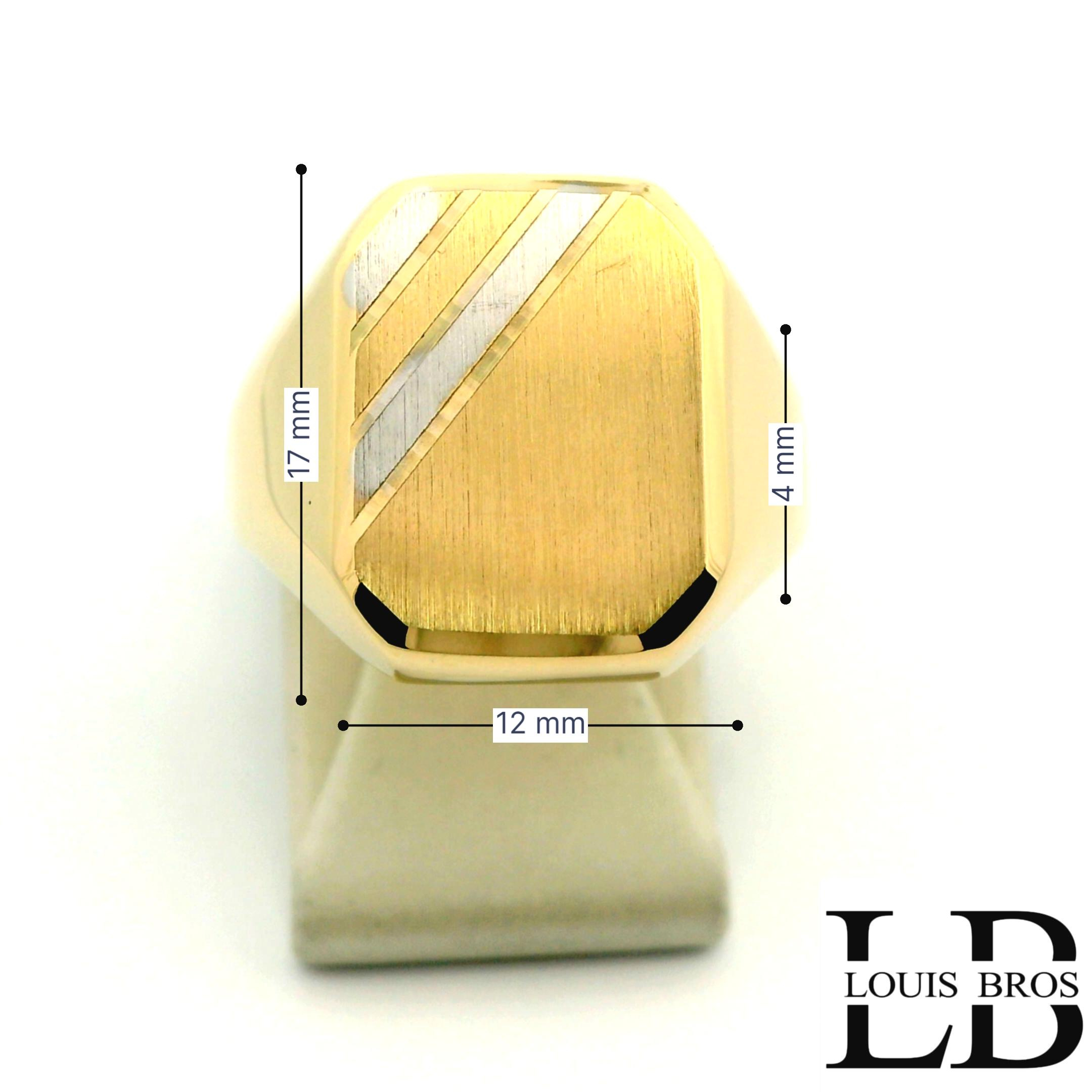 Deze heren zegelring is vervaardigd uit hoogwaardig 14 karaat bicolor goud (4.35 gr) en combineert klassiek vakmanschap met een verfijnd, modern accent. Het strakke bovenblad is uitgevoerd in warm geelgoud en wordt elegant geaccentueerd door subtiele diagonale lijnen in witgoud, wat de ring een onderscheidend en tijdloos karakter geeft. De licht gematteerde afwerking van het bovenvlak contrasteert mooi met de glanzende randen en versterkt de luxe uitstraling.