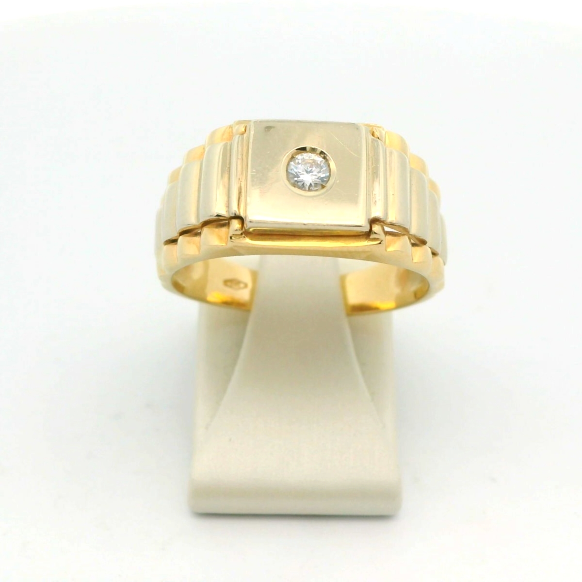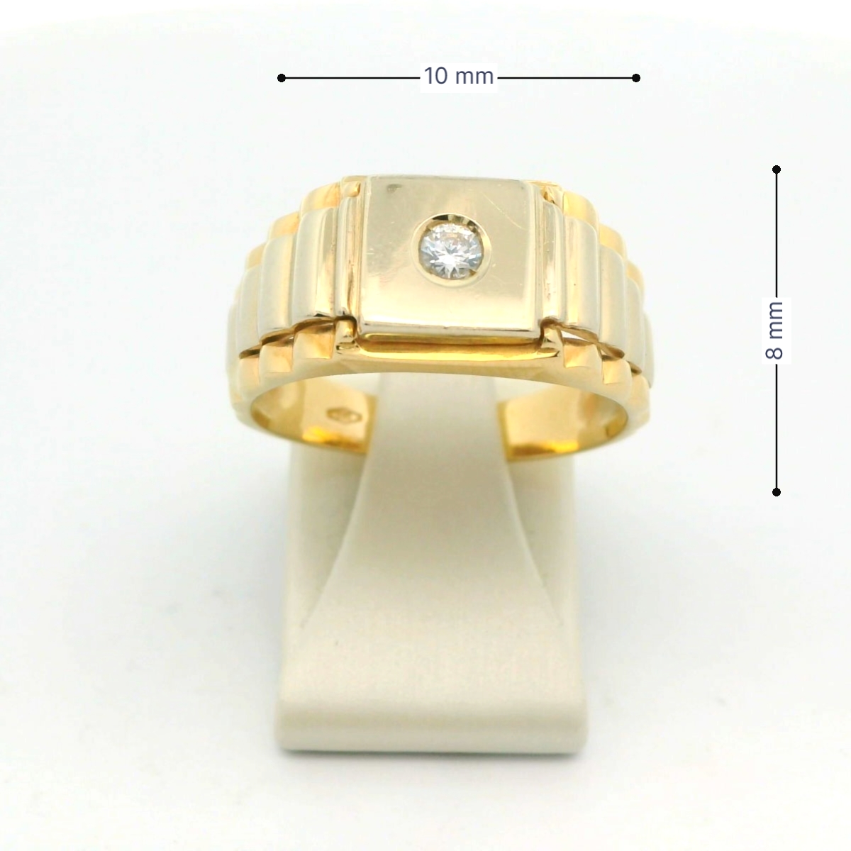 Deze ring van Louis Bros is vervaardigd uit 14 karaat bicolor (8.66 gr.). Deze luxe zegelring voor heren is gemaakt van 14 karaat bicolor goud en prachtig bezet met zirkonia stenen. De ring is van hoge kwaliteit en heeft een stijlvol en tijdloos ontwerp. Draag deze ring solo aan je pink voor een klassieke uitstraling, of combineer hem met andere gouden sieraden voor een trendy look. Een echte eyecatcher voor elke man!