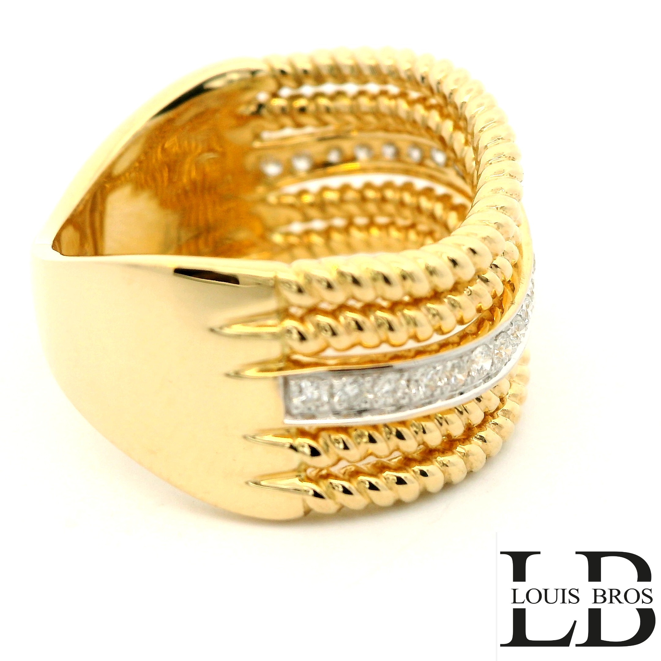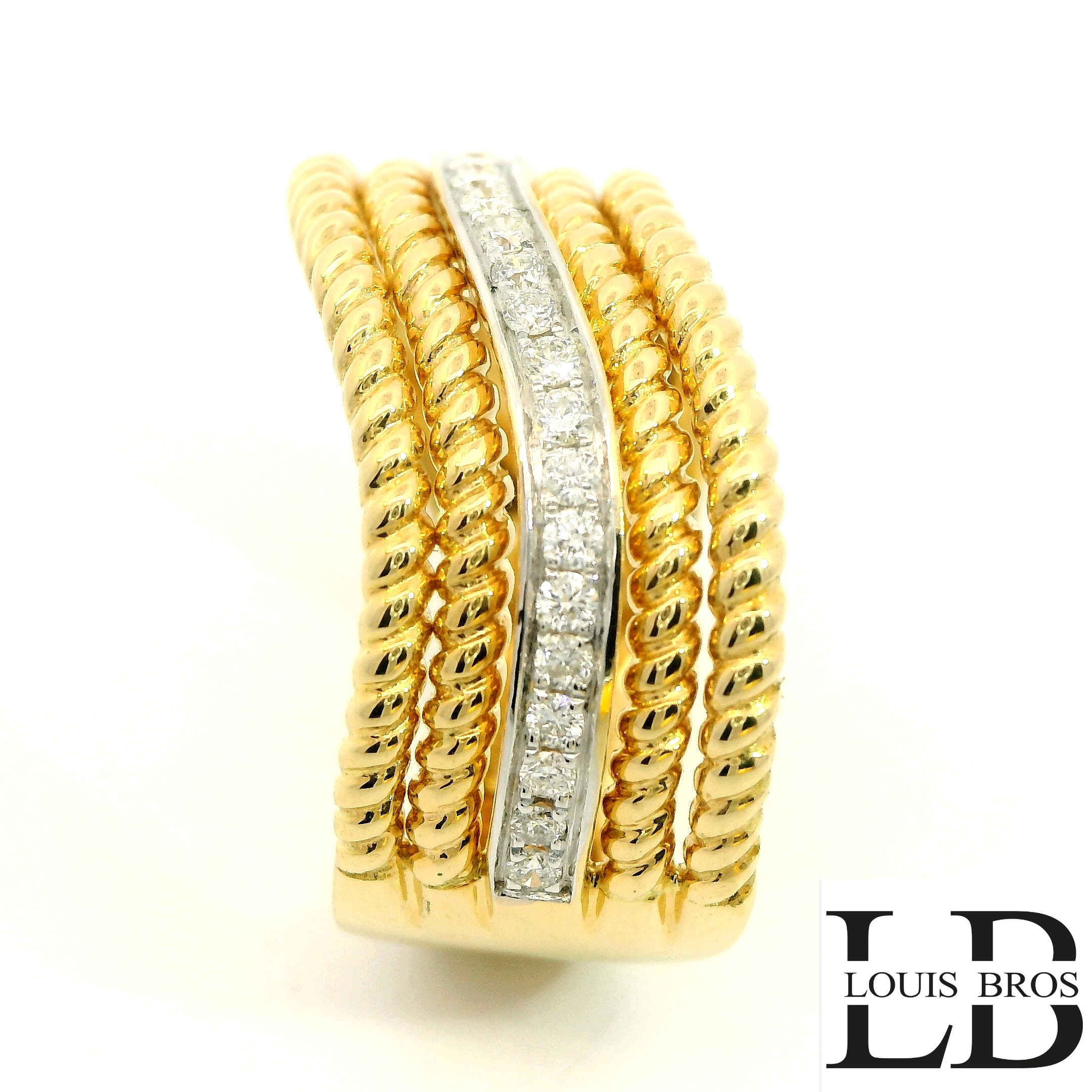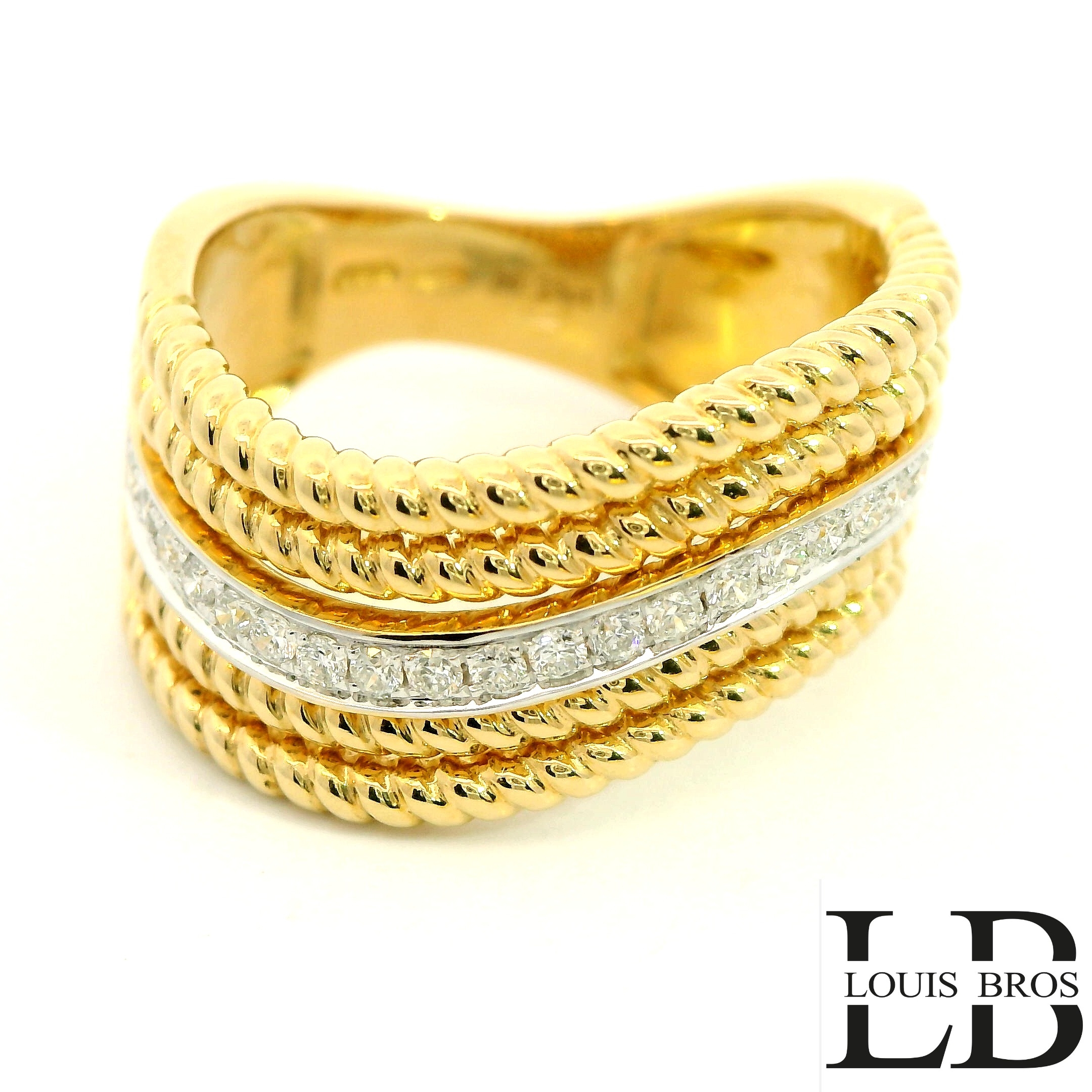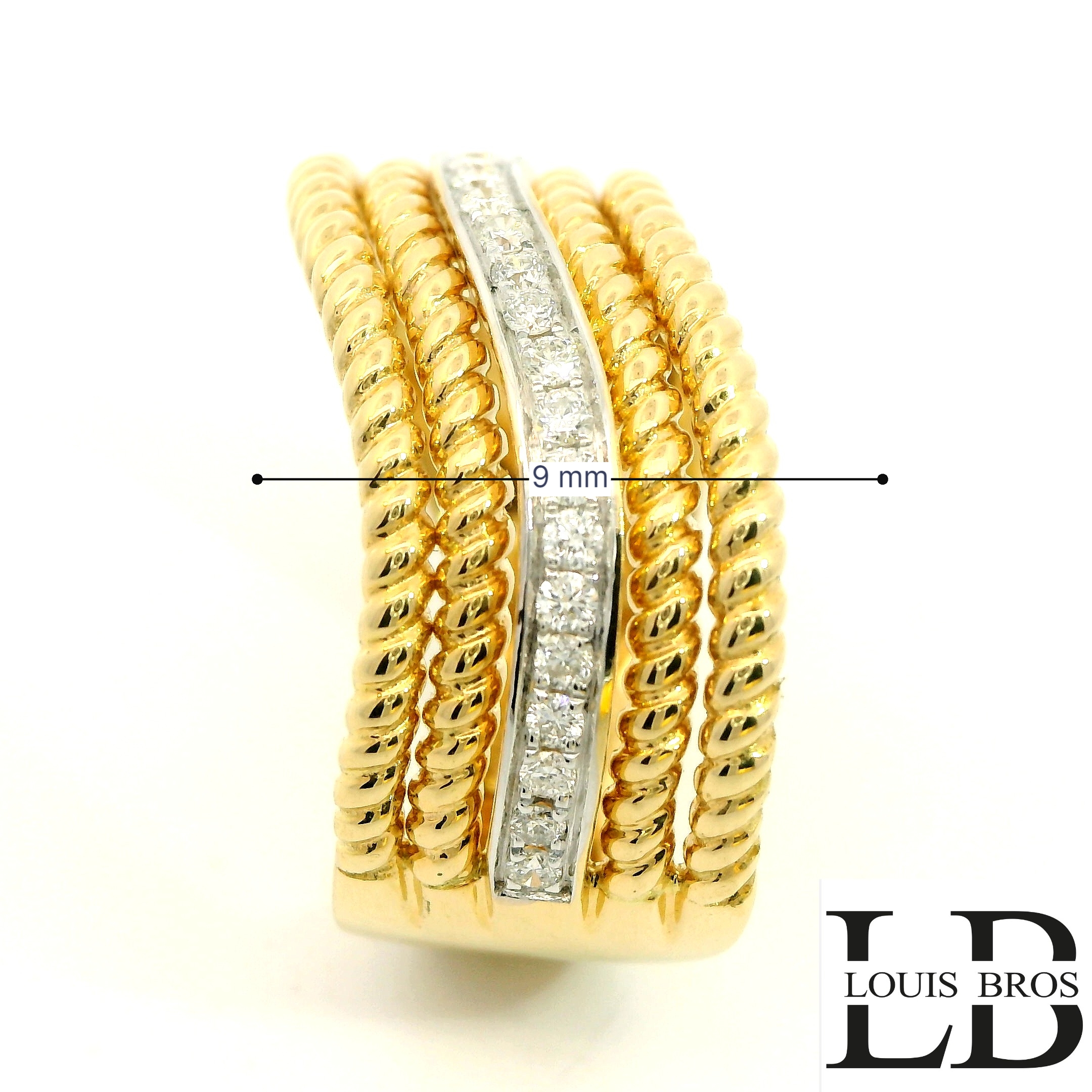 Deze prachtige bicolor gouden ring van 18 karaat (8.64 gr) combineert modern design met tijdloze elegantie. De ring is vervaardigd uit een harmonieuze combinatie van geelgoud en witgoud, wat zorgt voor een verfijnd contrast en een luxe uitstraling. In het midden schittert een fijne rij briljant geslepen diamanten, subtiel maar krachtig, die het ontwerp naar een hoger niveau tillen.